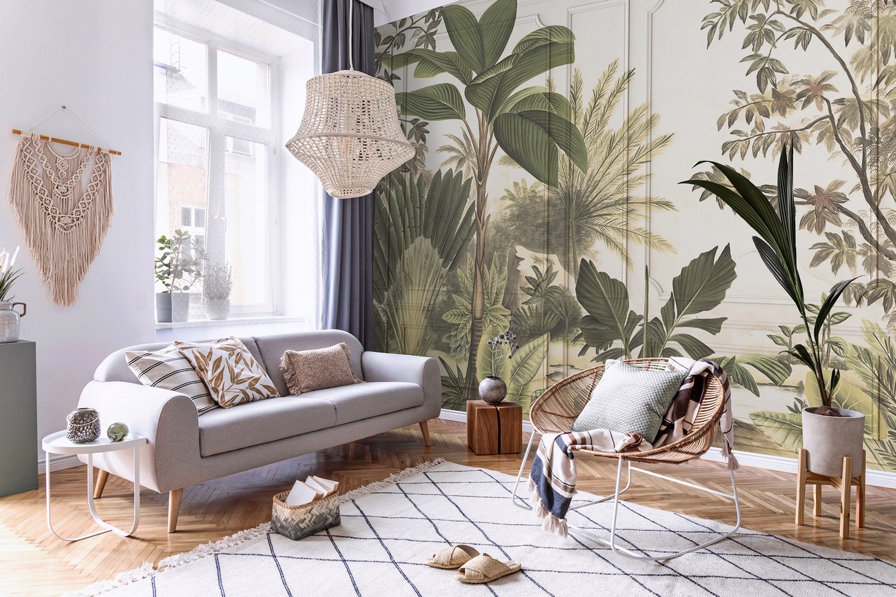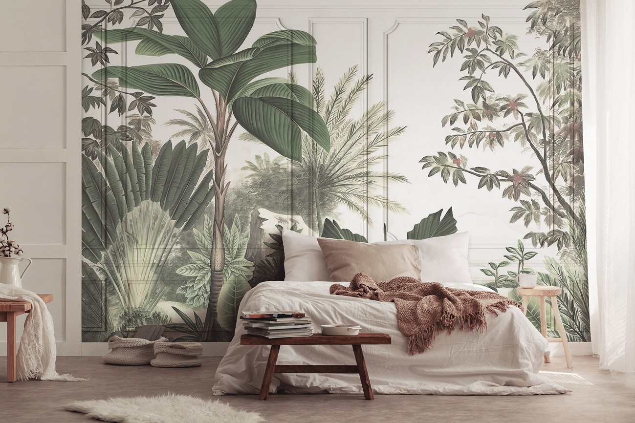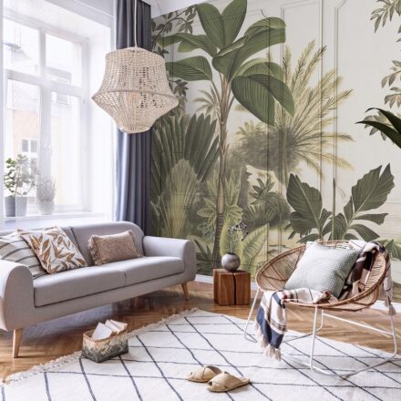 Modern fotótapéta dzsungel mintával, melynek egyedisége, hogy a tapéta mintája fali paneleket ábrázol, melyen végigfutnak a dús egzotikus növények. Trendi fotótapéta, mely modern formában jeleníti meg az egzotikus dzsungel tematikát.