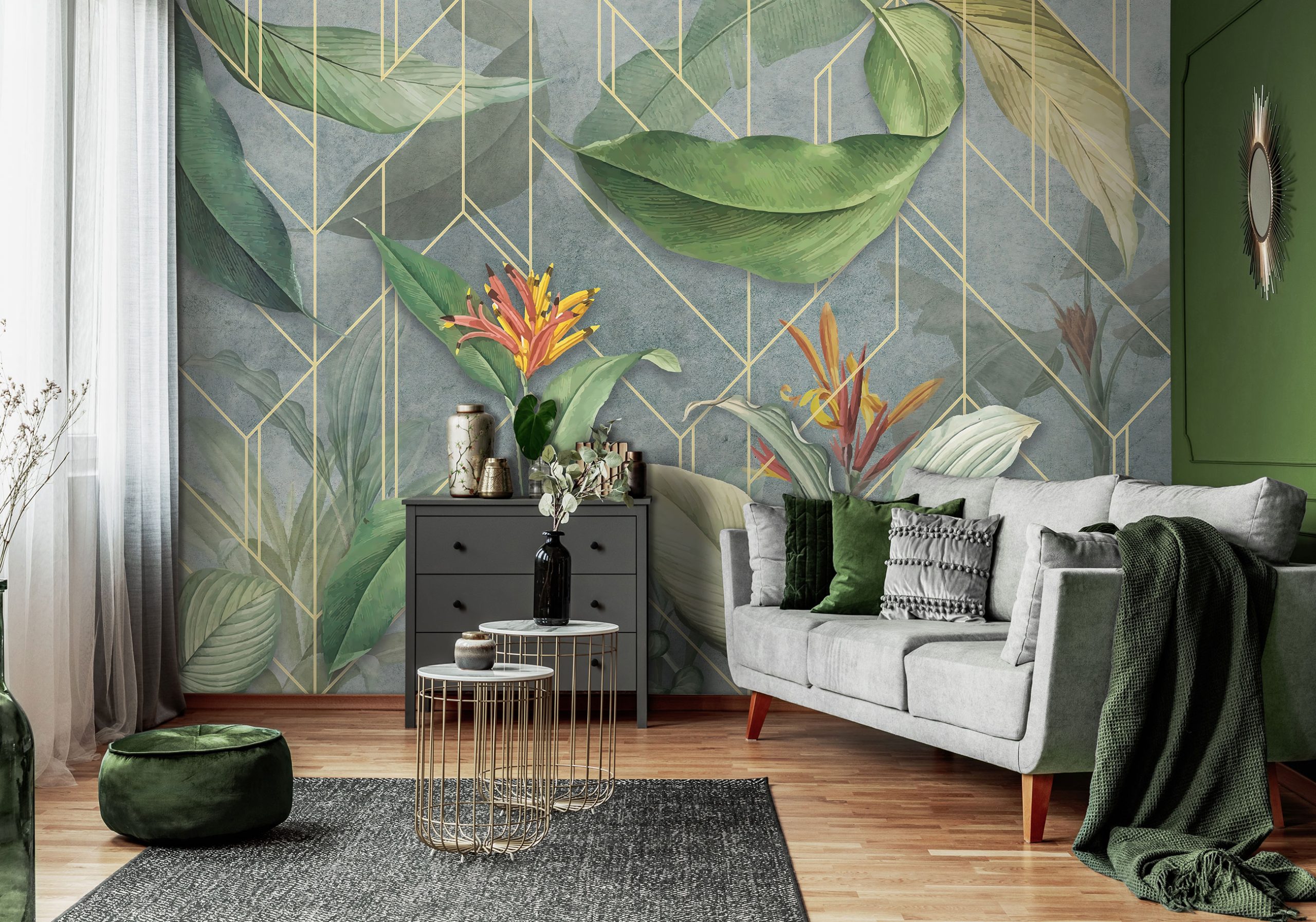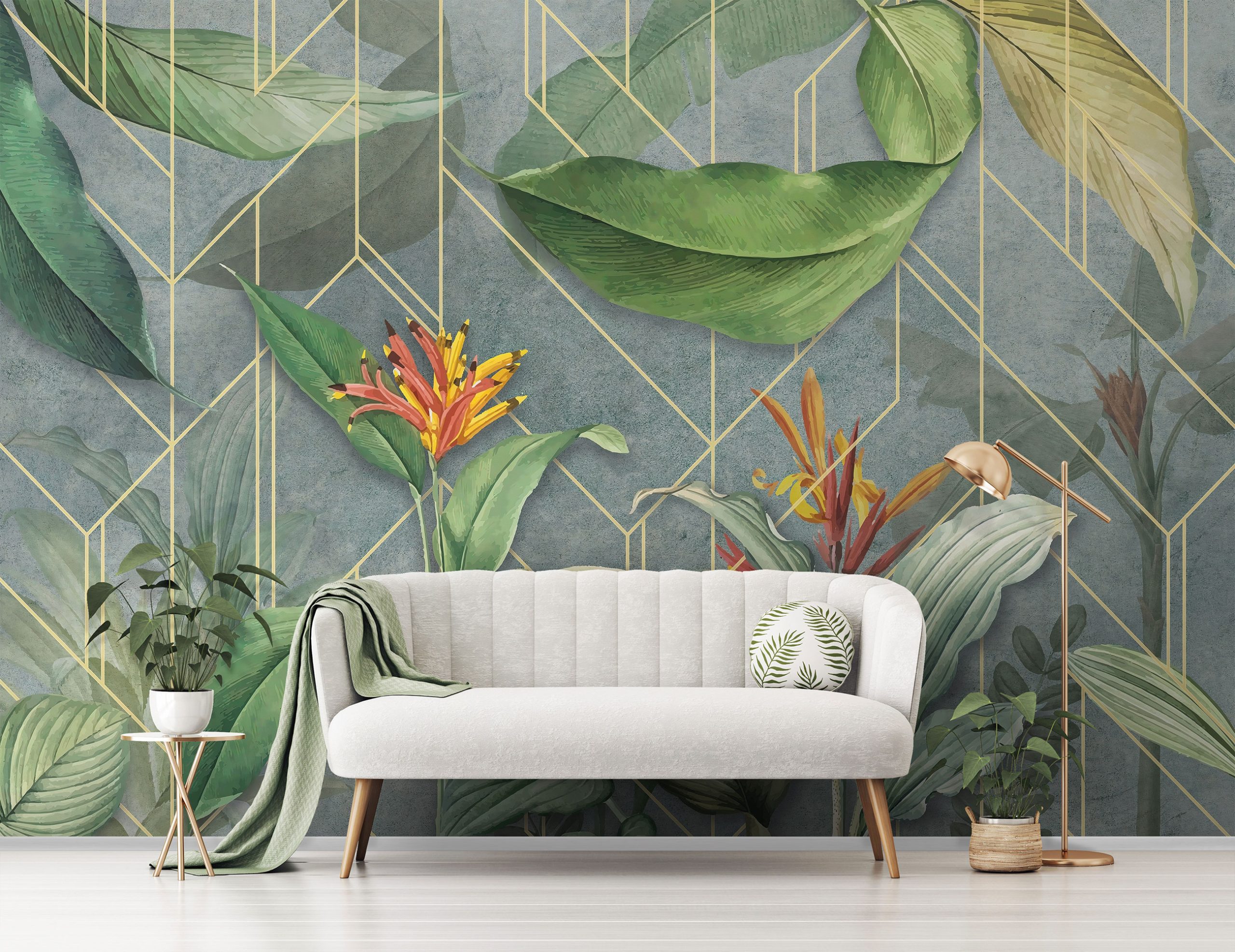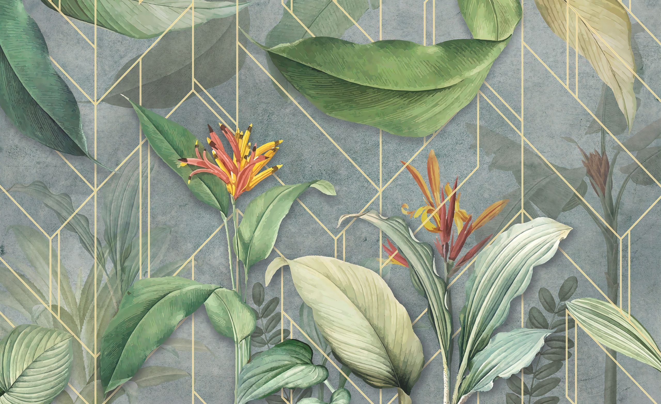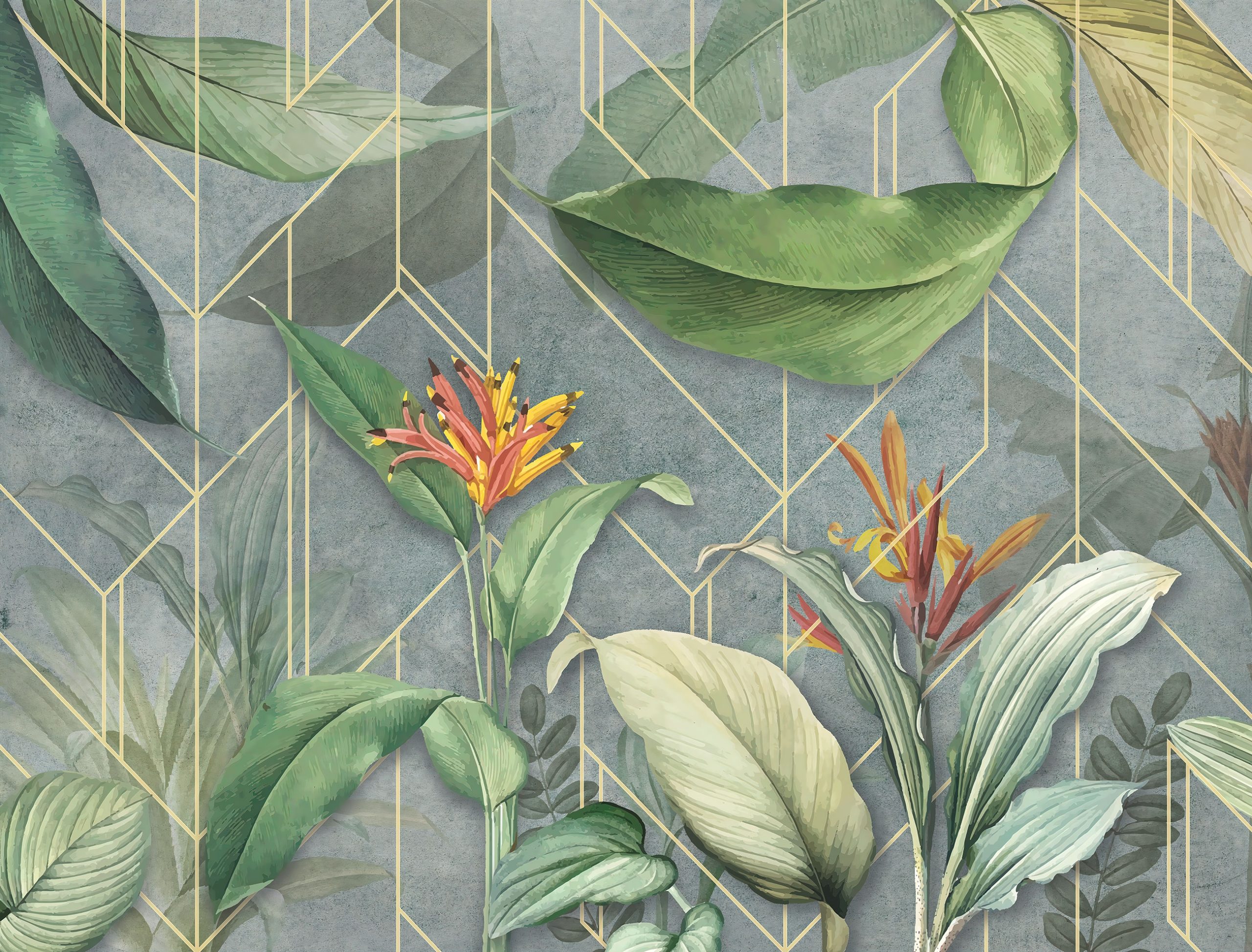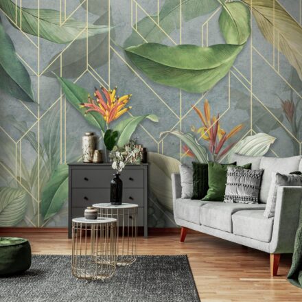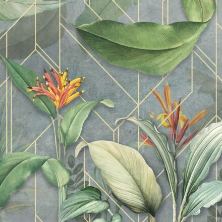 Trendi fotótapéta kompozíció, melyen a geometriai forma kombinálódik egzotikus növény mintával. A virágok élénk színe és a levelek természetes zöldje izgalmas kontrasztot képez a háttérben megjelenő geometrikus formával.