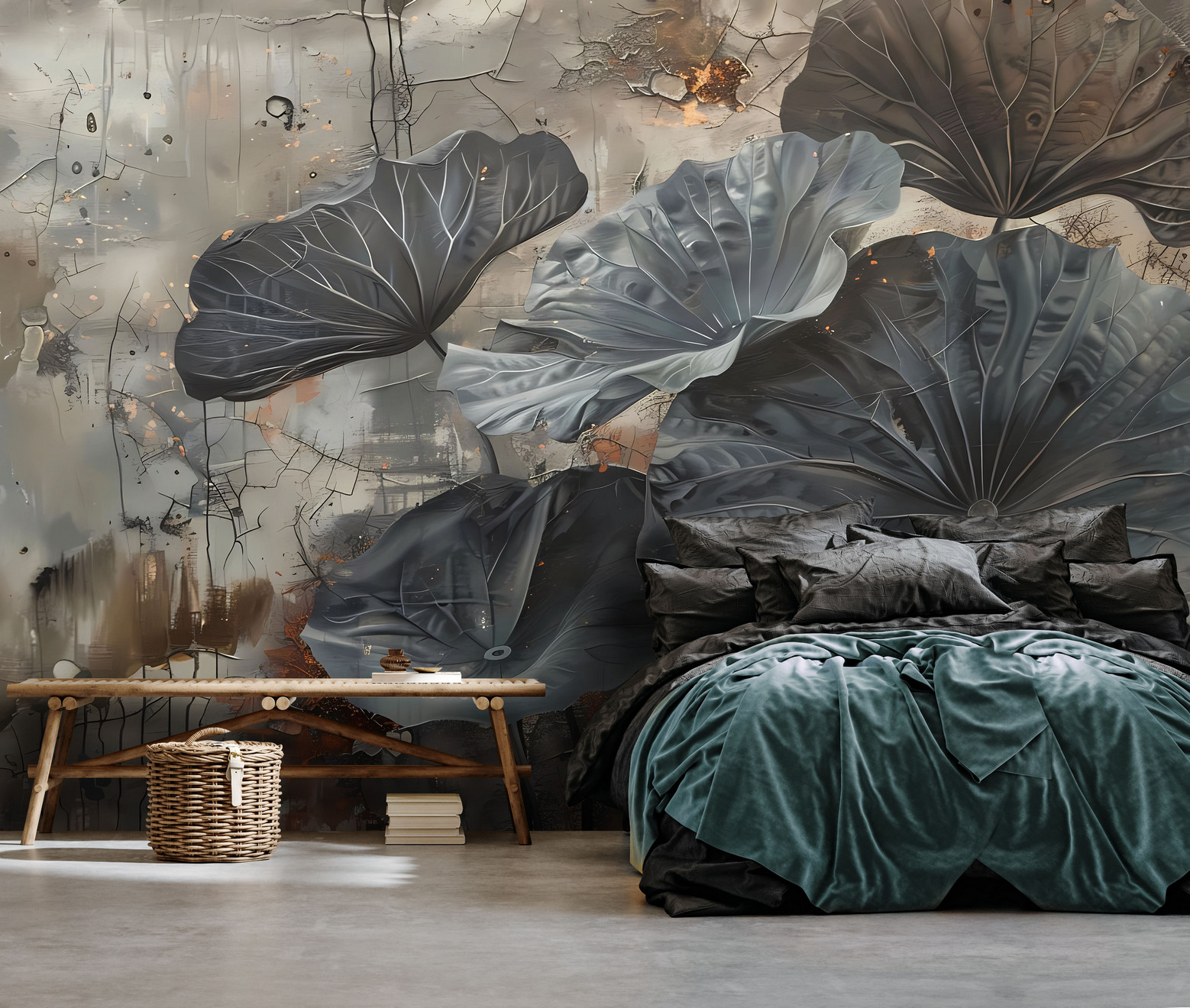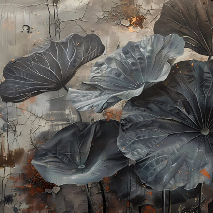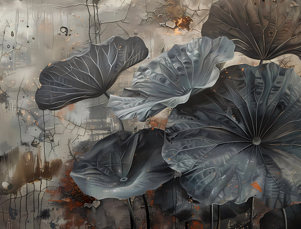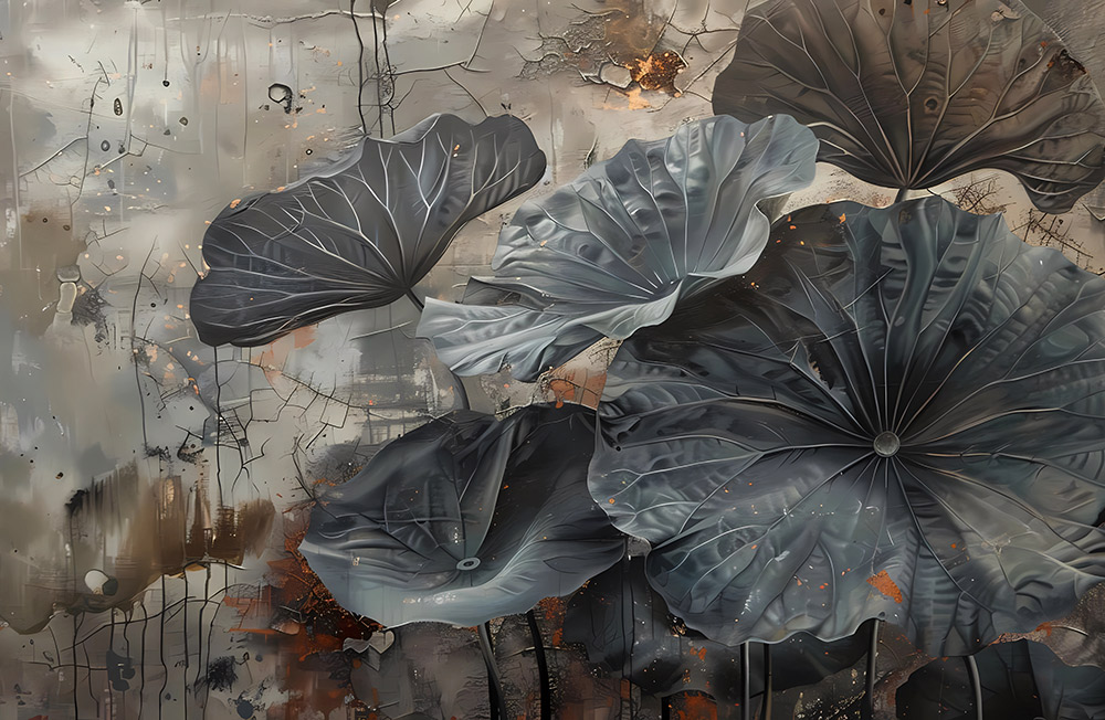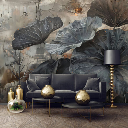Modern fotótapéta látványos tavirózsa levelekkel – egy különleges design, amely természetközeli hangulatot és elegáns drámaiságot visz az enteriőrbe. A részletgazdagon megformált, monumentális levelek és a finom földszínek tökéletes harmóniát teremtenek, így ez a tapéta igazi művészi központi eleme lehet nappaliknak, hálószobáknak vagy akár modern irodai tereknek is.