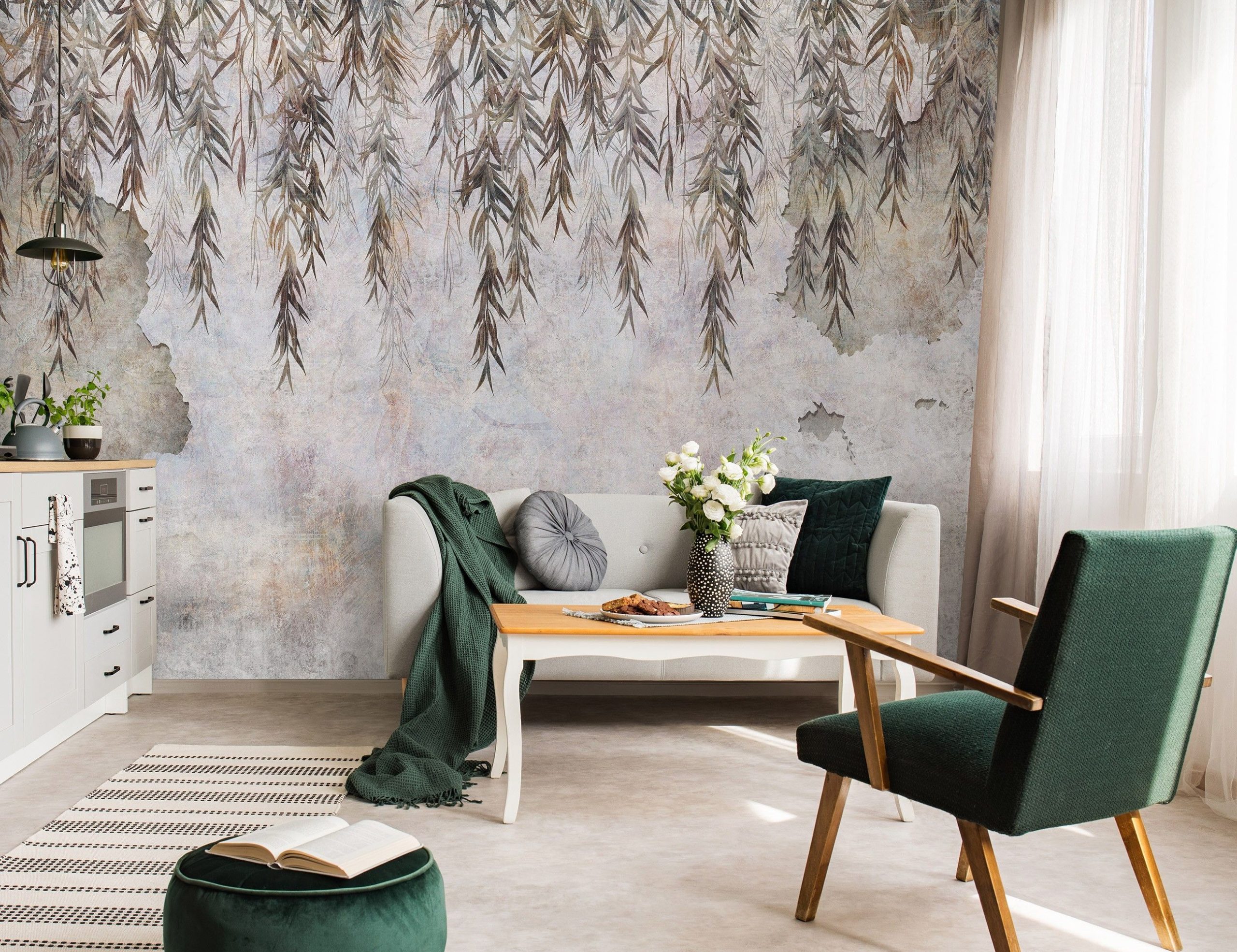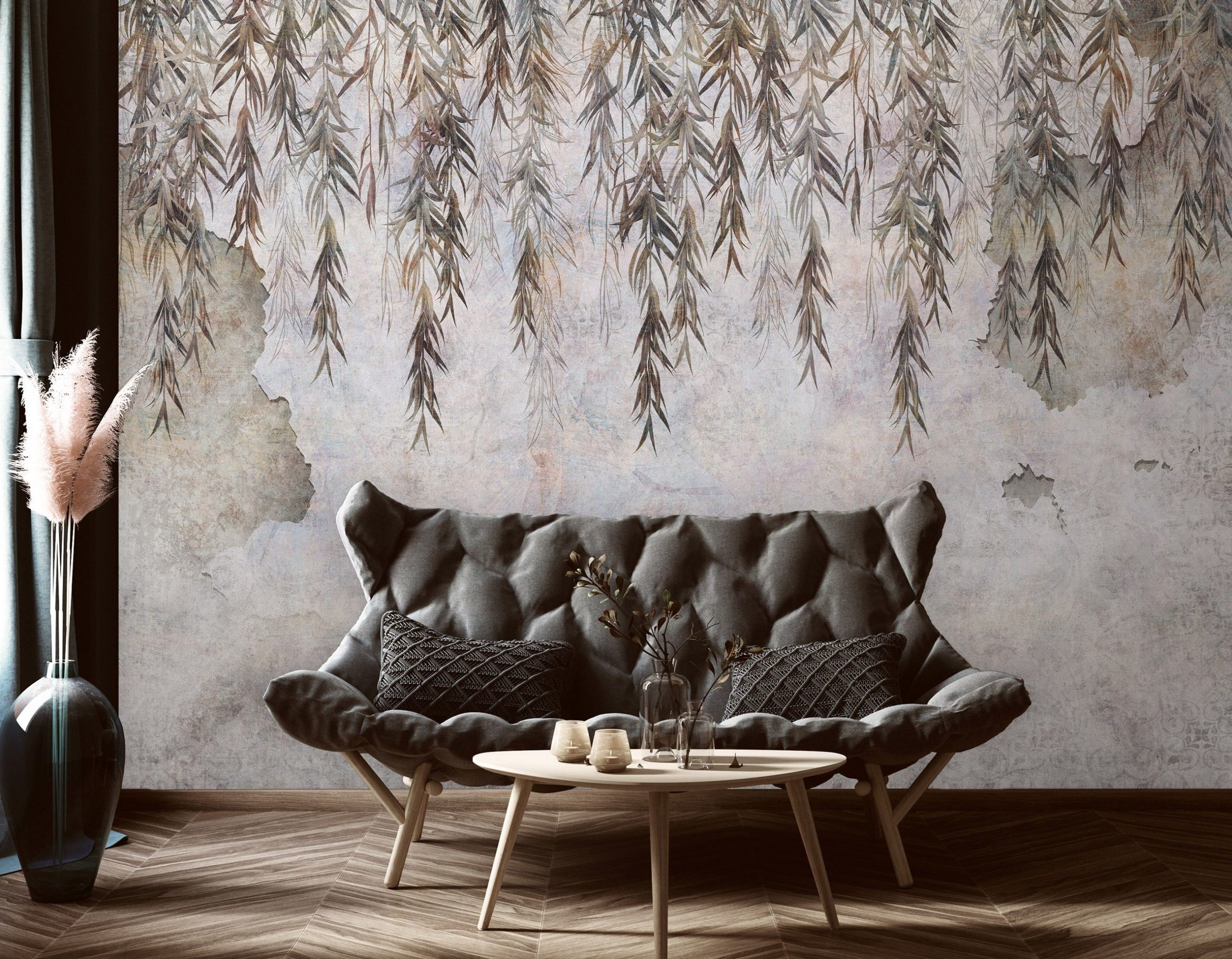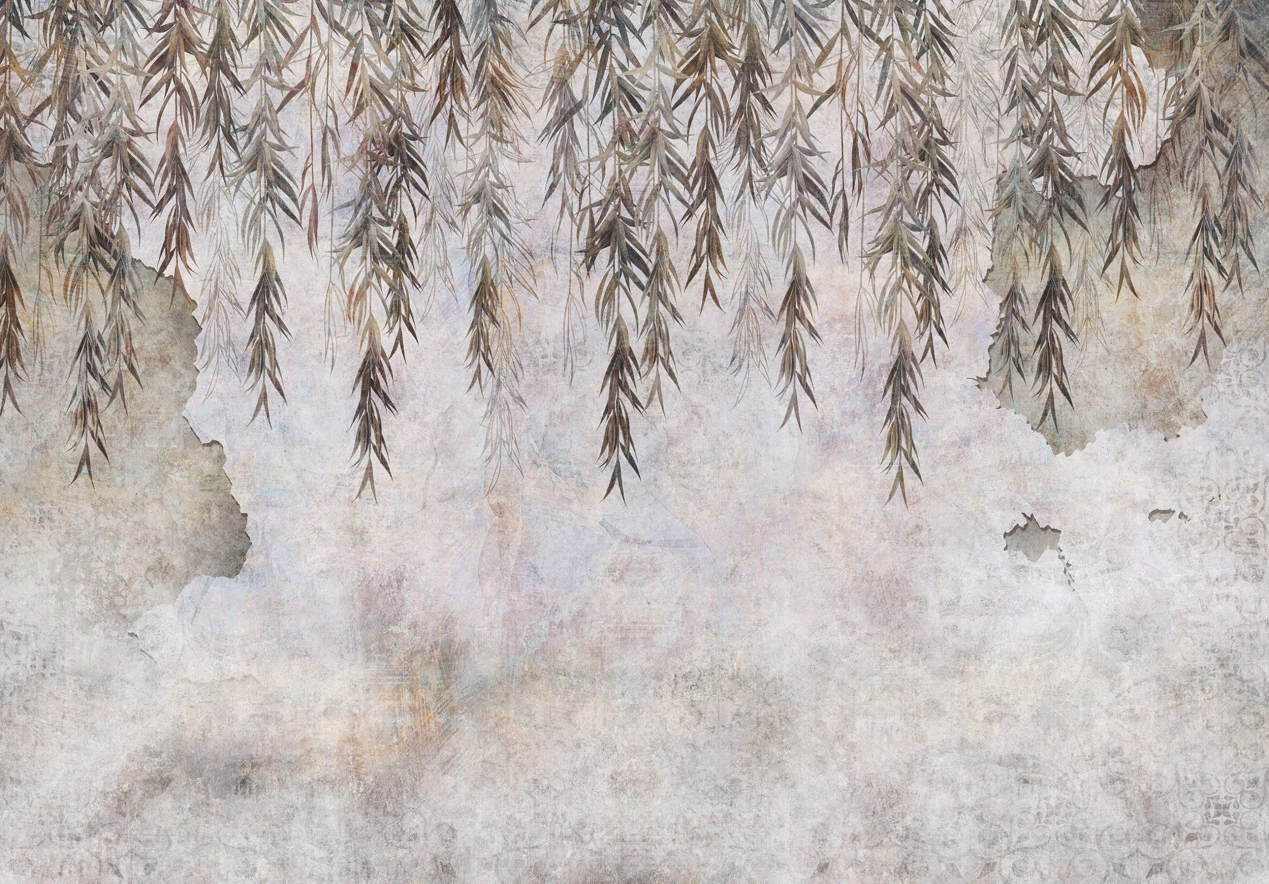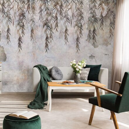 Modern fotótapéta lecsüngő levélfüzérrel, melynek egyedi formát kölcsönöz az antik falat imitáló fotóalap.