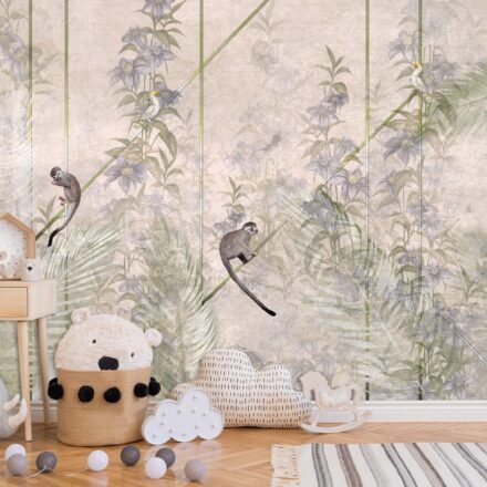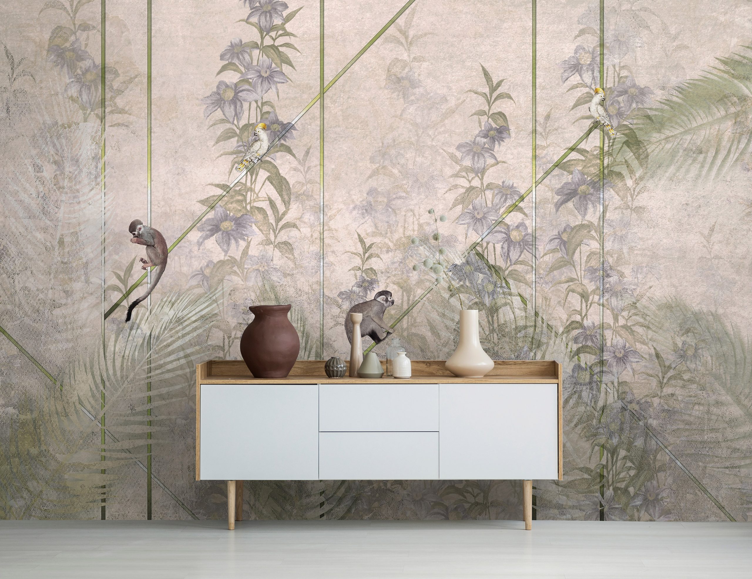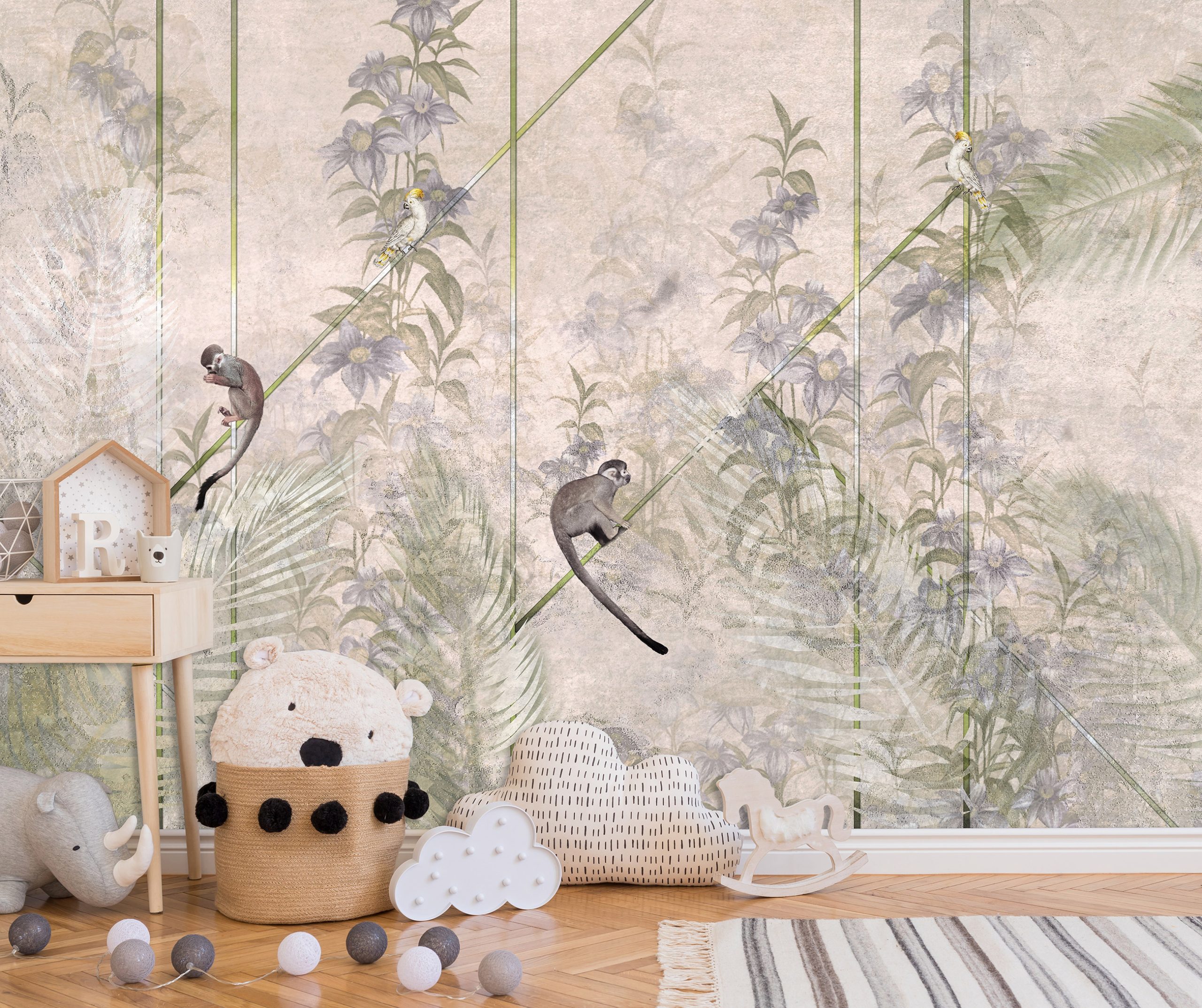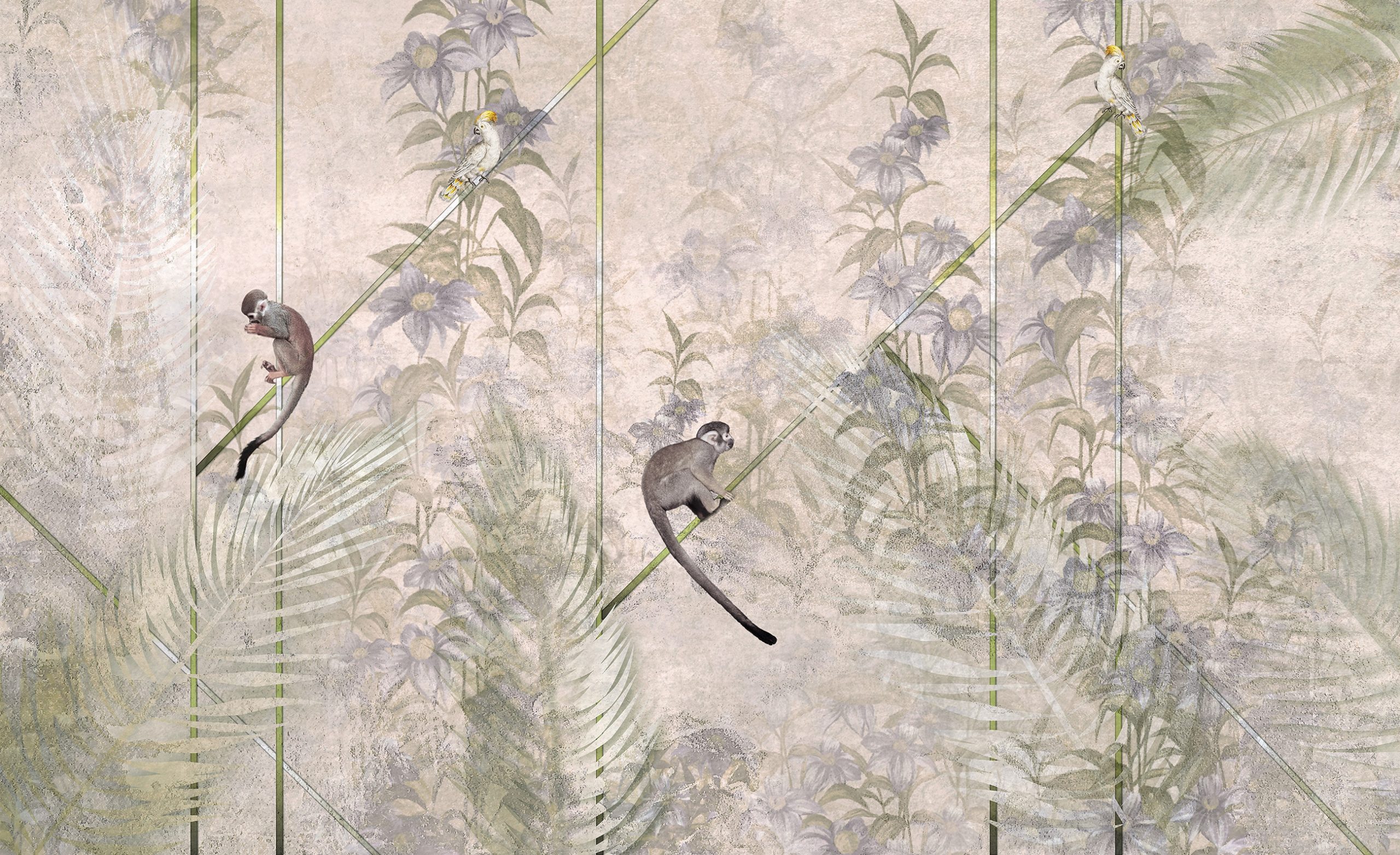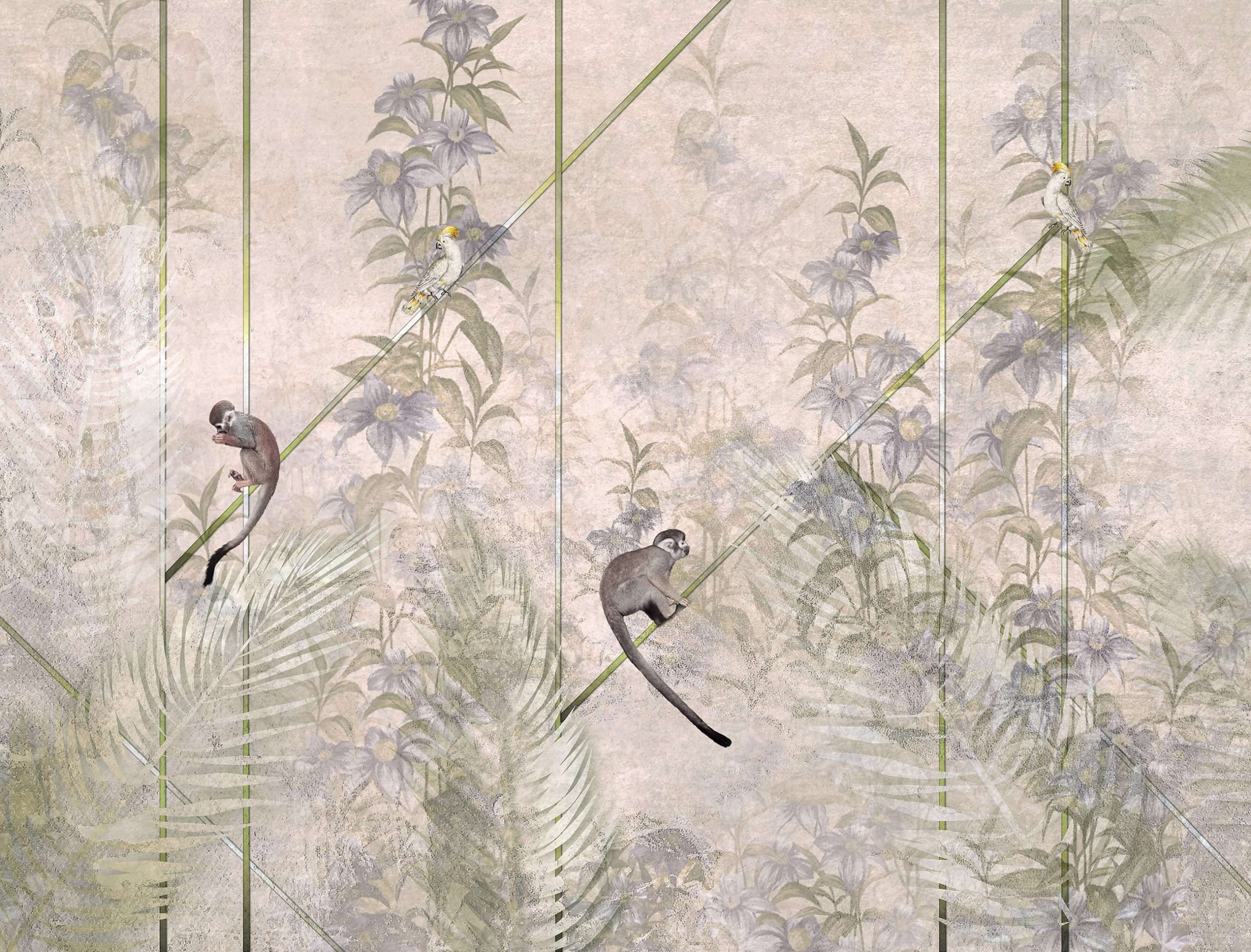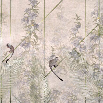 Modern fotótapéta papagáj és majom mintával, melynek különleges eleganciáját a geometriai formák és az egzotikus elemek izgalmas kompozíciója adja.