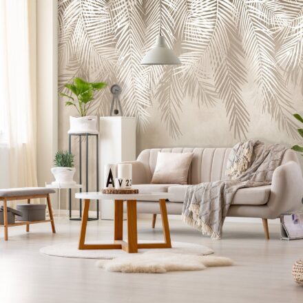 Modern pálmalevél mintás fotótapéta, melynek trendi mintája remekül mutat ágy vagy kanapé mögött.