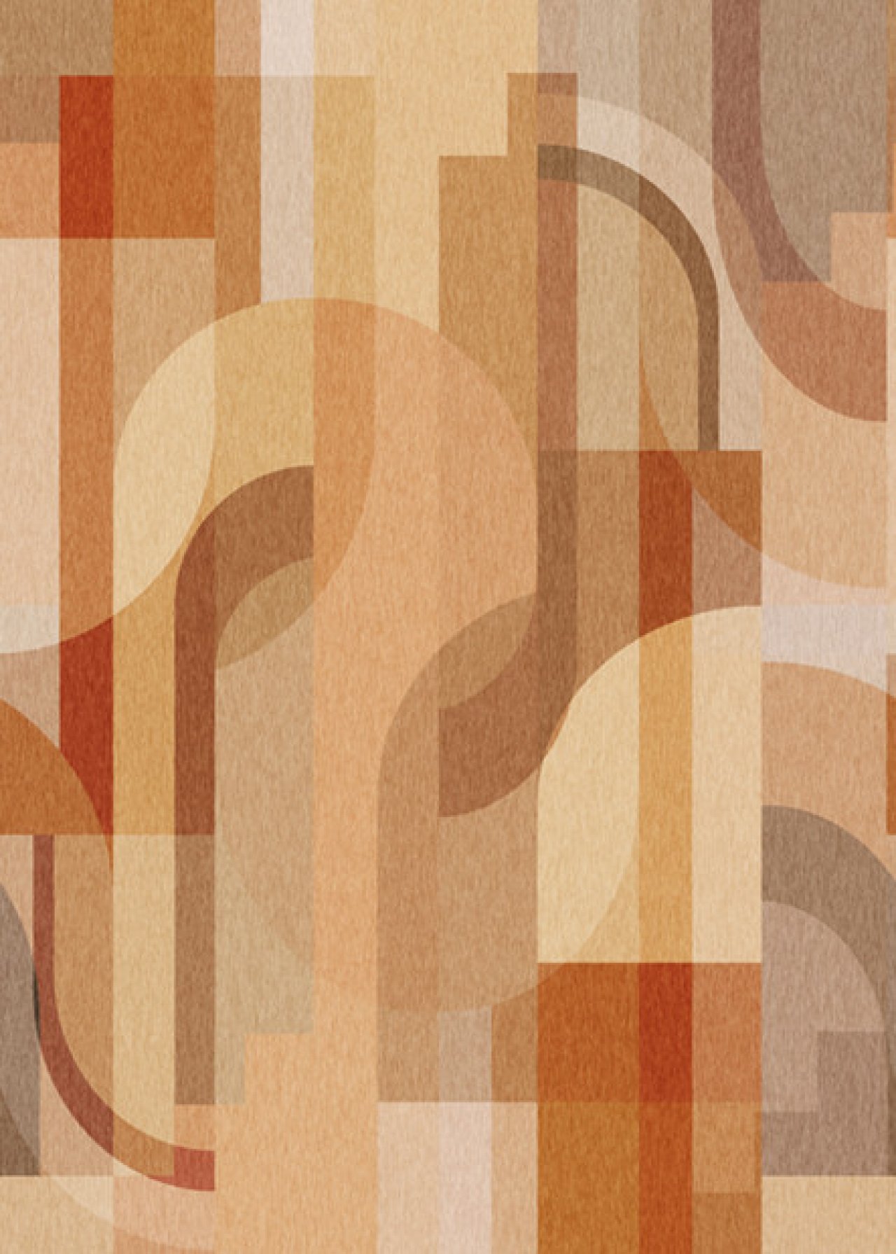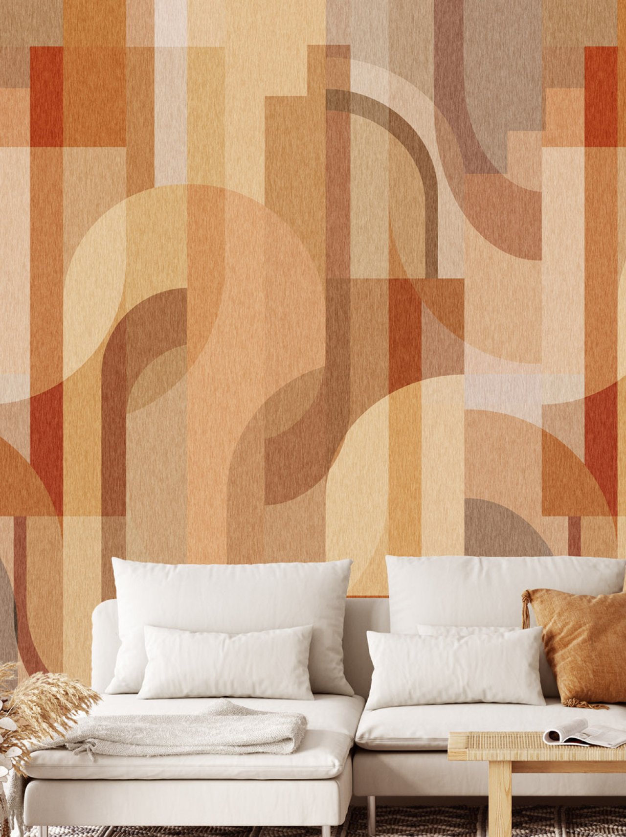 Modern vlies fotótapéta terrakotta – narancs geometriai formákkal, melyek otthonos melegséget teremtenek az enteriőrben. A félköríves minták kombinálása a szövet imitációkkal otthonos melegséget áraszt, miközben trendi falidekorációt teremt.