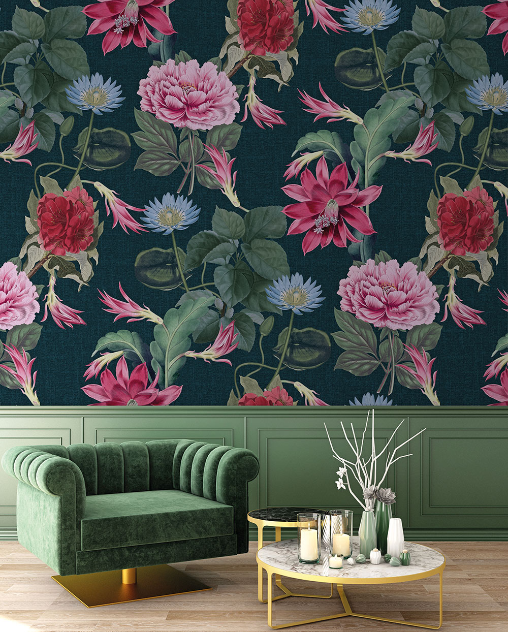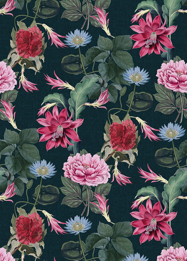 Extravagáns fotótapéta nagyméretű virágokkal, melyek élénk rózsaszín árnyalata kiválik a fekete alapszínből. A fotótapéta sajátossága, hogy egymás mellé sorolható, így a minta illesztődik, és nagy felület tapétázására is alkalmas.