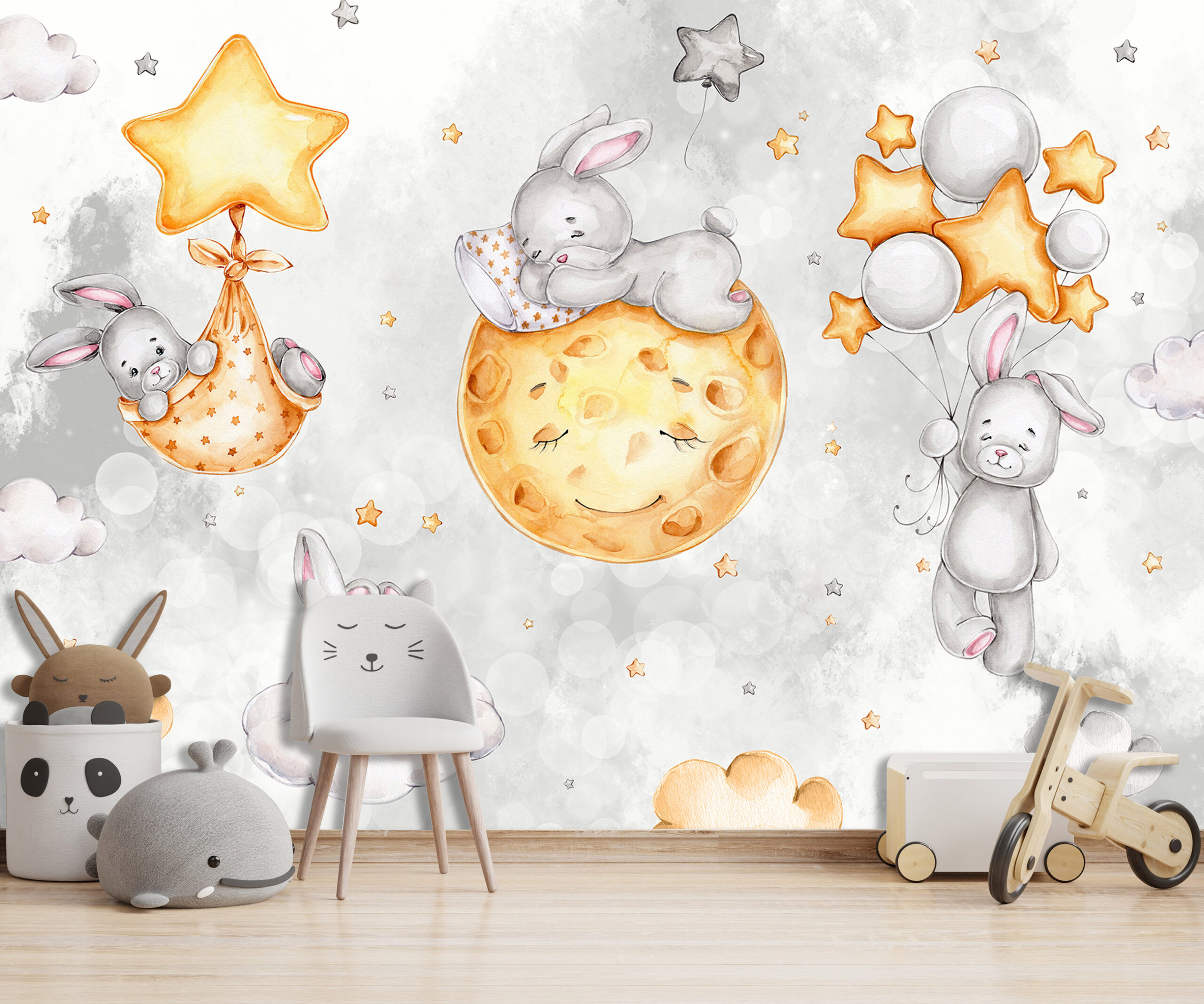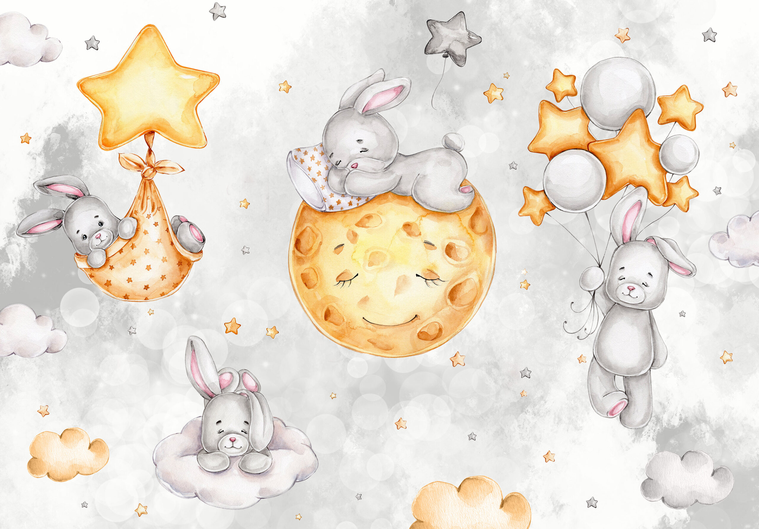 Boldog álmokat ígér a nyuszis fotótapéta, melyet kifejezetten babaszobák dekorálására ajánlunk.