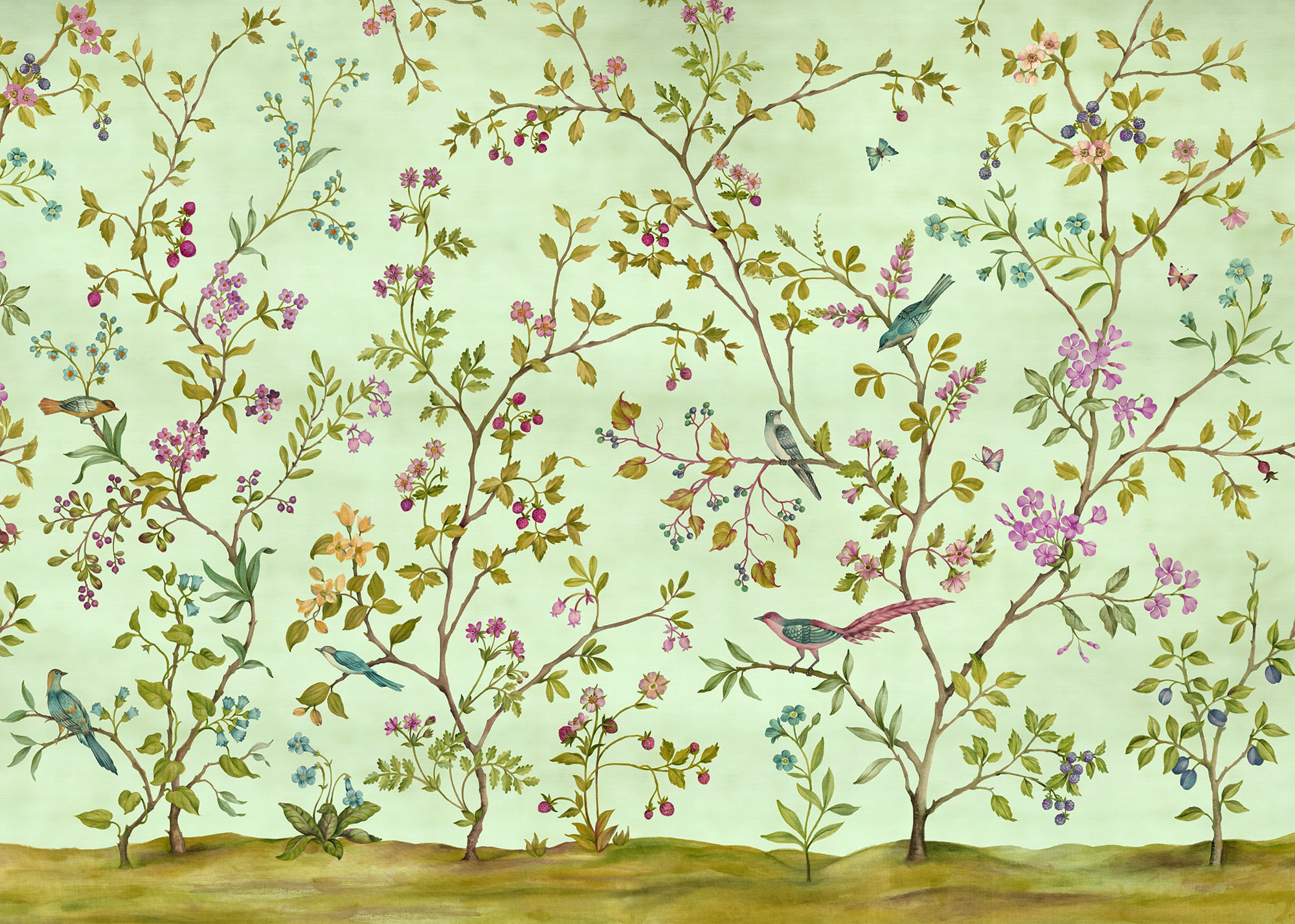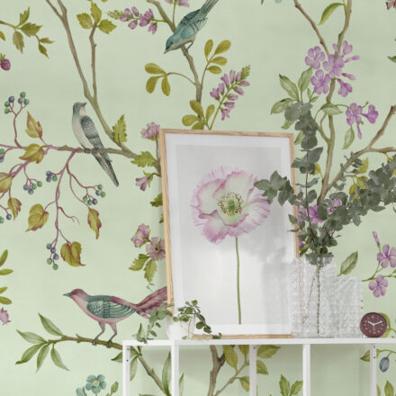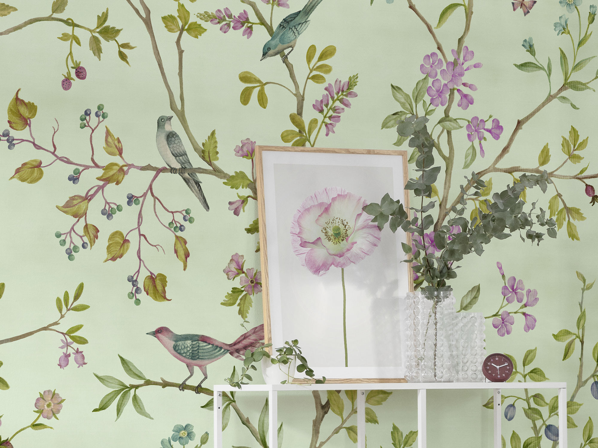 Részletgazdag fotótapéta keleties stílusú indákkal és madarakkal. Fantasztikus virágminta, mely fiatalos atmoszférát teremt az entriőrben.