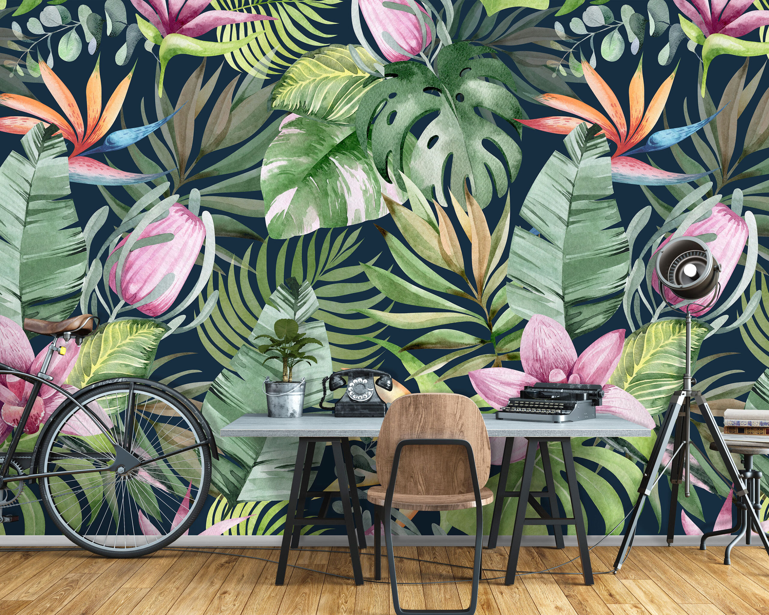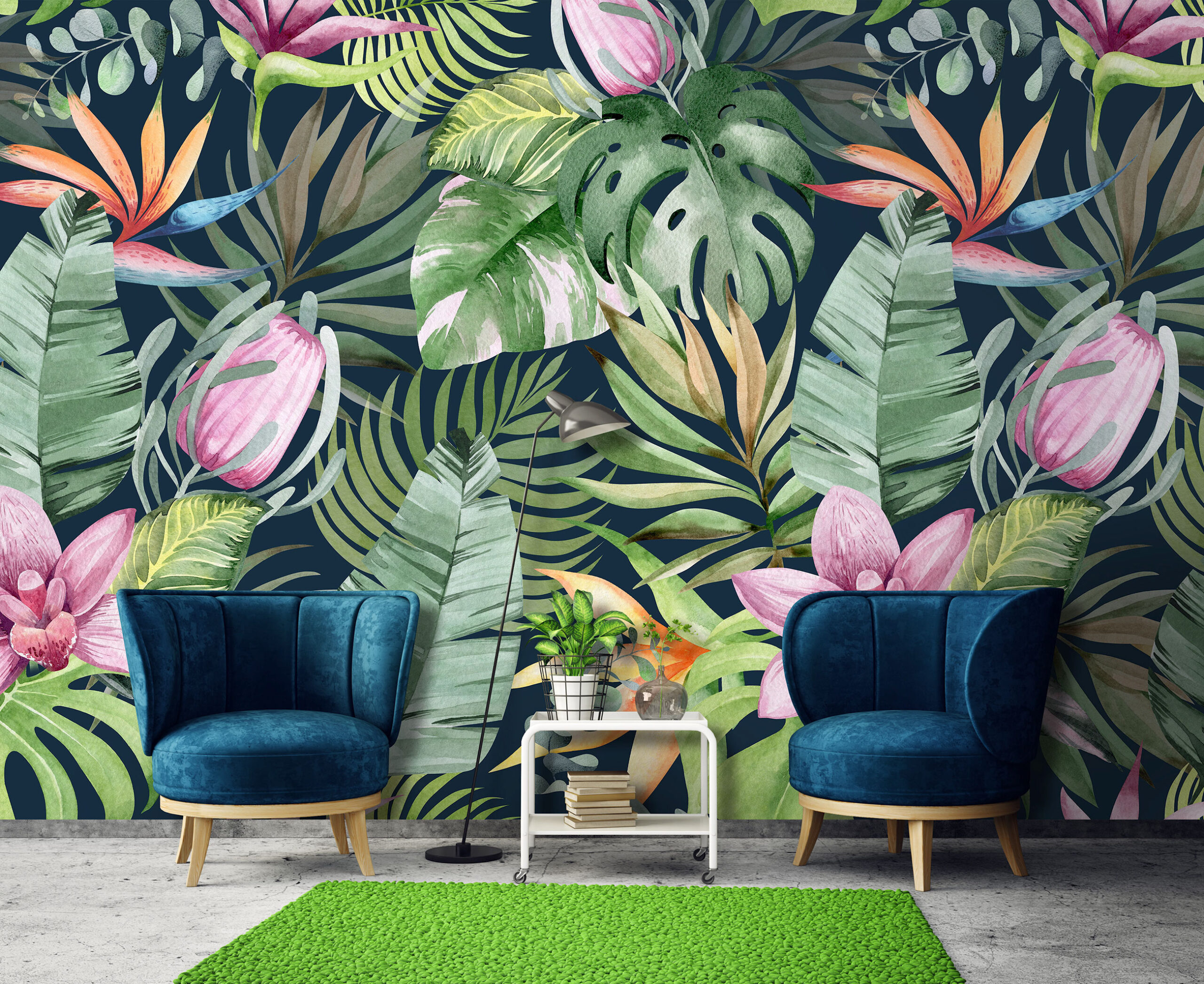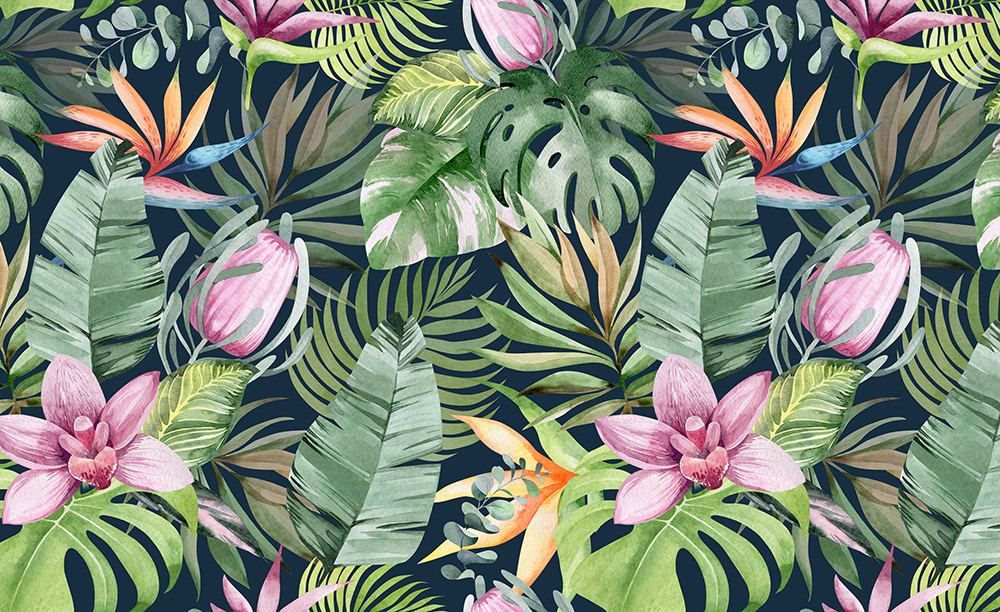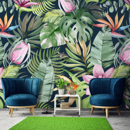 Óriás fotótapéta egzotikus botanikai mintával, melynek színes virágai és levelei feldobják az enteriőr hangulatát.