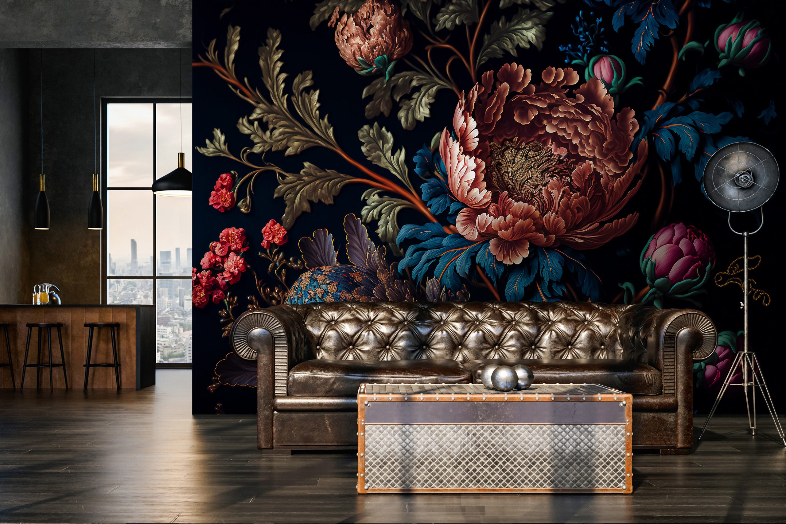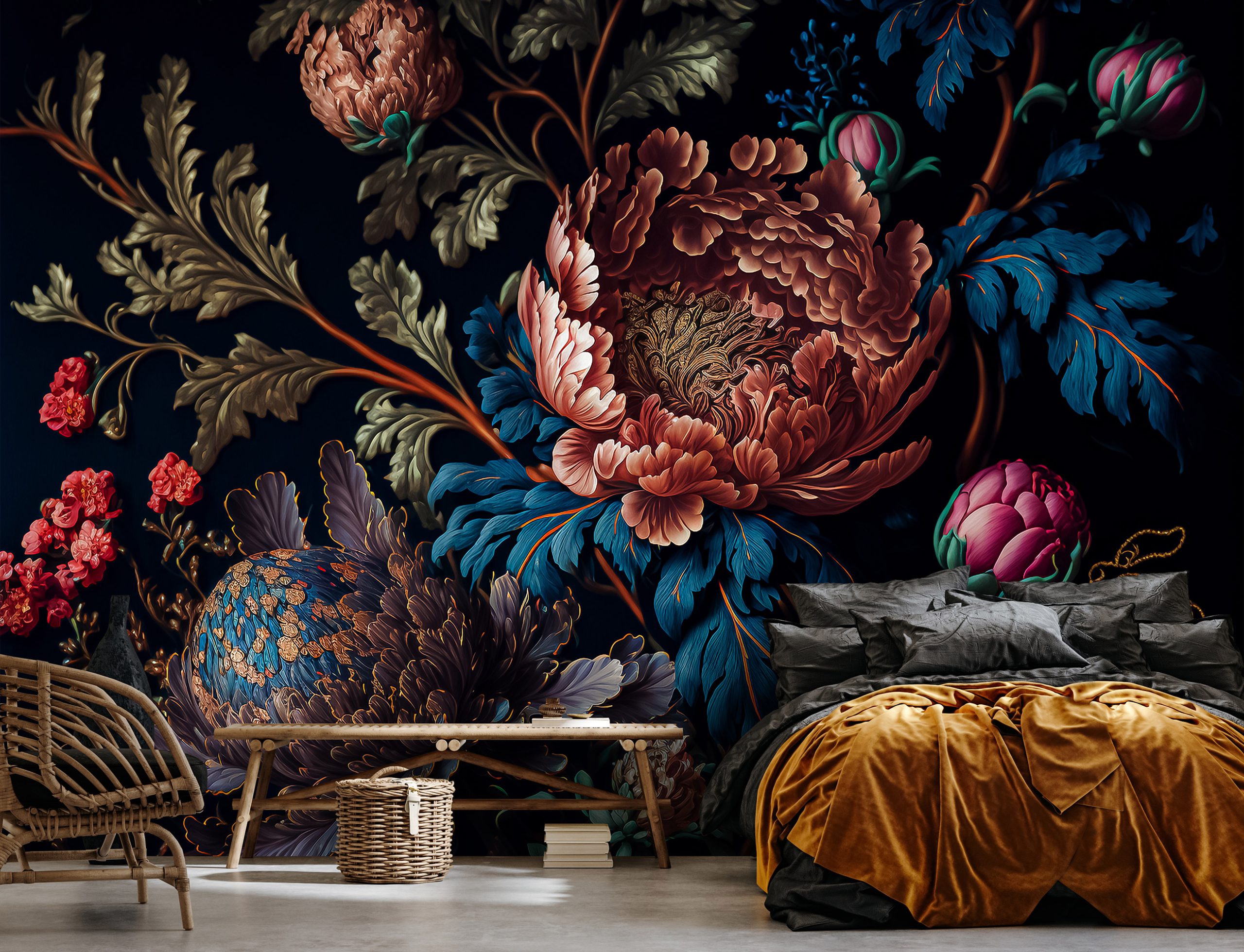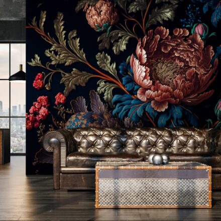 Drámai hatást kelt a falon a sötét alapon megjelenő klasszikus virág motívum. Különleges szépsége átformálja a teret, és fekete alapjának köszönhetően 3 dimenziós hatást kelt.