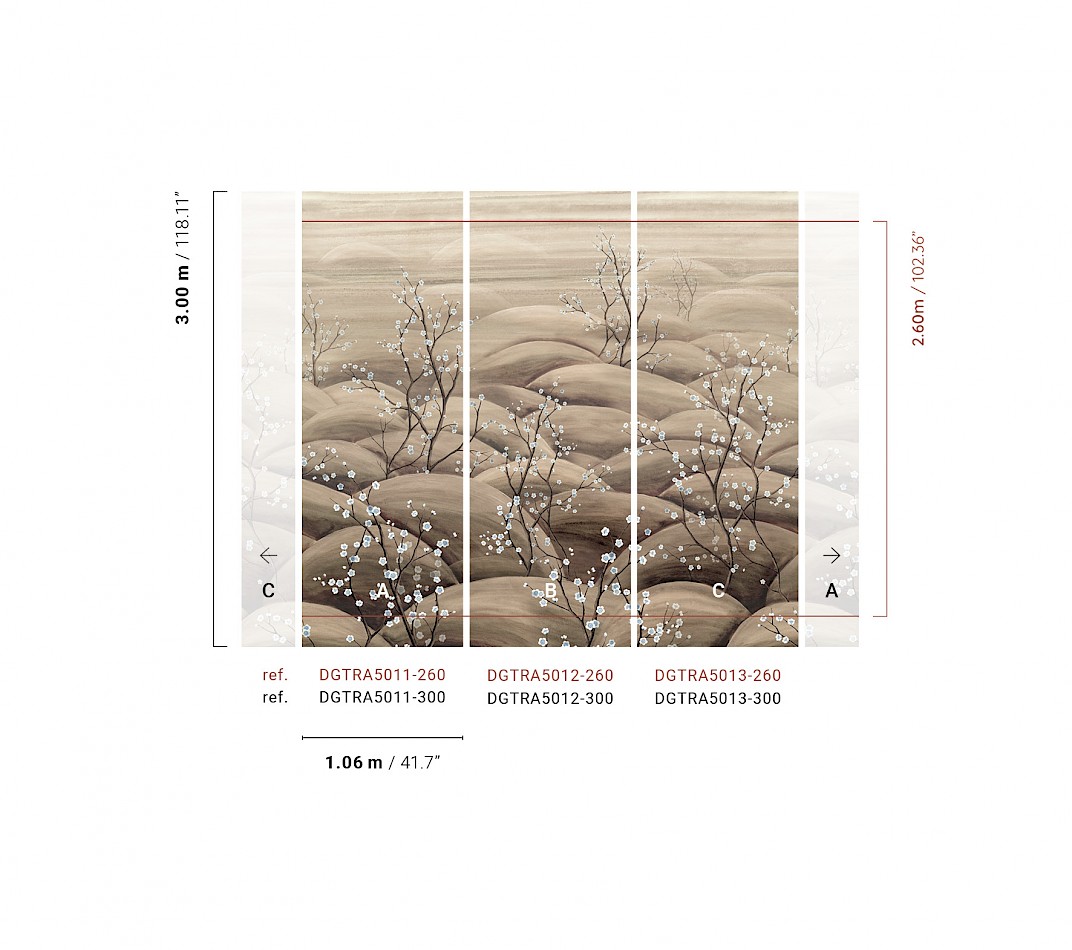 Az orientális Khroma fotótapéta finoman rétegződő, lekerekített dombokkal és légies virágágakkal teremti meg azt a csendes, harmonikus világot, amelyben az otthon valódi menedékké válik. A lágy, akvarellszerű ecsetvonások és a természetes árnyalatok nyugalmat sugároznak, miközben a finom virágok apró kontrasztjai elegáns, japán ihletésű részletességgel töltik meg a kompozíciót.
