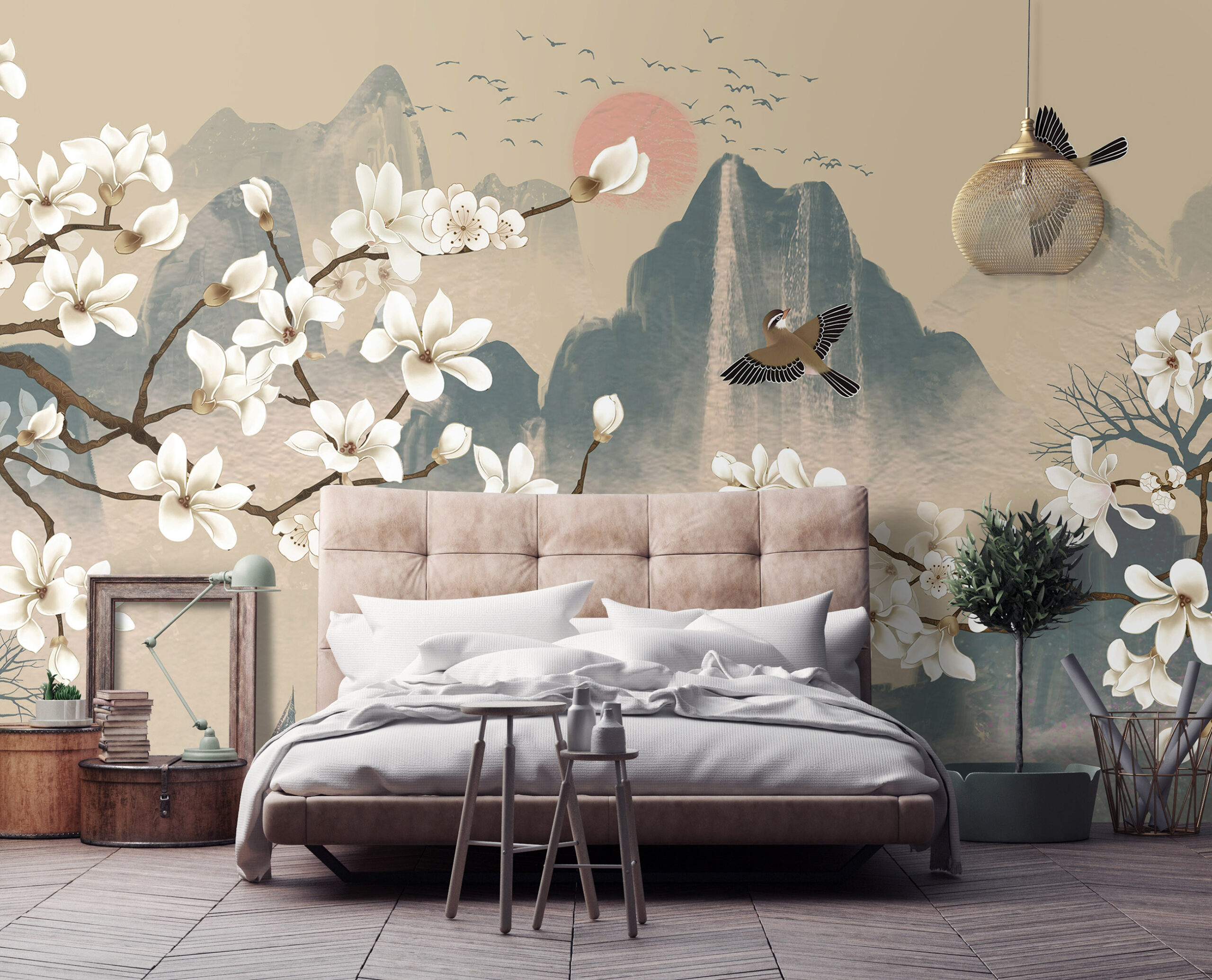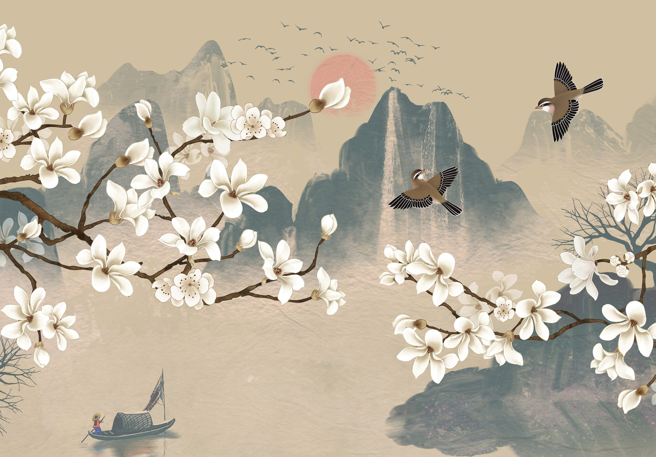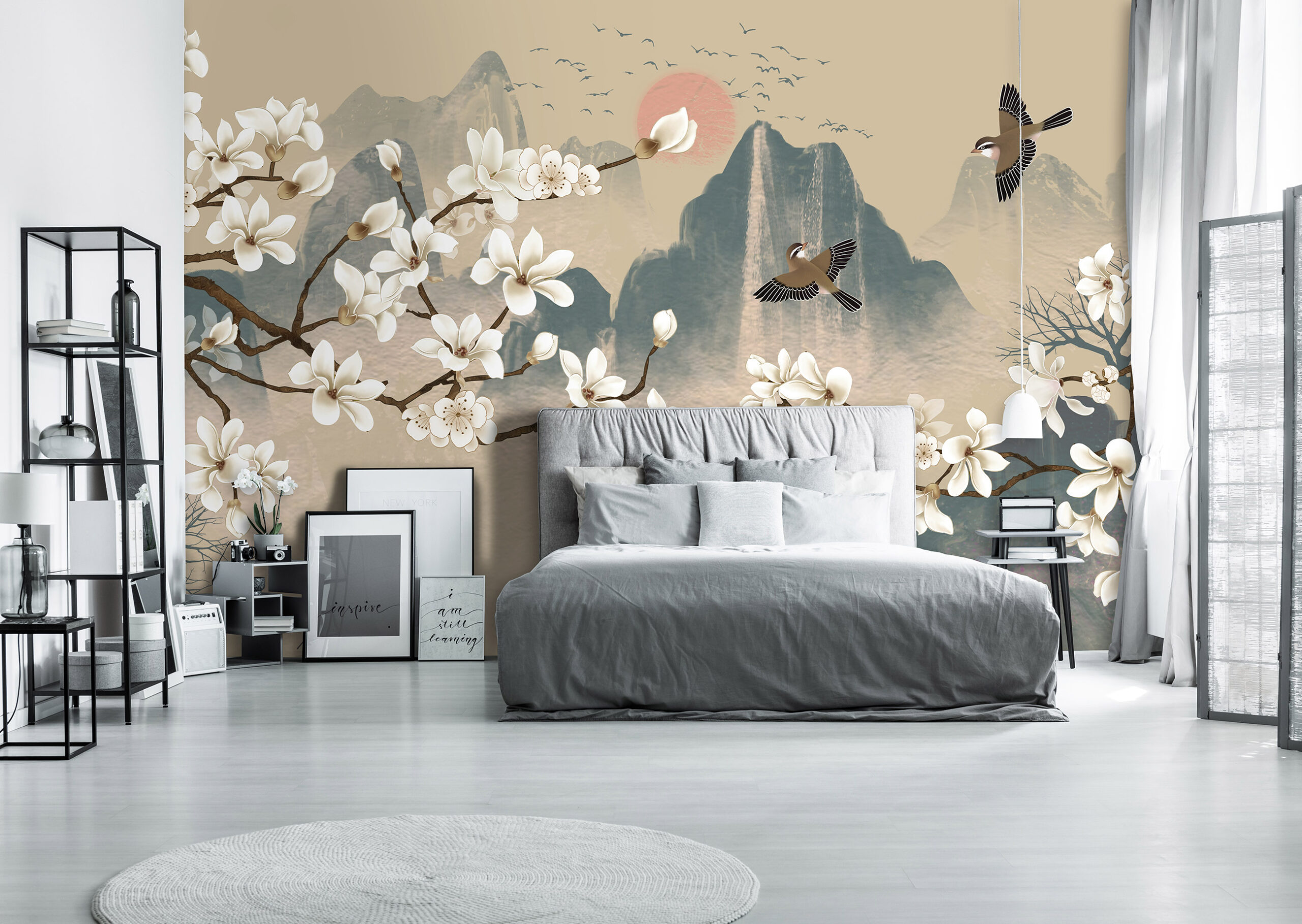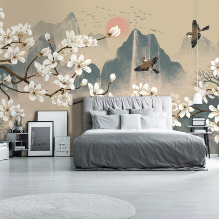 Orientális mintájú fotótapéta virág és madár mintával, melynek hátterében misztikus hegyvonulatok látszódnak. A virágzó faág a keleti kultúrák harmóniáját és szépségét hozza el otthonunkba.