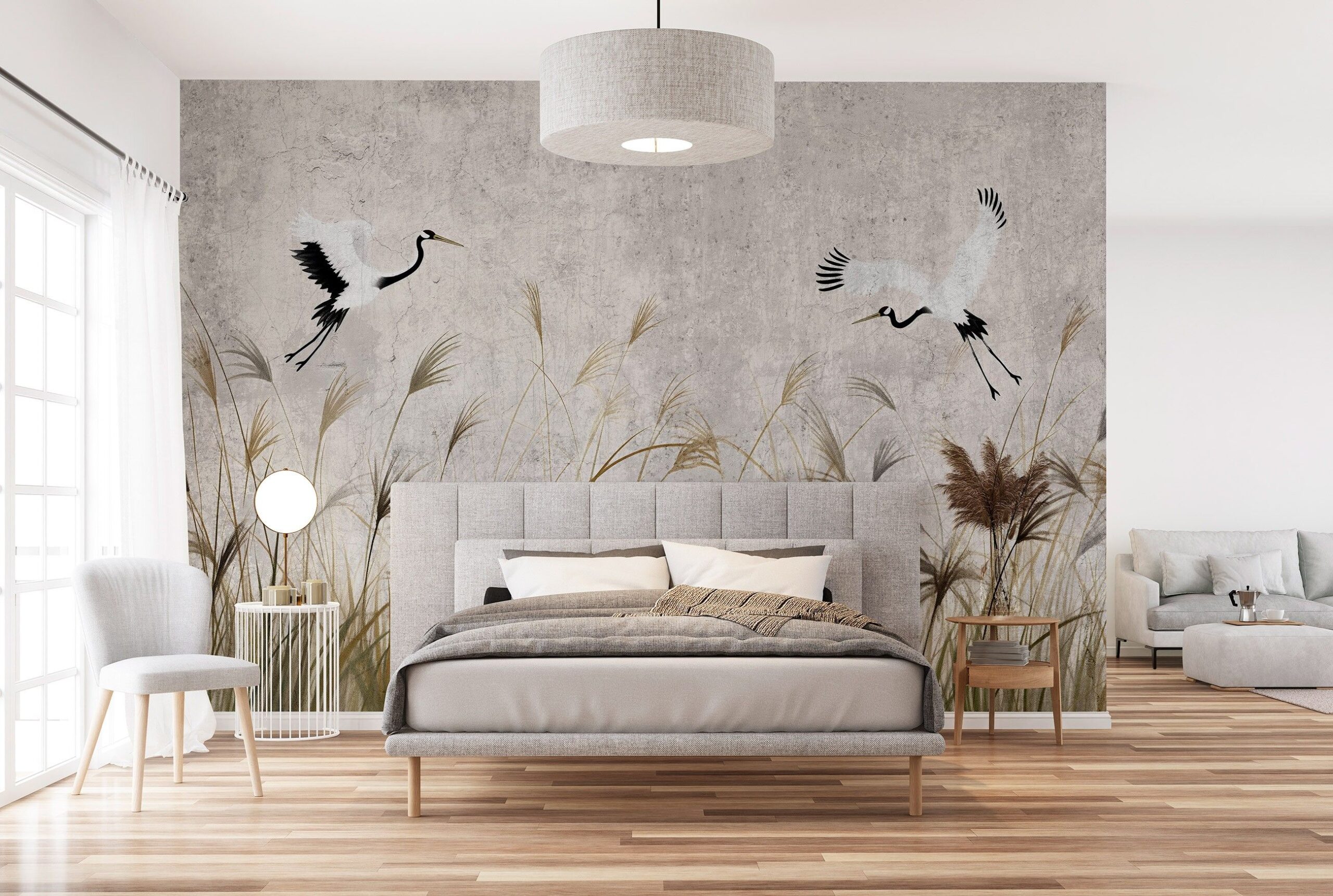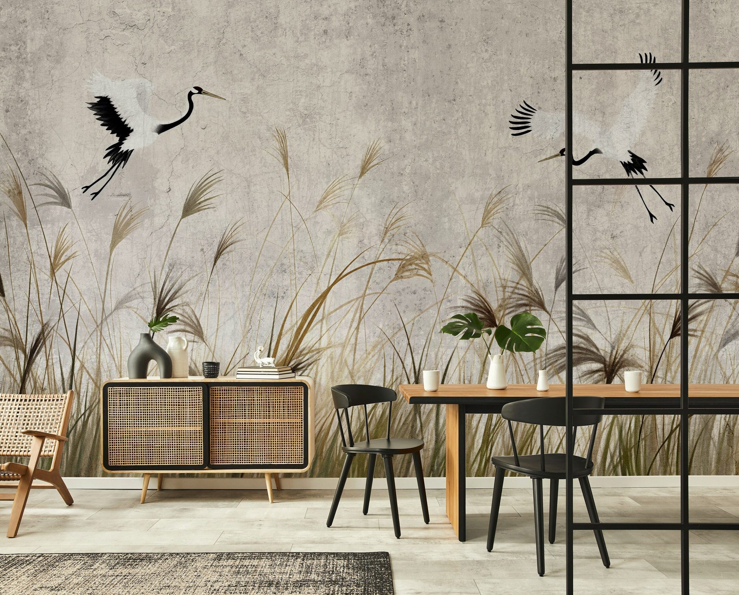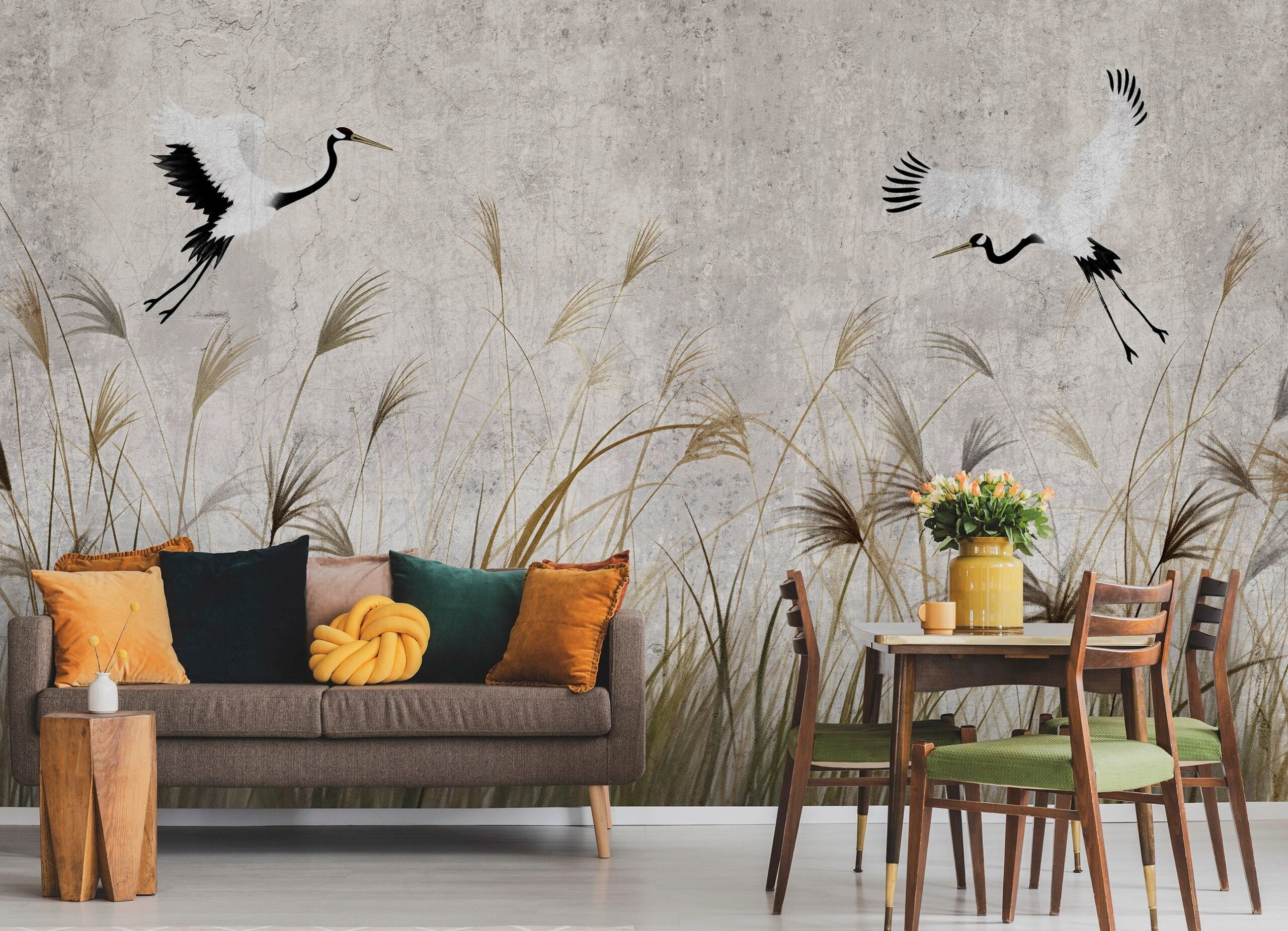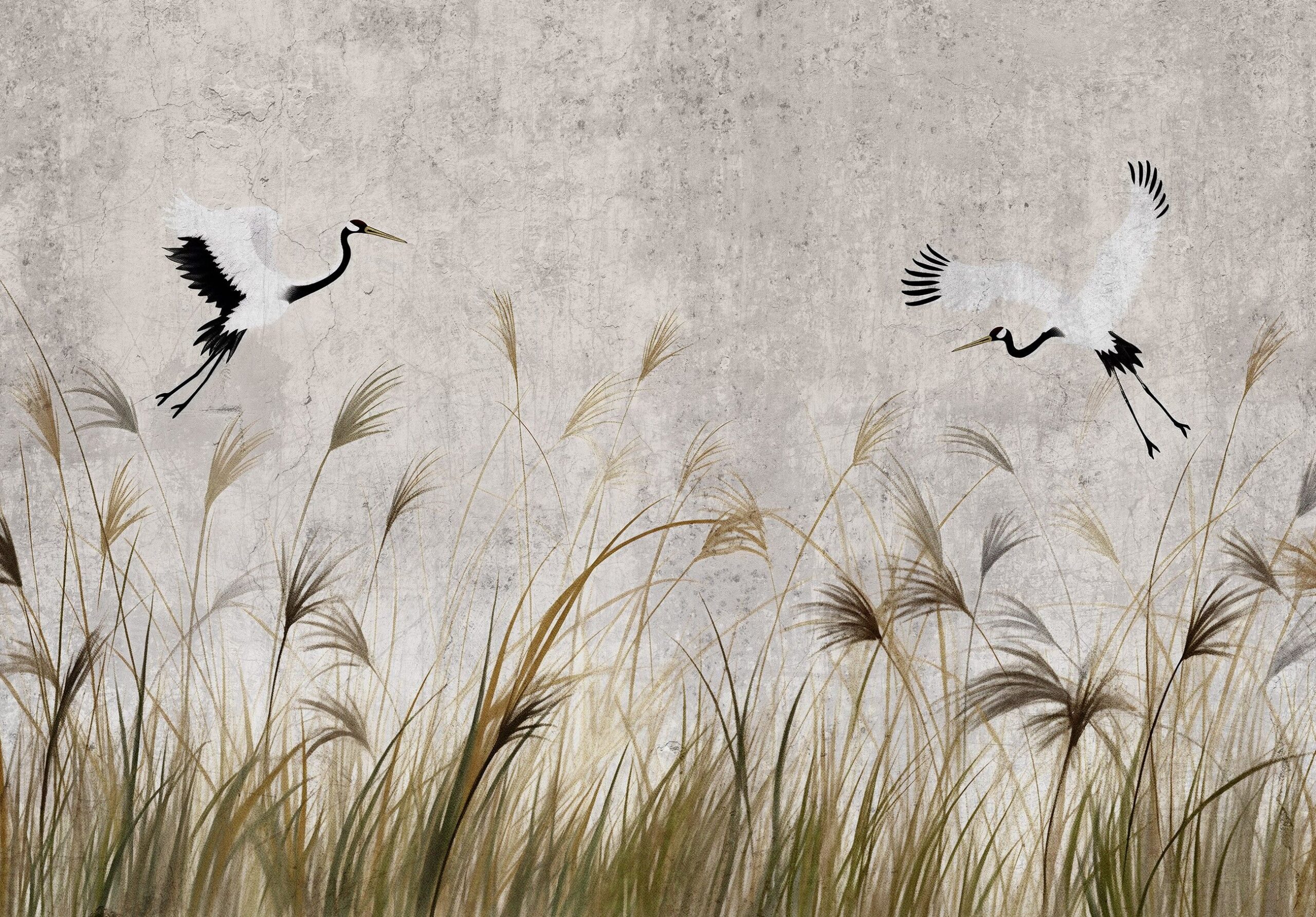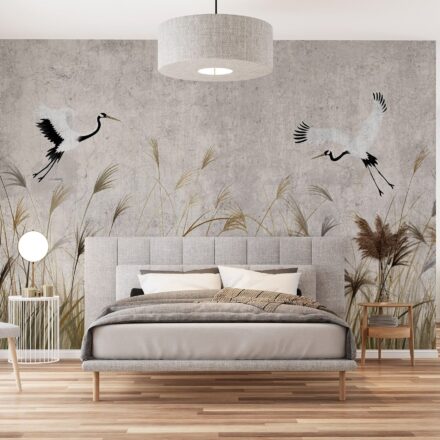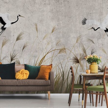 Orientális stílusú fotótapéta elegáns darumadarakkal, melyek egy szélfútta nádas felett repülnek. Könnyed, karcsú alakjuk hangulatossá varázsolja az enteriőrt.
