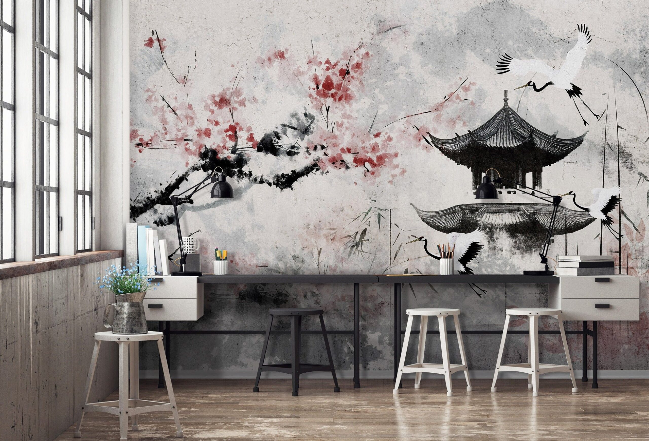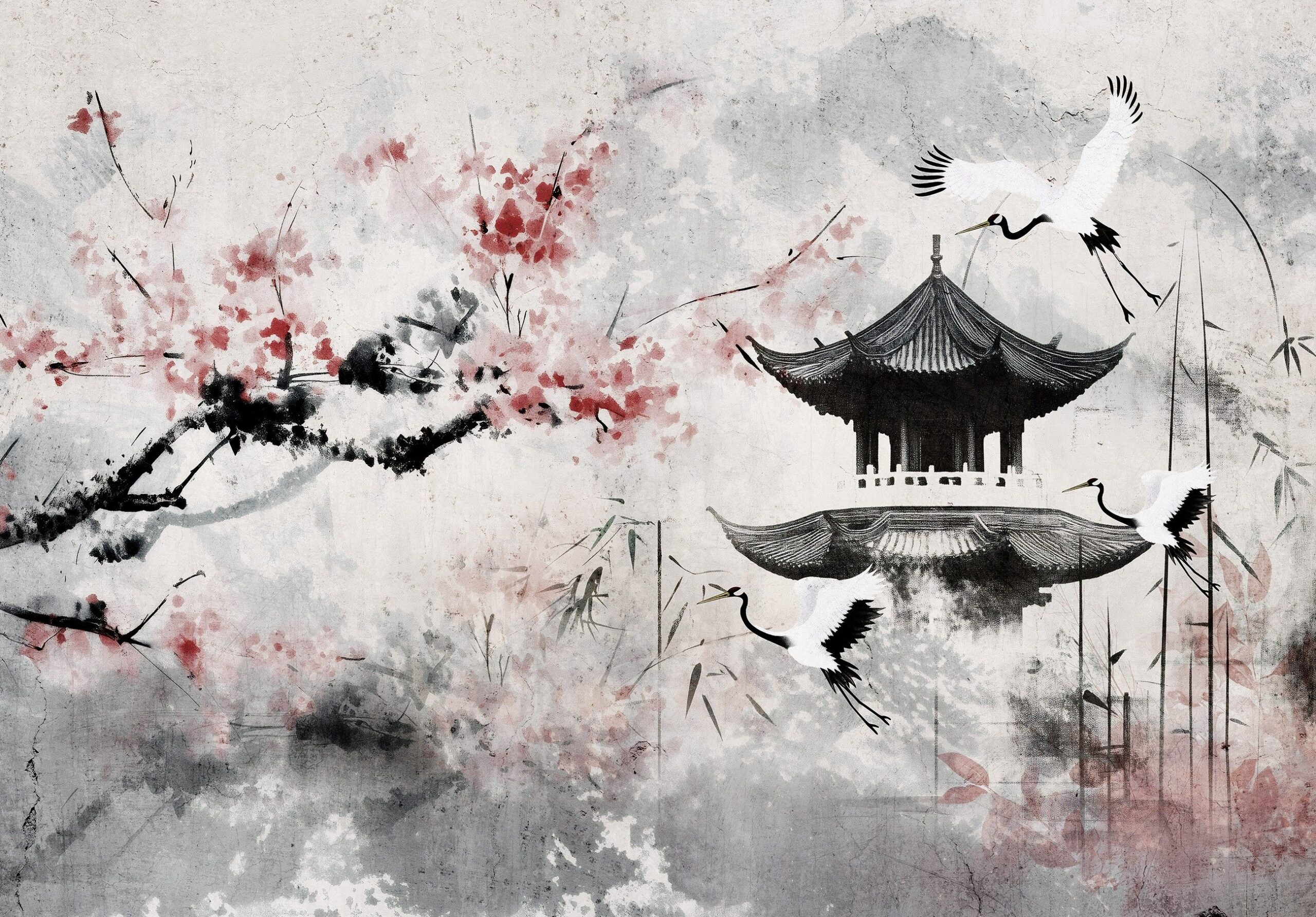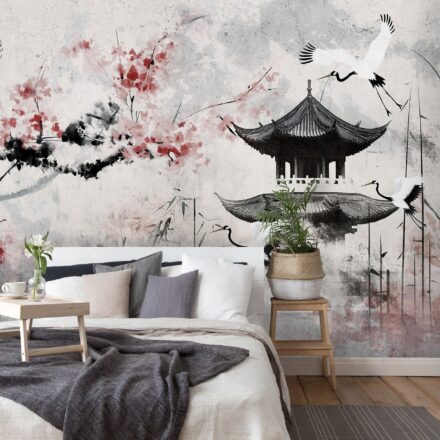 Orientális stílusú fotótapéta japán tájképpel, melyen a pagoda mellett megjelenő cseresznyefavirág és kecses darumadarak a tökéletes szépség kifejezői.