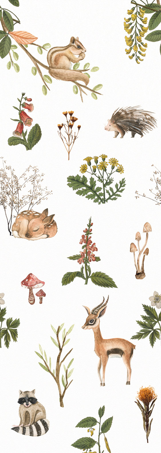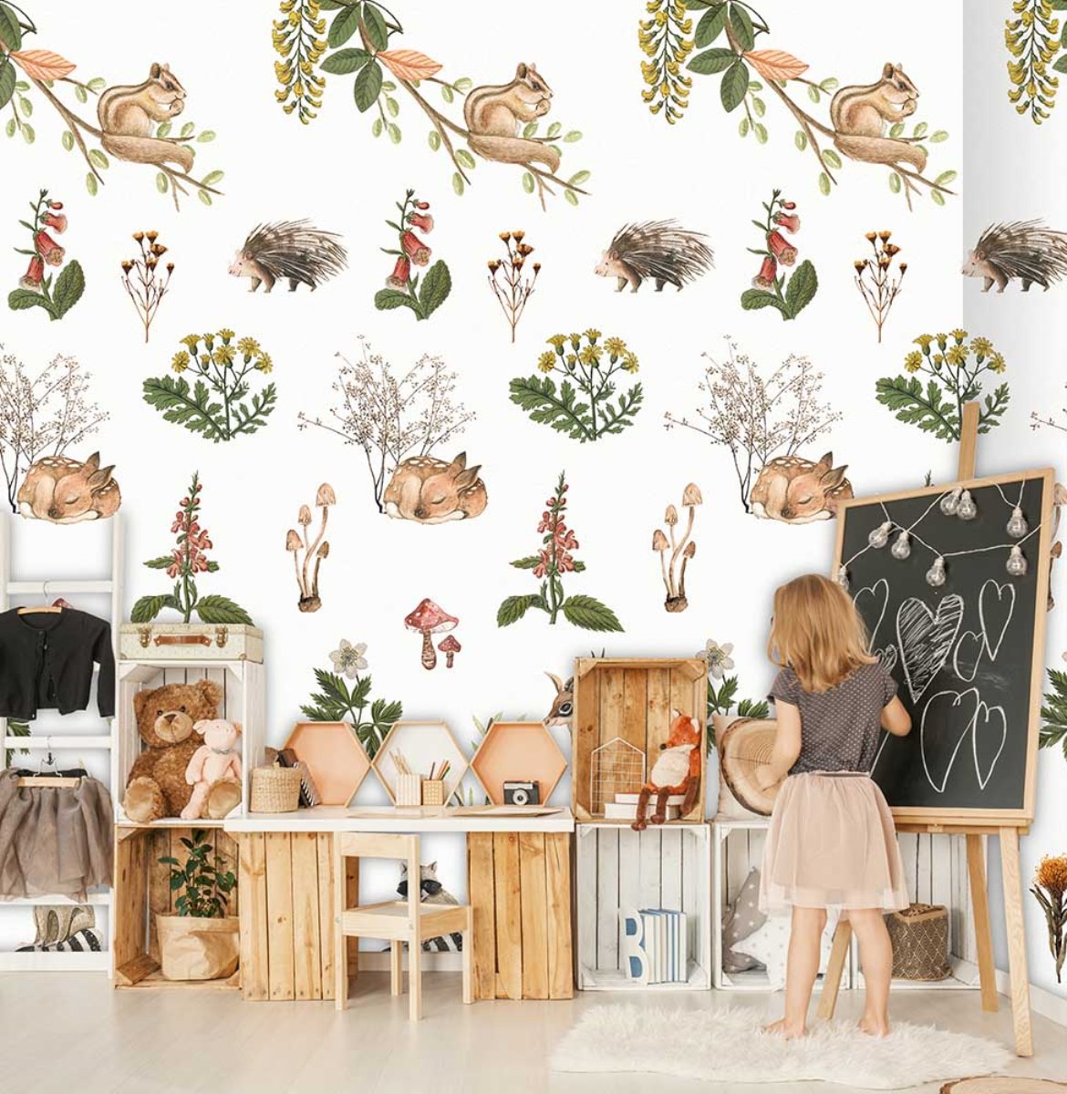 Bűbájos fotótapéta, melyen az alvó őzike mellett kedves mókus és süni is fellelhető.