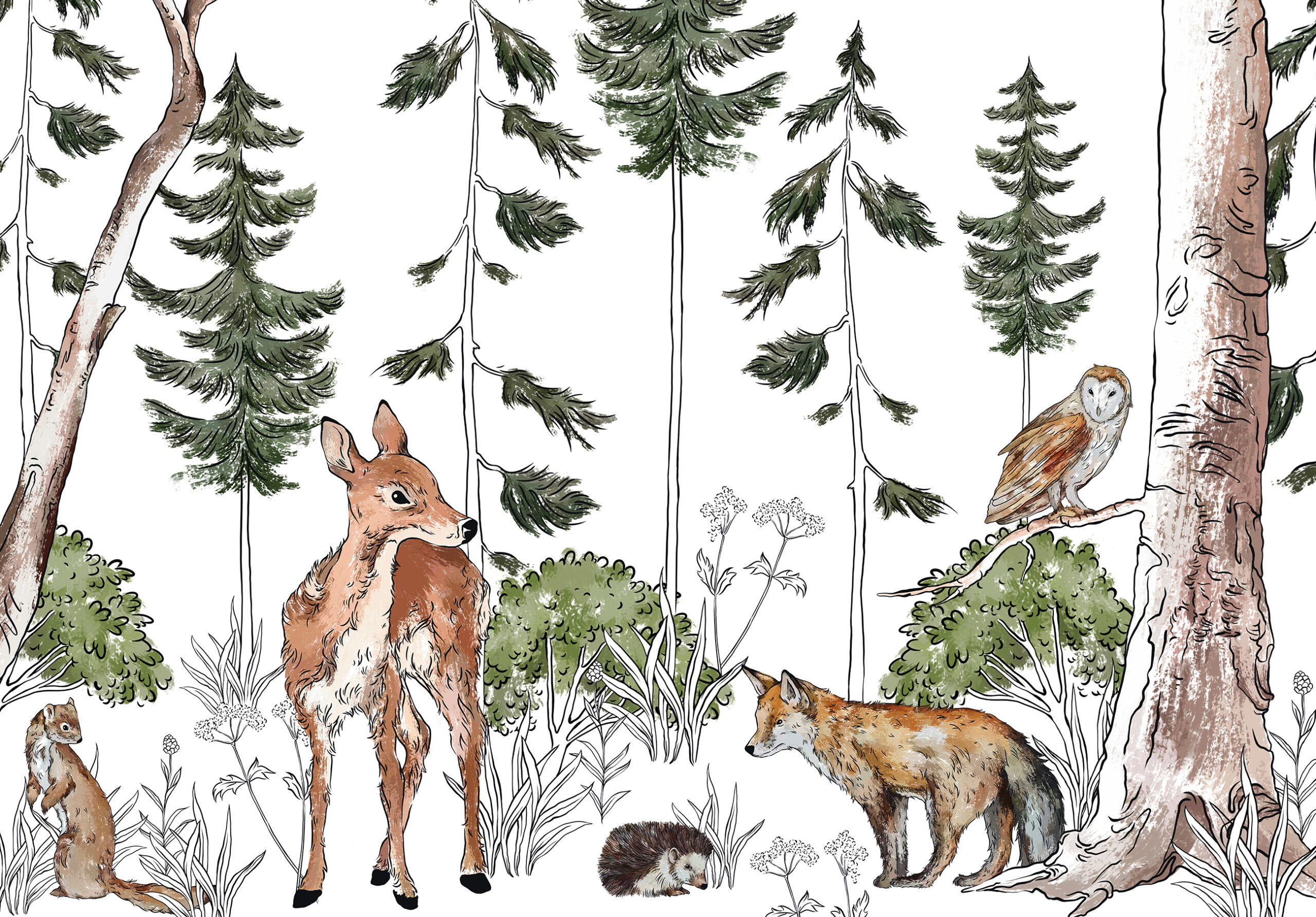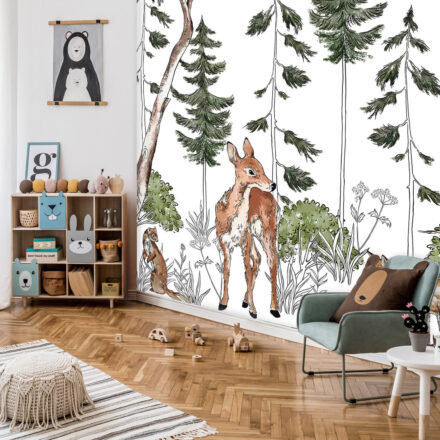 Kedvenc erdei állataink rajzolt képe jelenik meg a fotótapétán (őzike, róka, süni). Vidám alakjuk minden nap mosolyt csal gyermeked arcára.