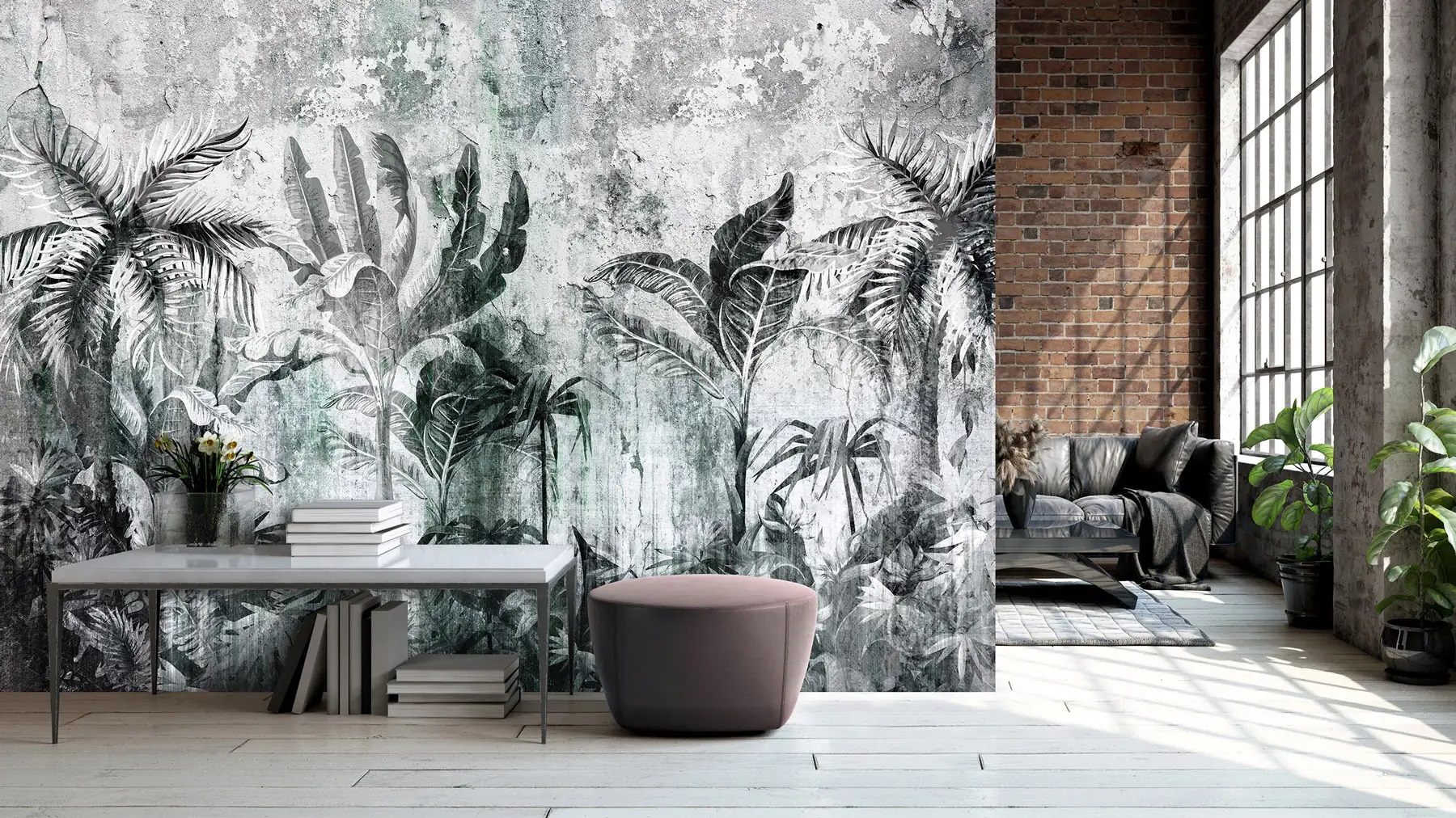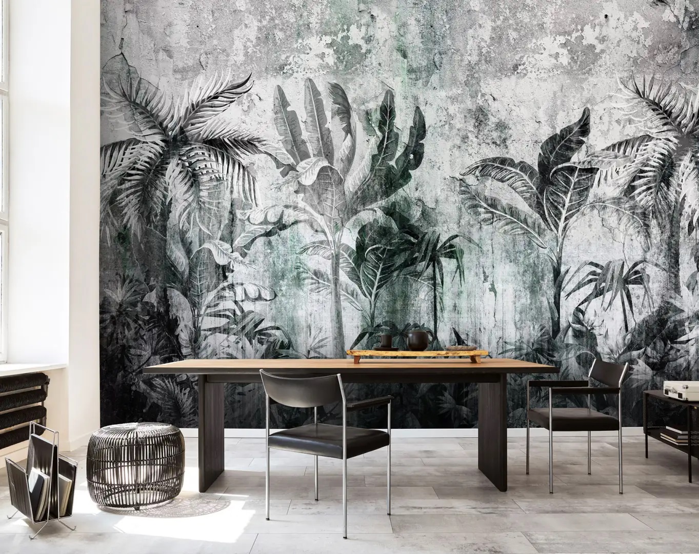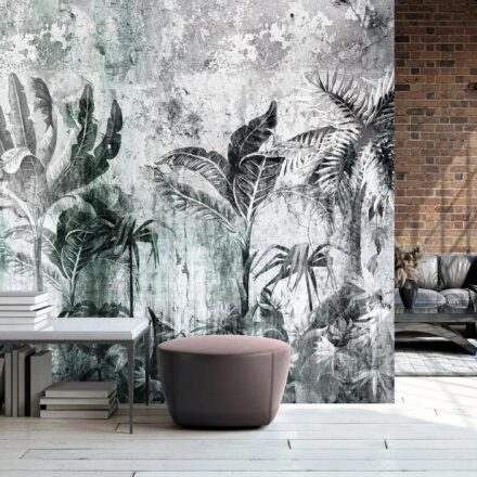 Igazi freskó hatását kelti a falon a fotótapéta, melyen pálmafák rajzolata jelenik meg.