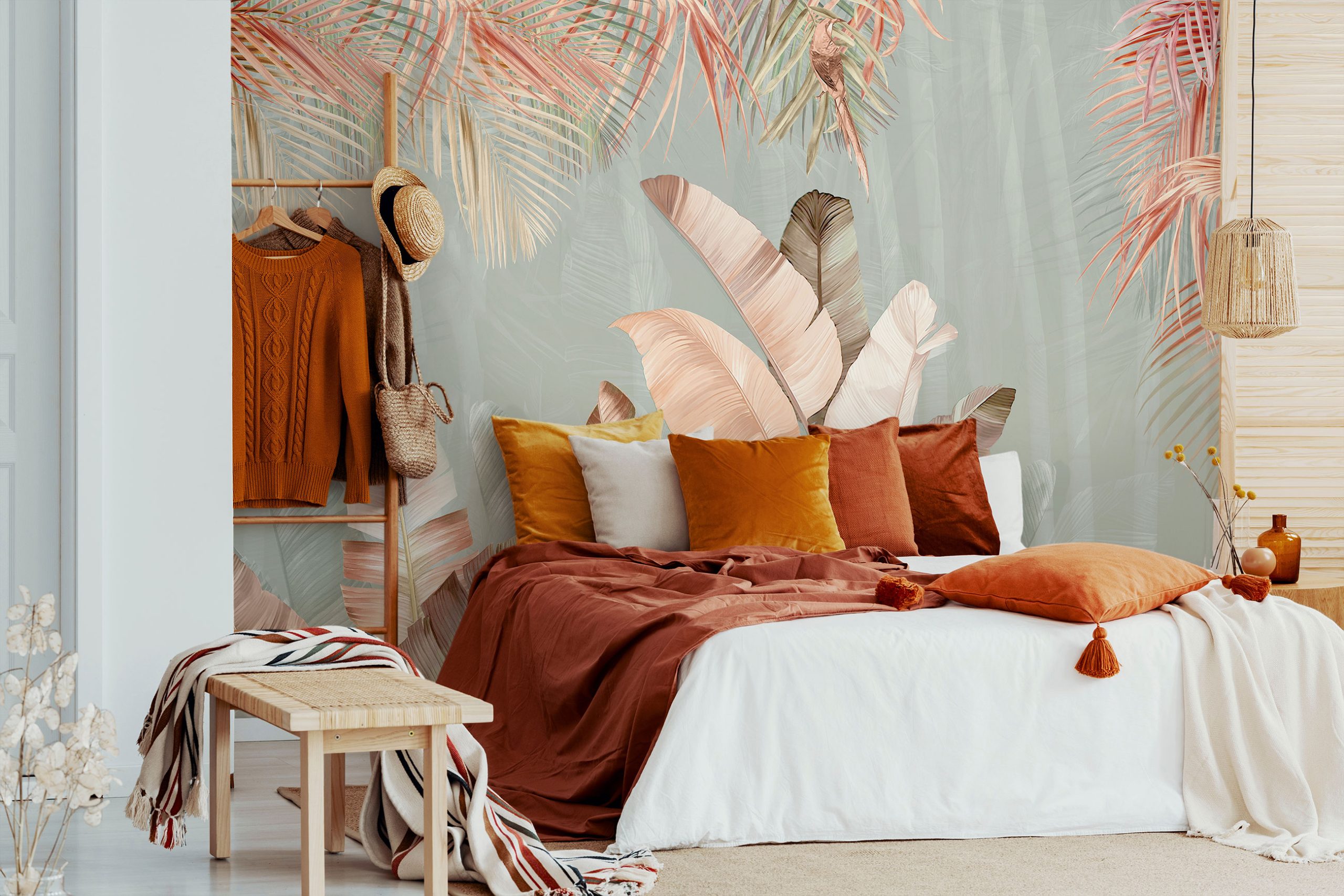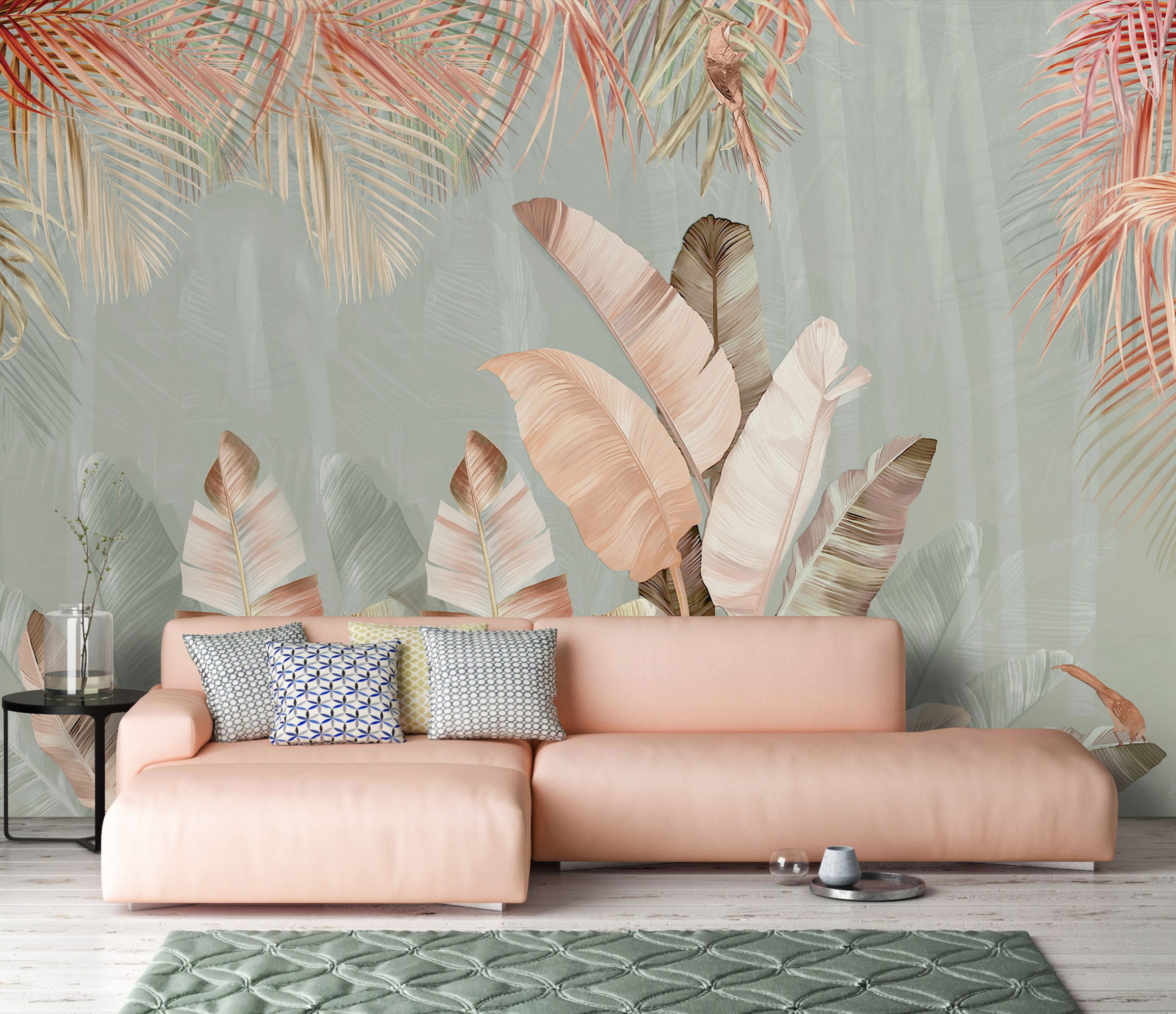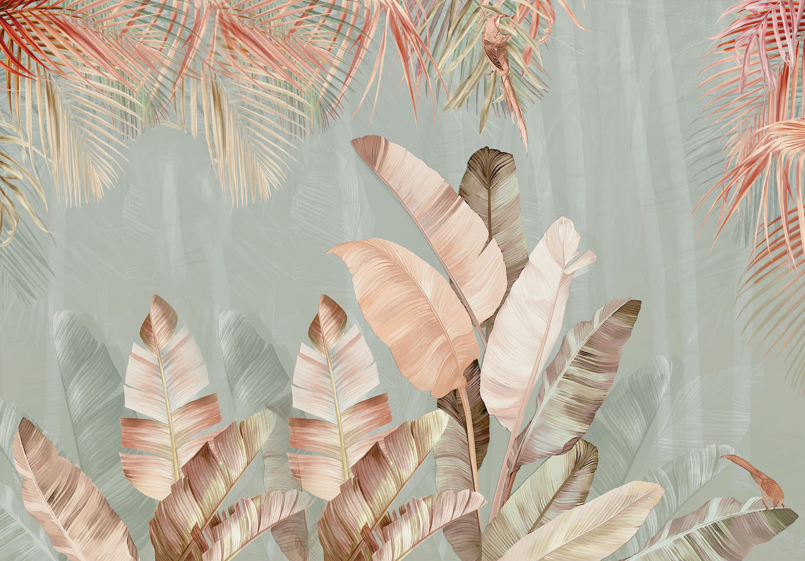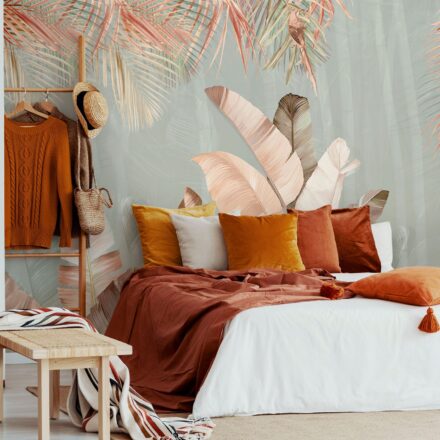 Az egzotikus pálmalevél minták finom, pasztell árnyalatokban jelenik meg, mellyel kifinomult, elegáns atmoszférát teremthetünk.