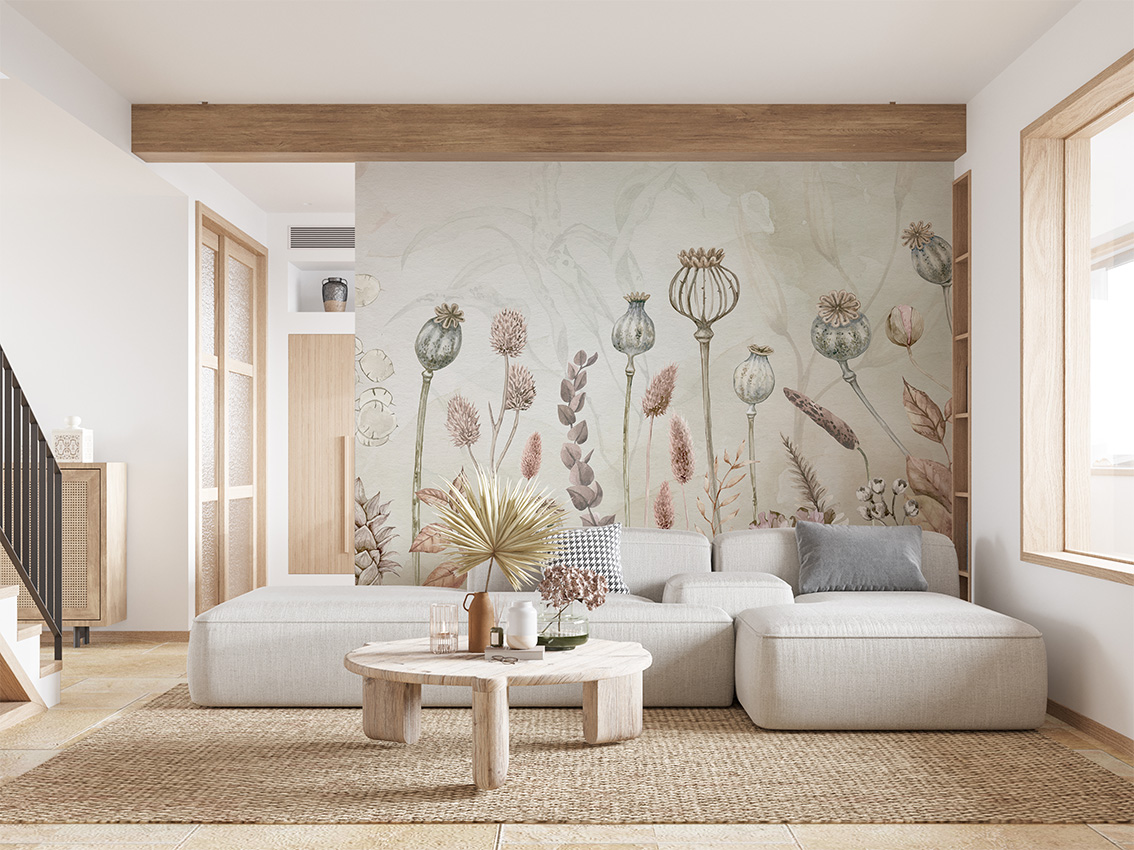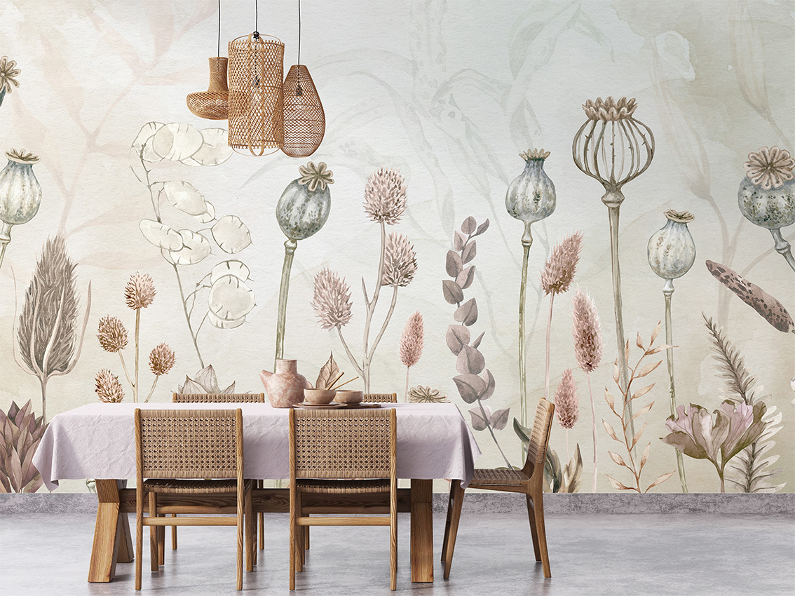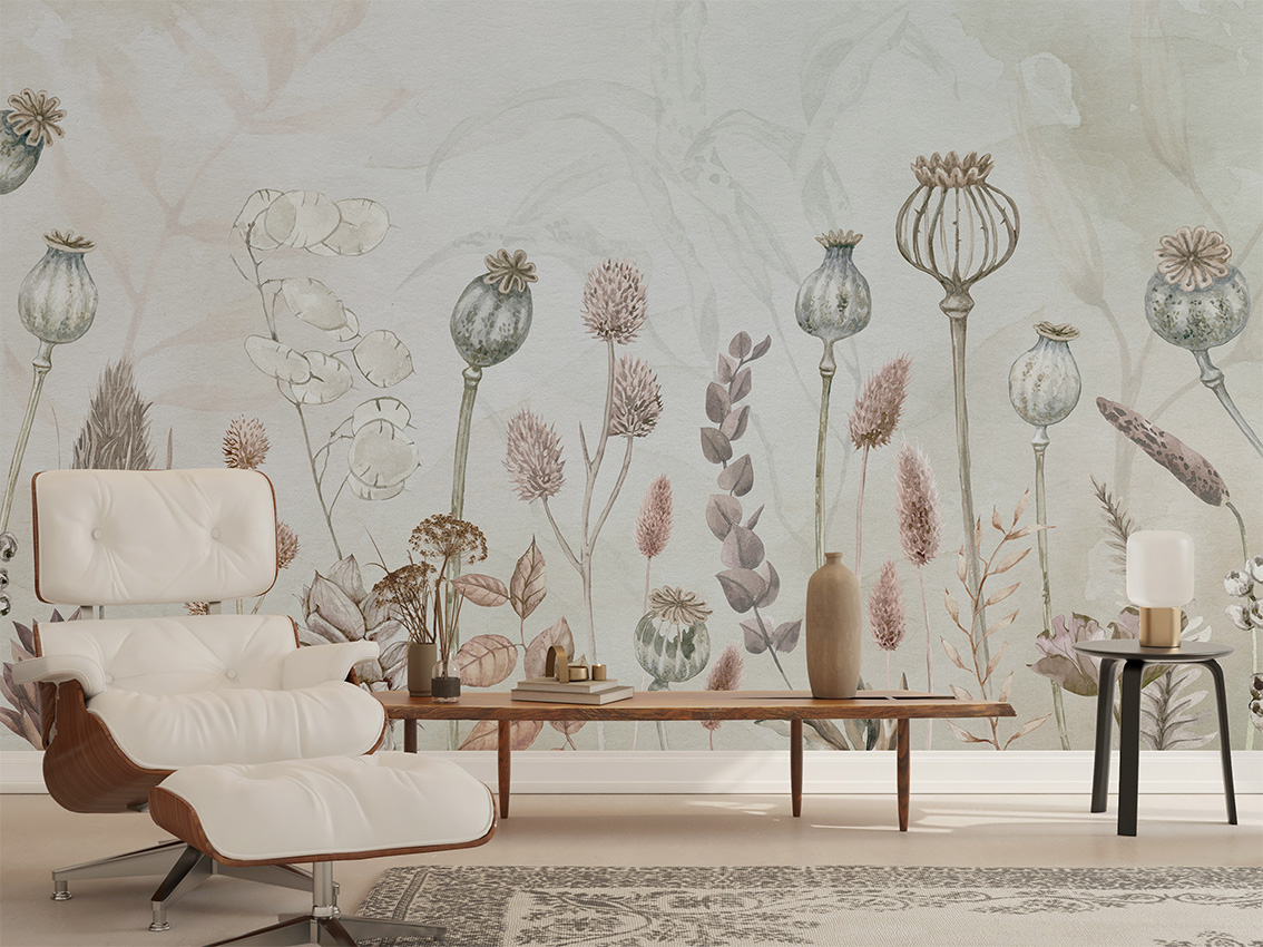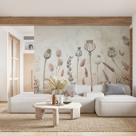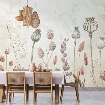 Pasztell árnyalatú vadvirágos fotótapéta, melynek kellemes árnyalata hangulatossá varázsolja az enteriőrt.