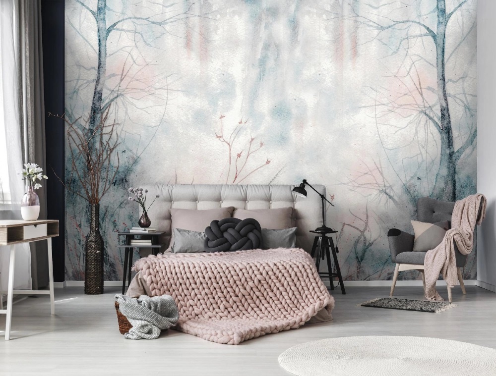 Ködbe burkolózó, téli reggelek képét kelti a kék-rózsaszínes árnyalatú fotótapéta. A finom színátmenetek között fák és növények képe rajzolódik ki elénk. Tökéletes választás hálószobába, hiszen a nyugalom és harmónia árad szét belőle.