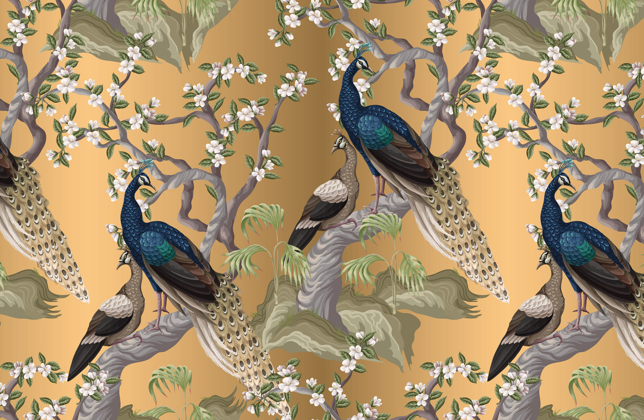Páva mintás fotótapéta sárga alapszínnel, melyből sugárzik a páva madárra jellemző fenséges elegancia és nőies szépség. A fotótapéta szépségét a virágos minta teszi tökéletessé.