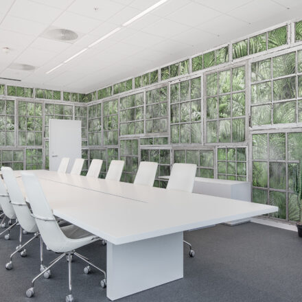 Az antikolt hatású ablakok izgalmas kilátást biztosítanak az elvadult természetre, a burjánzó növényzetre. A fotótapéta nagyítja az enteriőrt a kertre néző látképpel.
