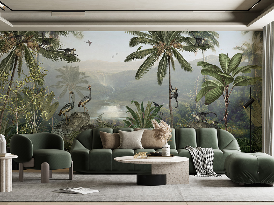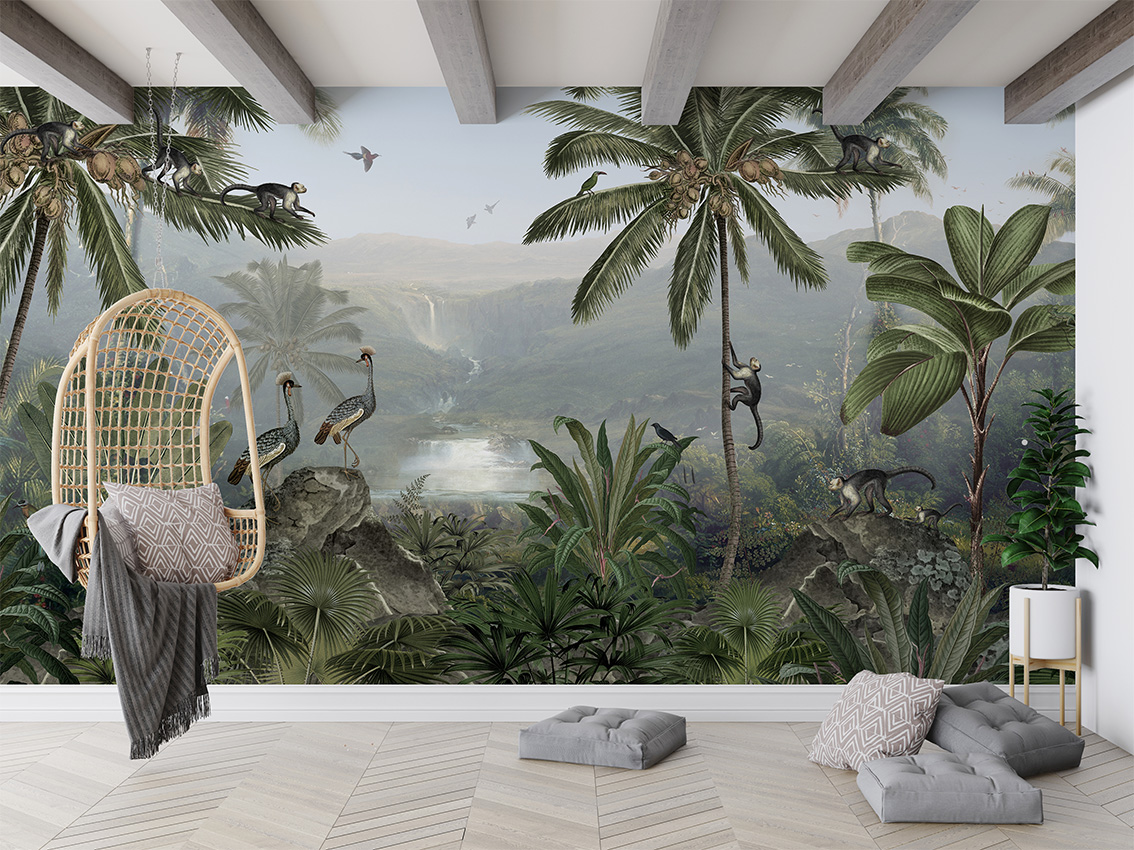 Prémium vlies fotótapéta dzsungel tájképpel, melyen a dús növényzetben feltűnnek a játszadozó majmok és az elegáns darumadarak is. A kép magán hordozza a természet magával ragadó erejét. A kép térhatásának köszönhetően a fotótapétának térnövelő hatása is van.