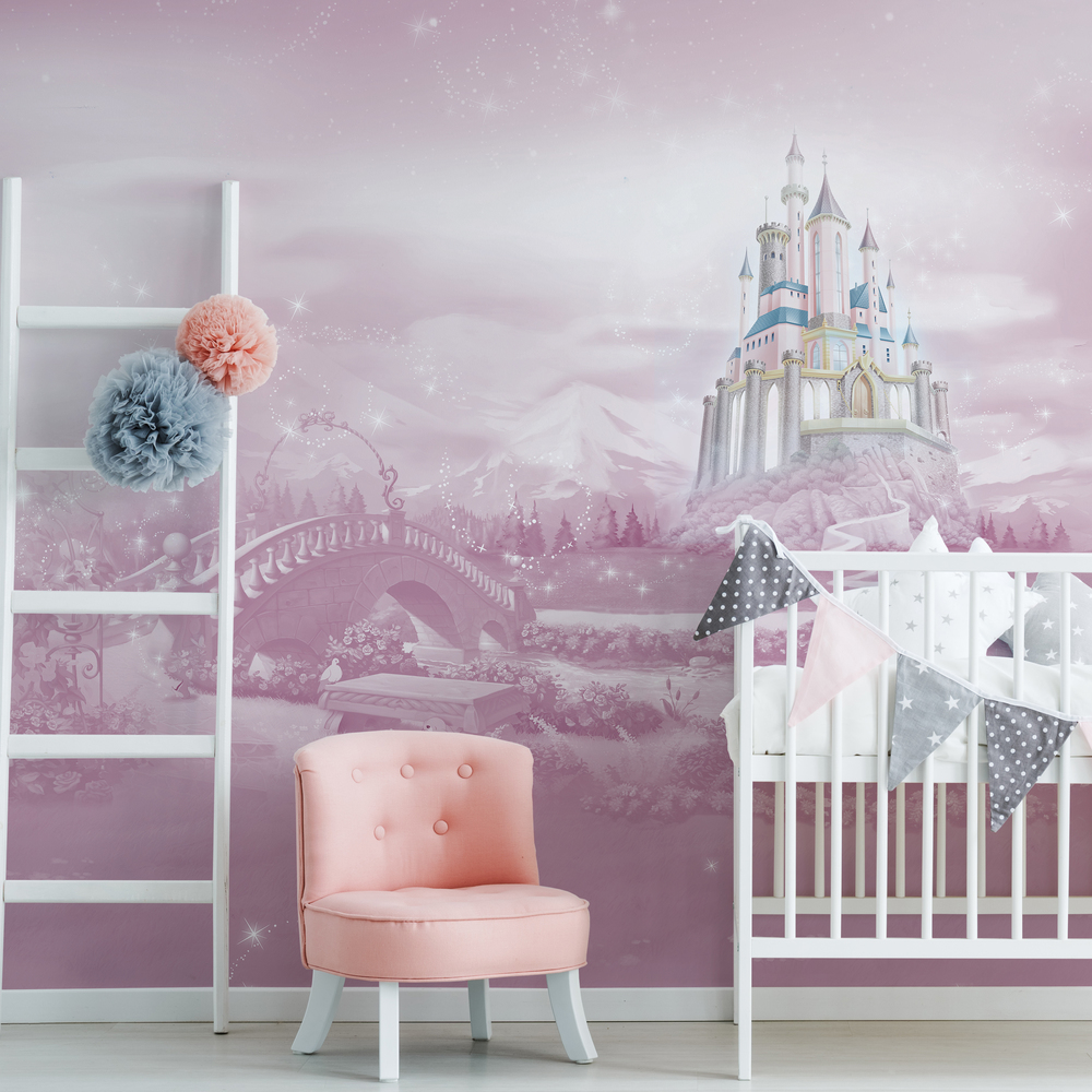 Csodaszép dekoráció kis hercegnők számára. A rózsaszín poszter tapéta hátterében a Disney mesék kastélya húzódik meg, csodás hátteret nyújtva a kislányok játékához.