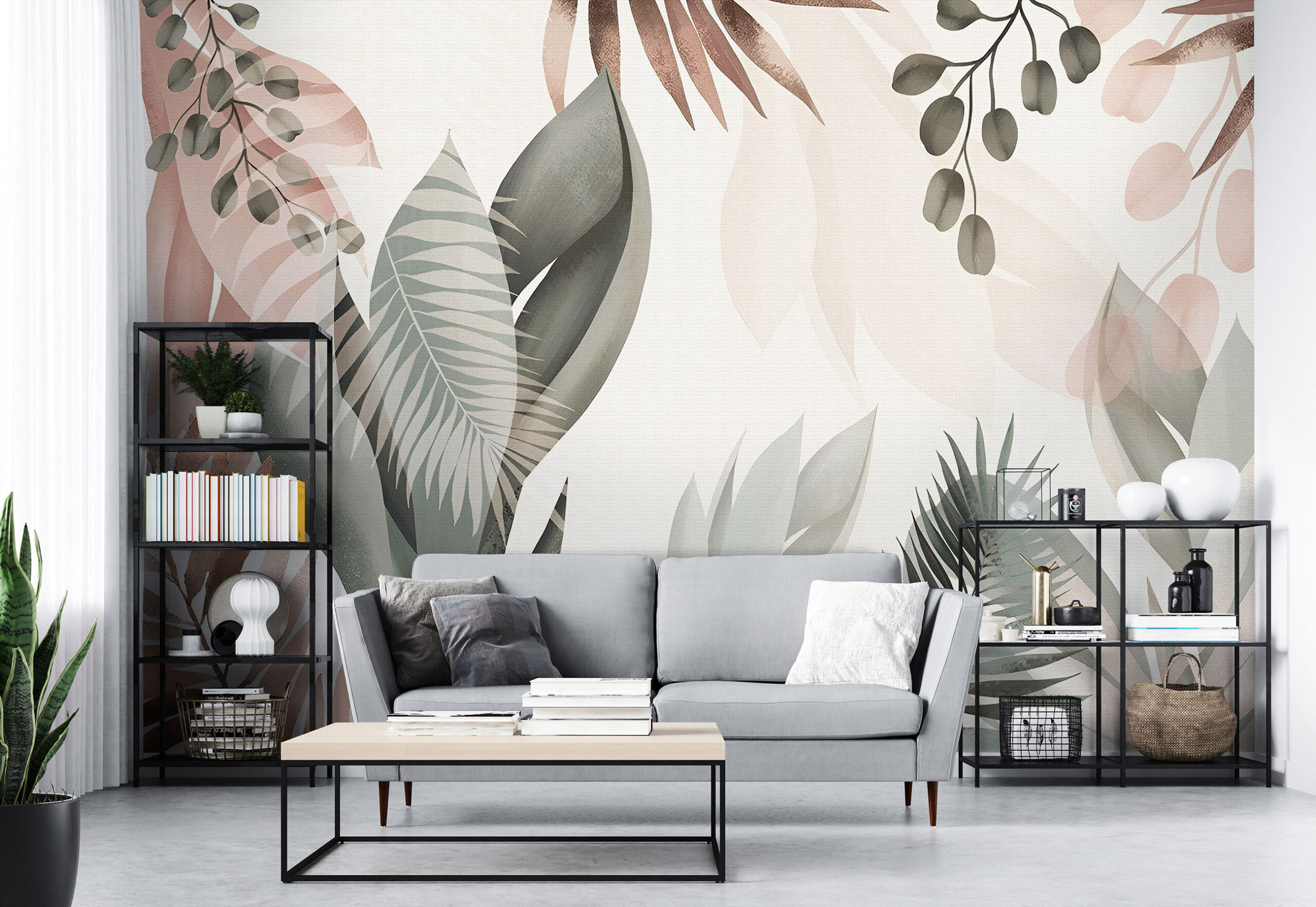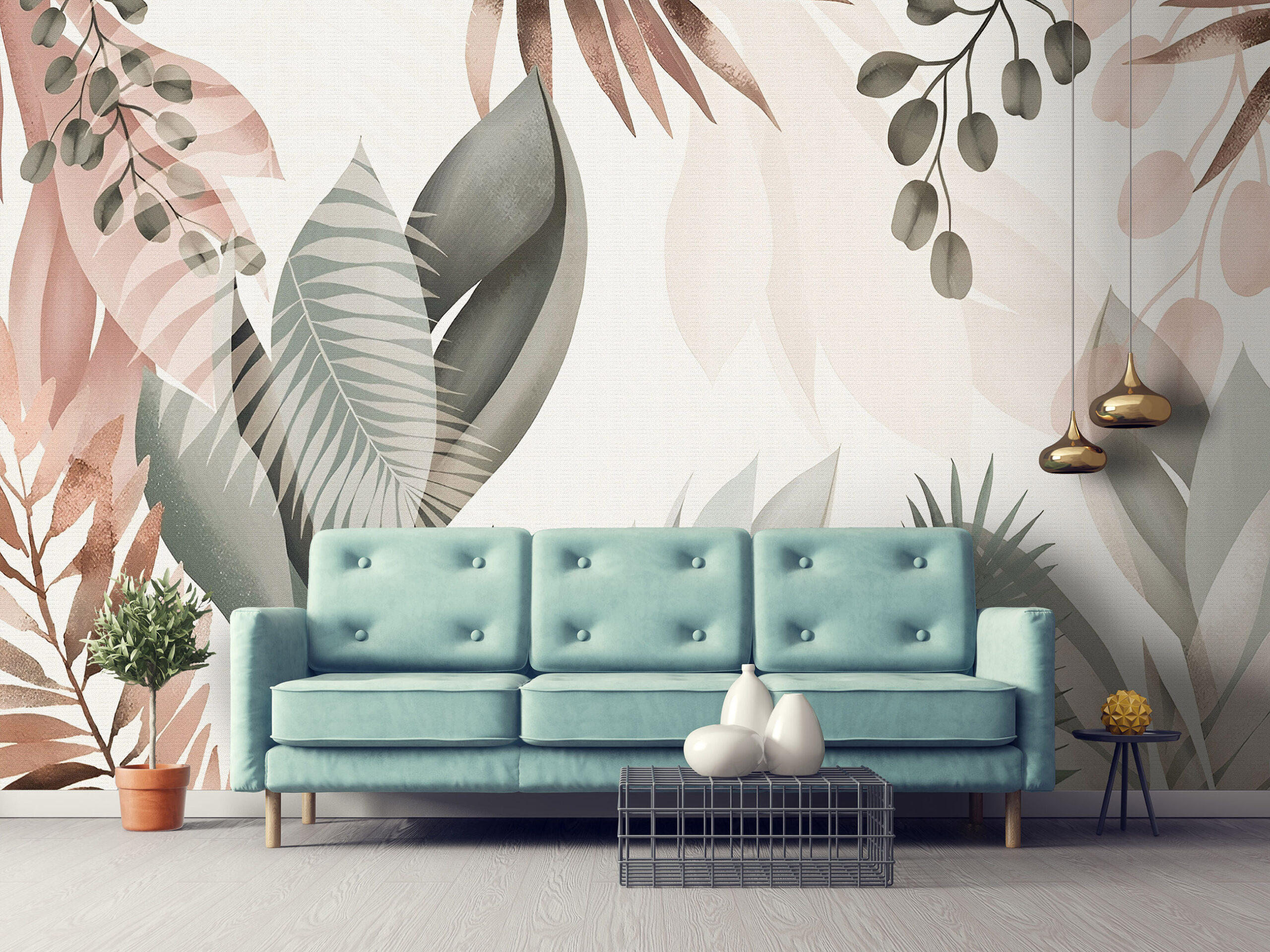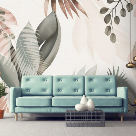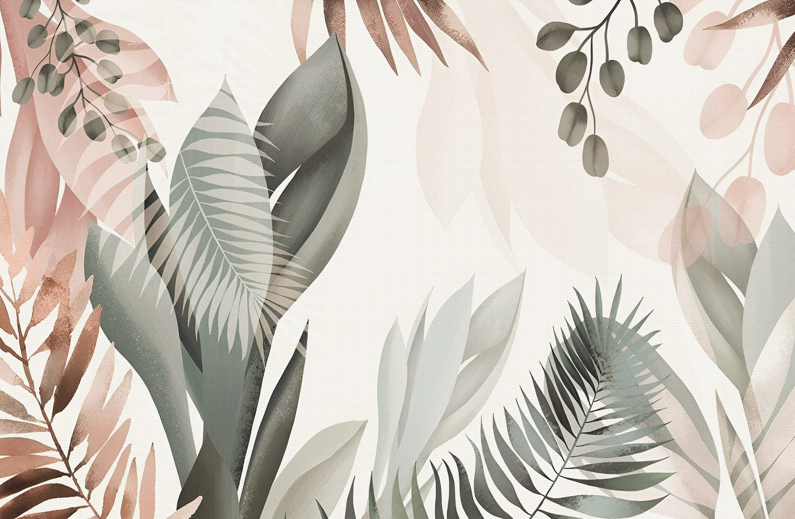Púder árnyalatú fotótapéta elegáns levélmintával, mely a szürke és a rózsaszínek tökéletes kombinációját nyújtja.
