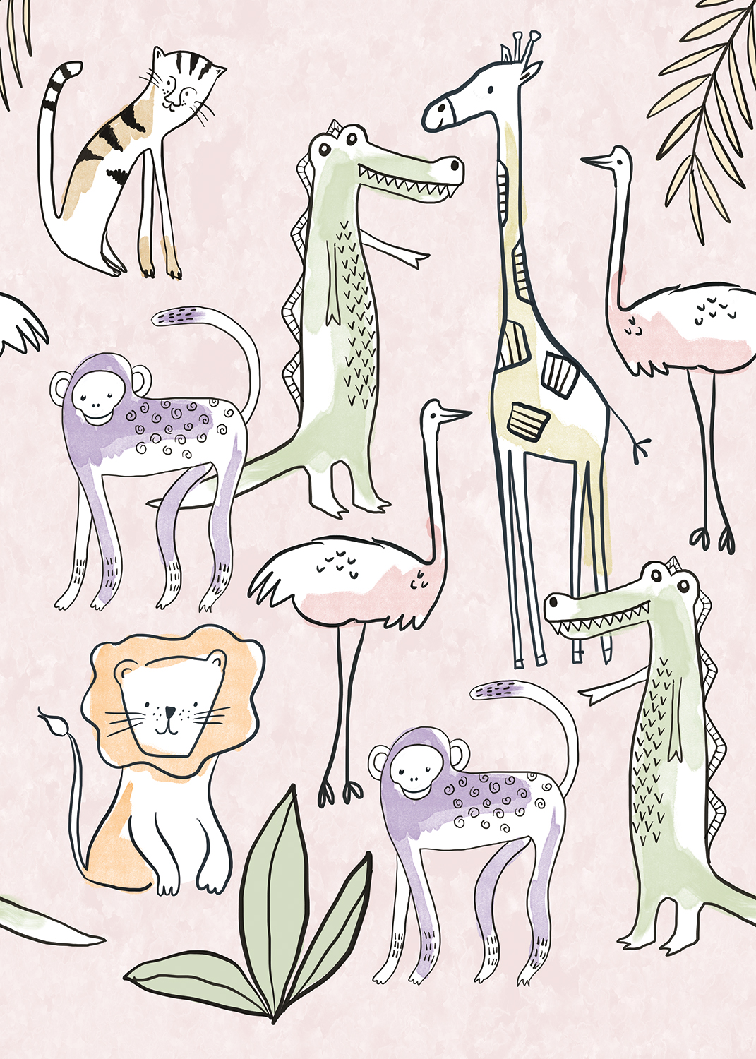 Kedvenc afrikai állataink tűnnek fel szemünk előtt: oroszlán, zsiráf, krokodil. Az állatok gyermeki rajzot imitáló formája barátságos hangulatot ébreszt.