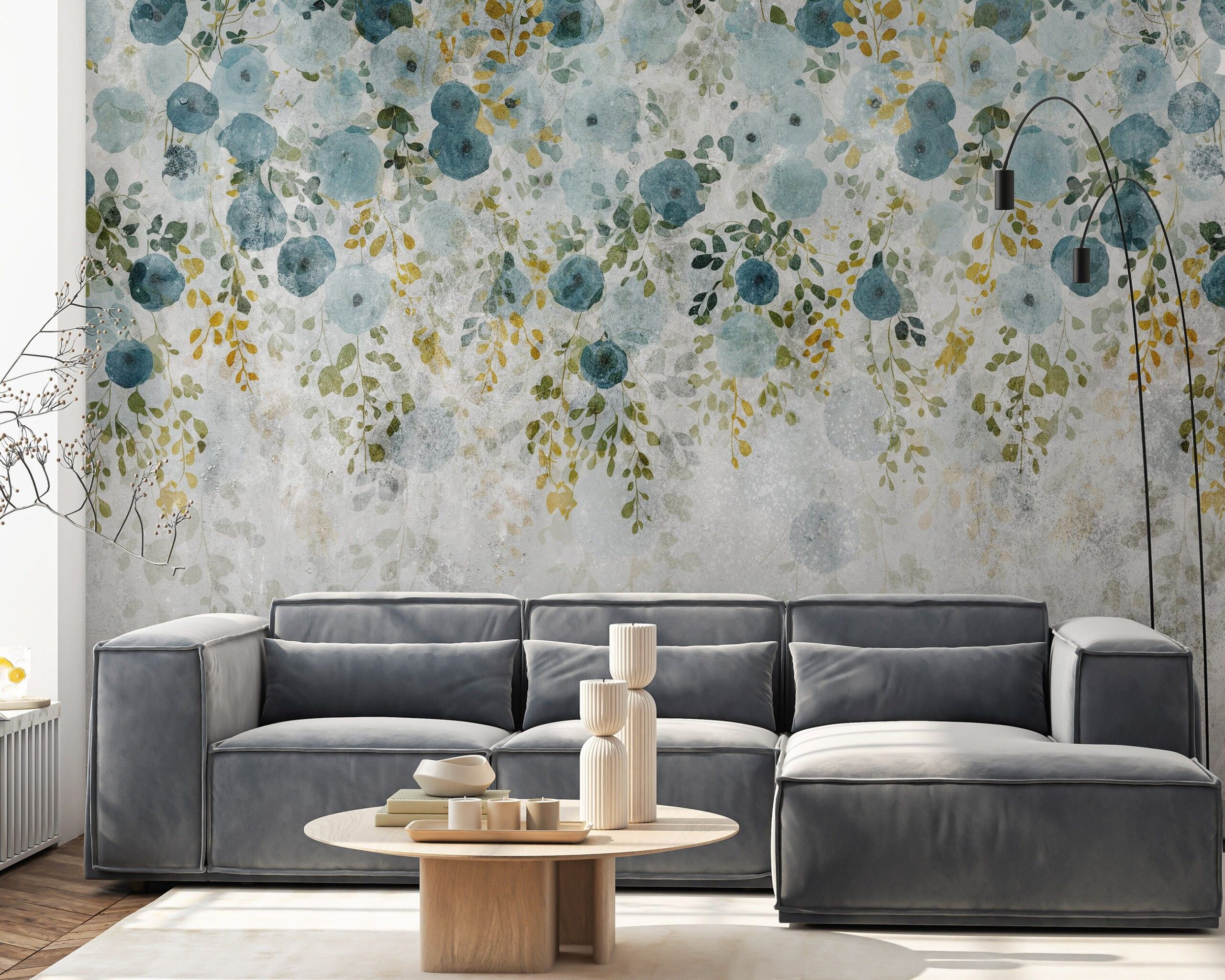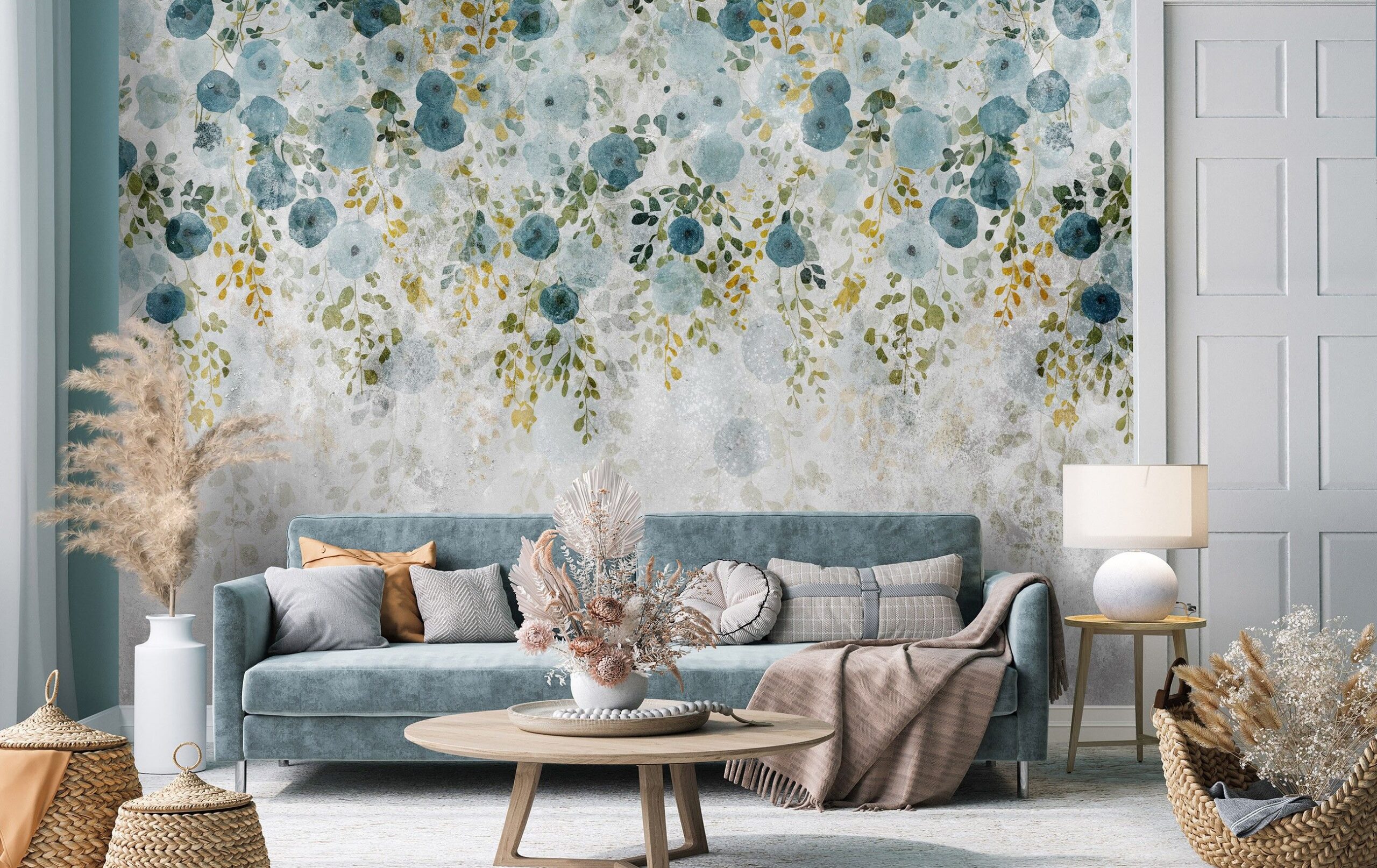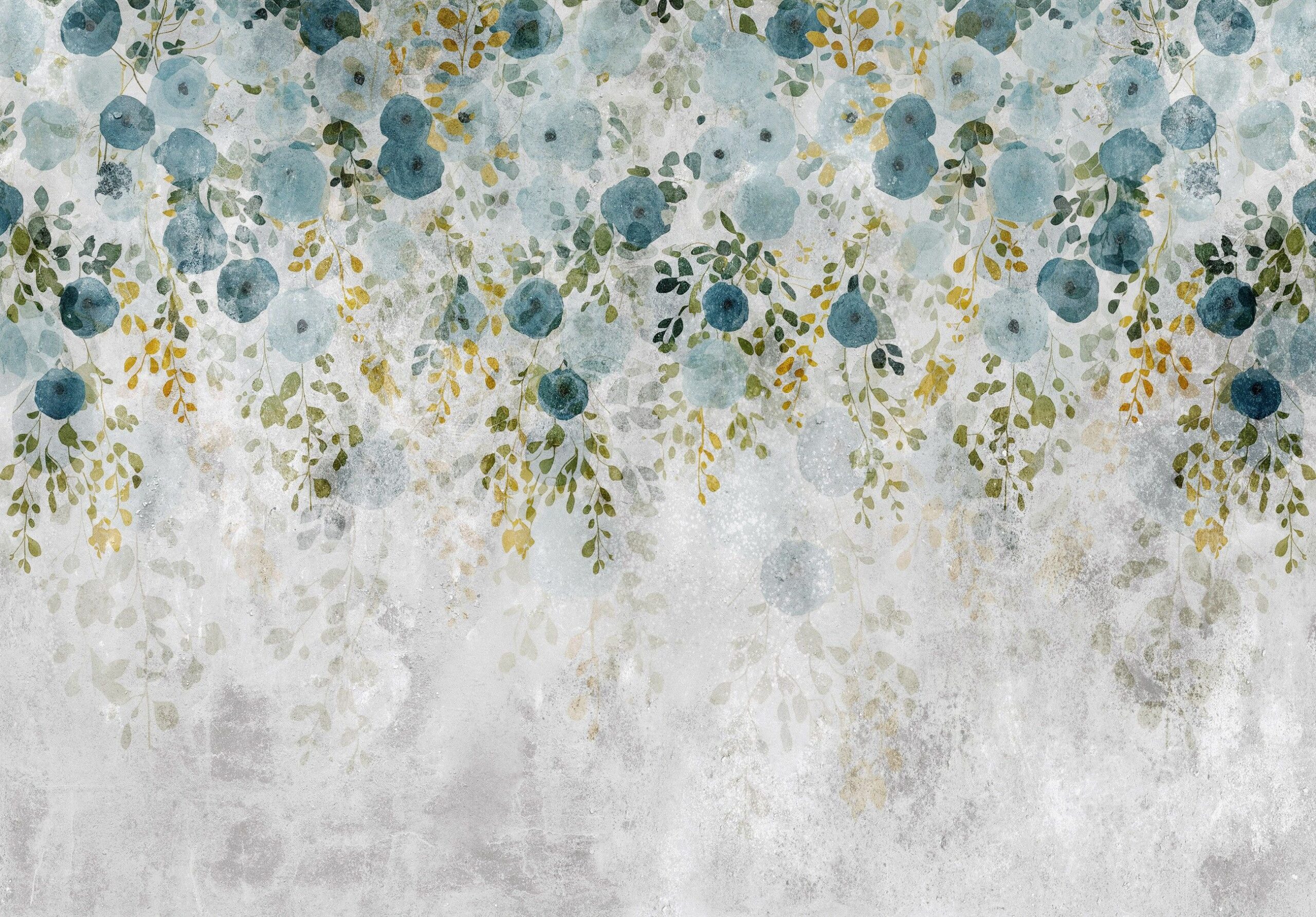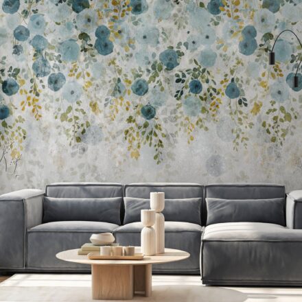 Romantikus fotótapéta lecsüngő kék virágmintával, mely tökéletes választás kanapé vagy ágy mögötti falra.