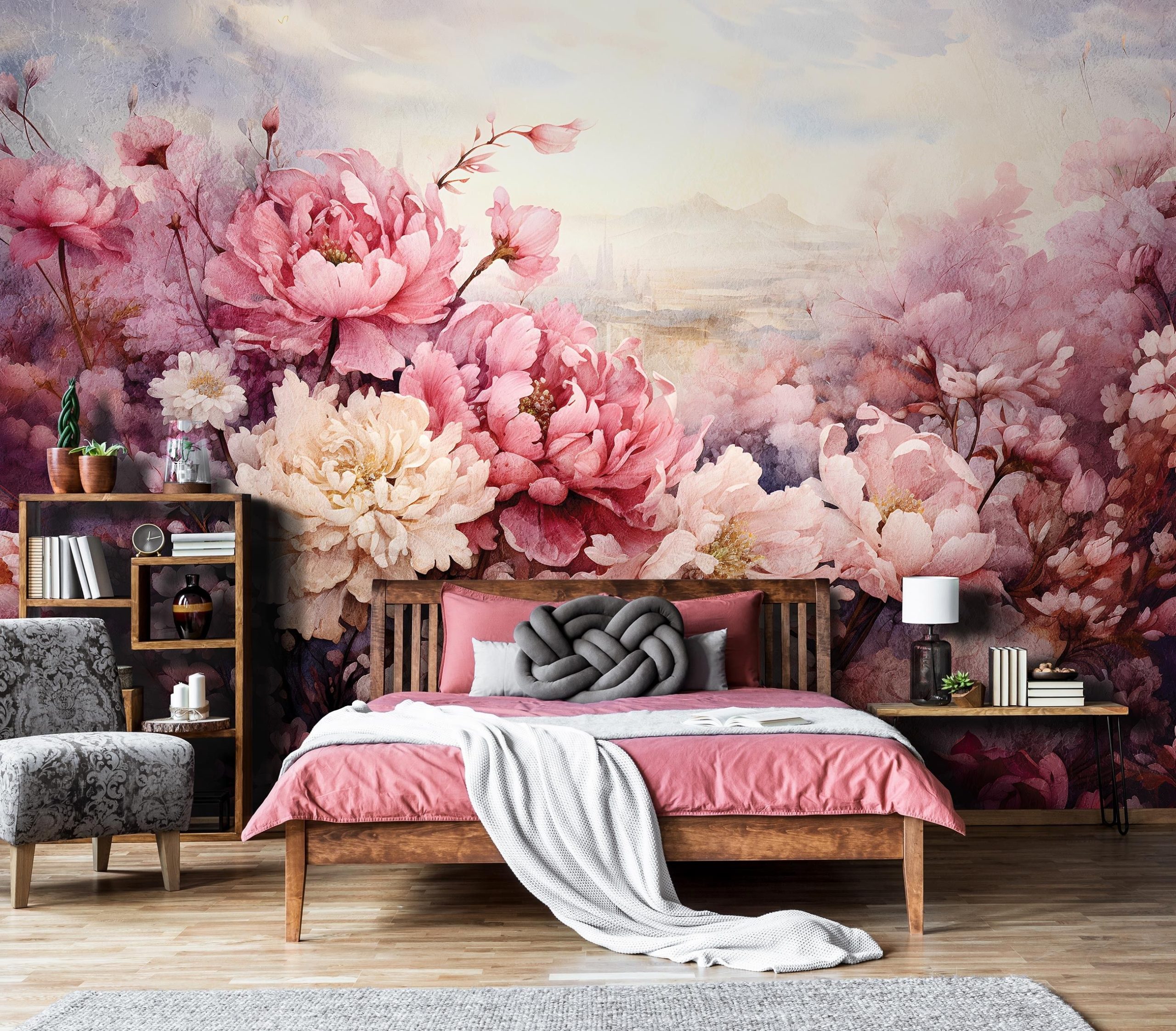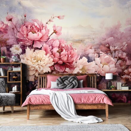 Romantikus hangulatot árasztó virágos fotótapéta, melynek nagy méretű bazsarózsái lélegzetelállító látványt nyújtanak a falon.
