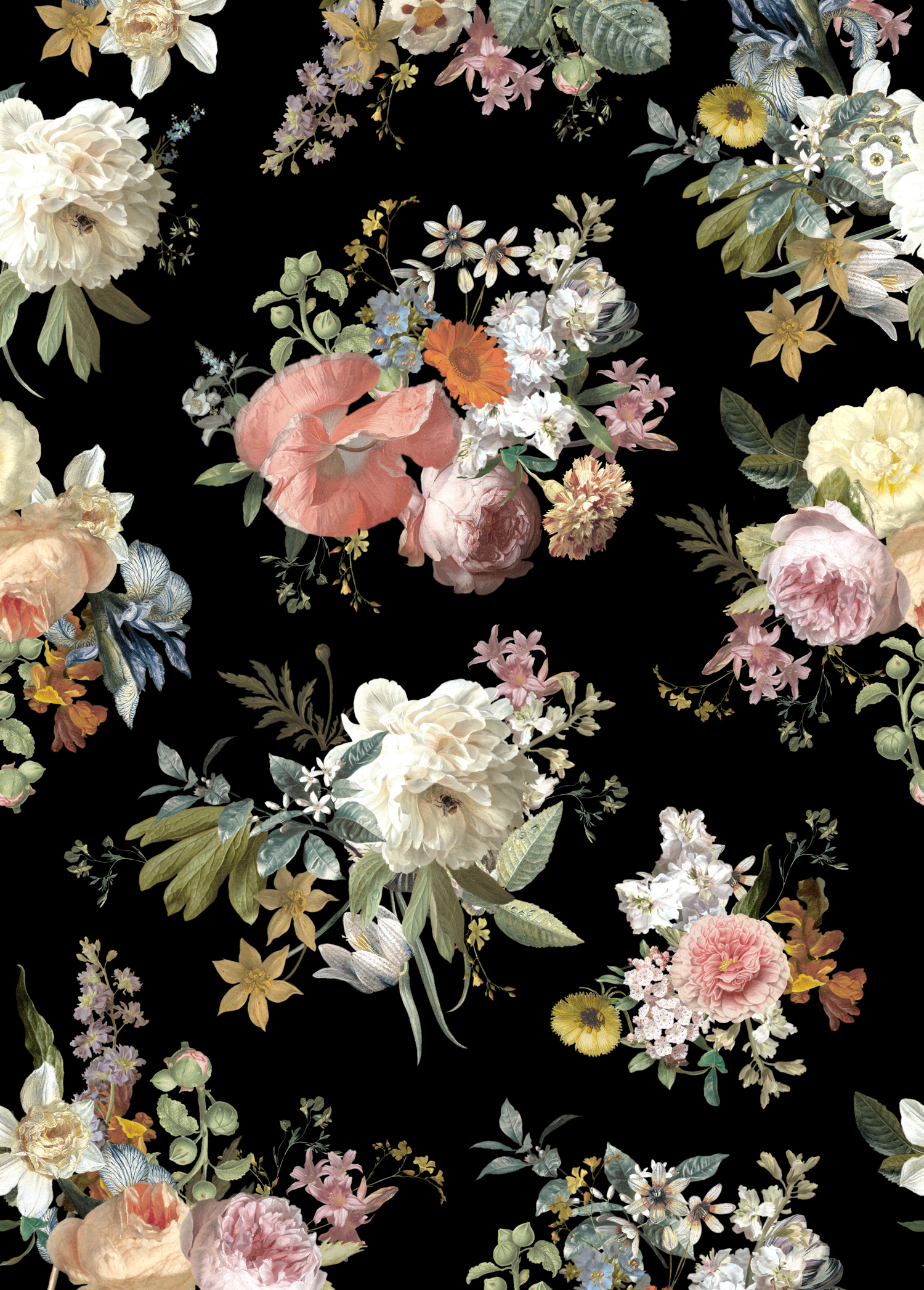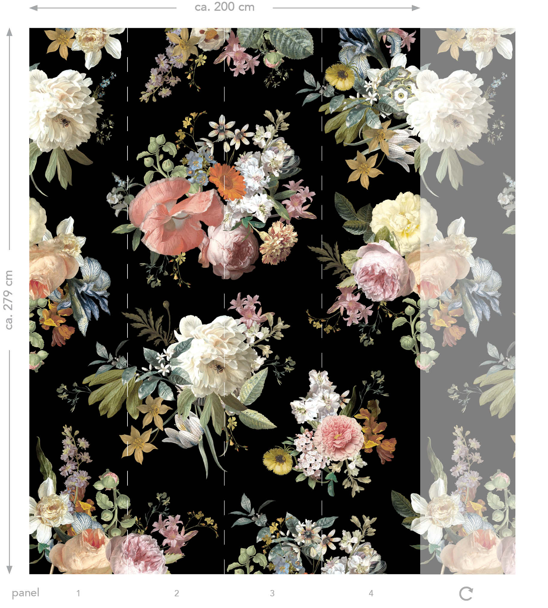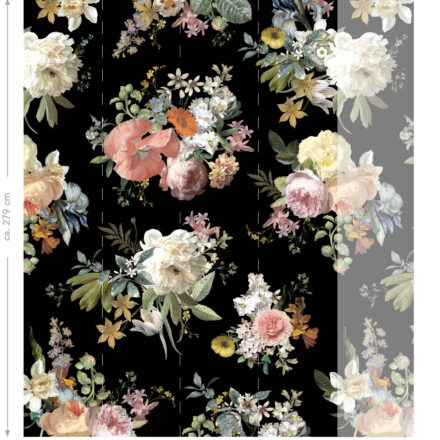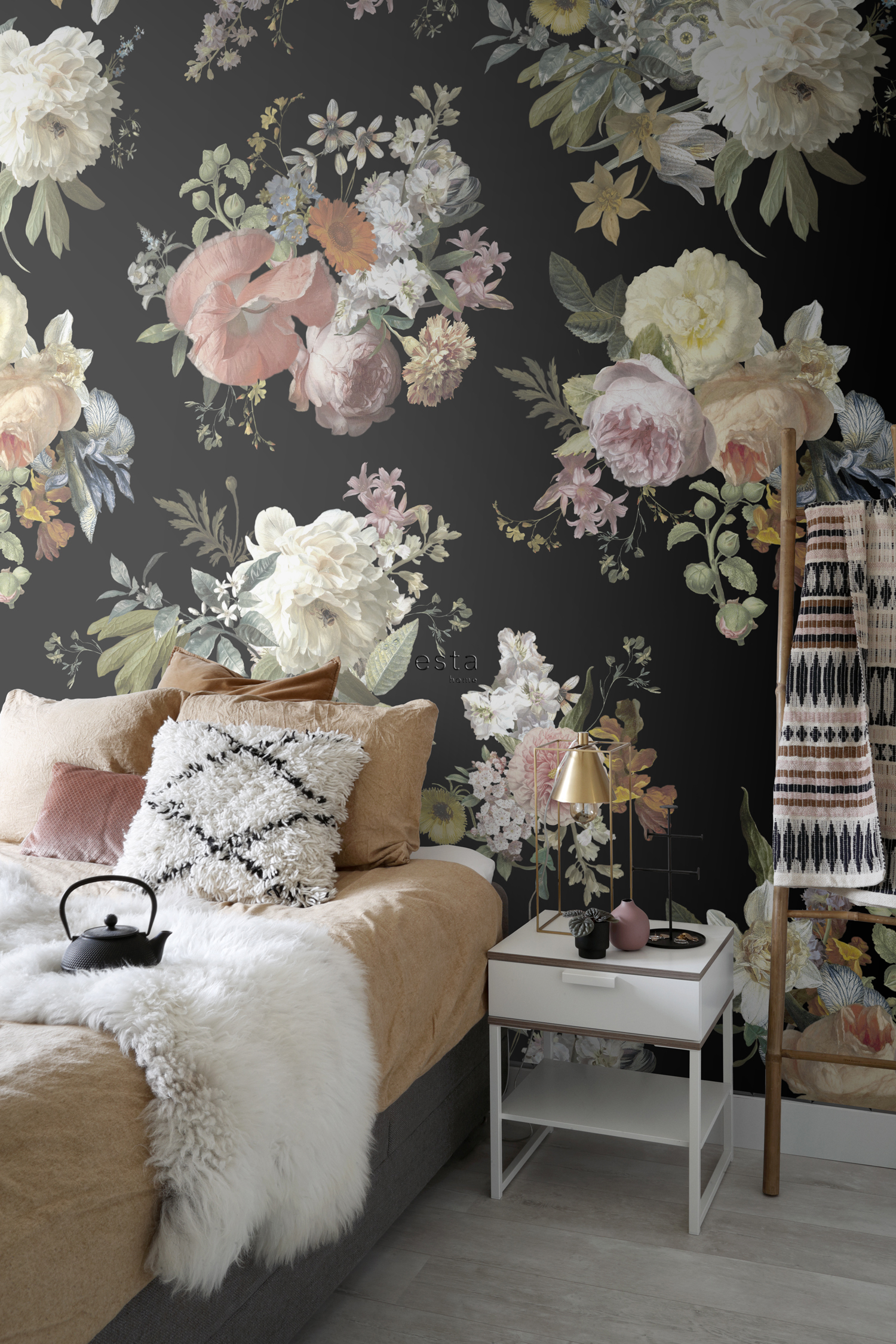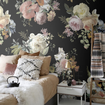 Vintage stílusú virágok (rózsák) emelkednek ki a sötét fekete alapszínből, mely drámai külsőt kölcsönöz a tapétának. A látványos, nagy virágos fotótapéta romantikája átjárja az enteriőrt.