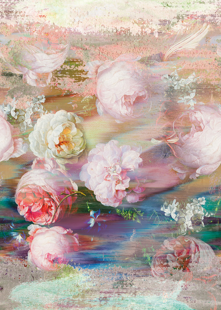 Vintage stílusú fotótapéta nagyméretű lila rózsavirágokkal. A fotótapéta sajátossága, hogy egymás mellé sorolható, így a minta illesztődik, és nagy felület tapétázására is alkalmas.