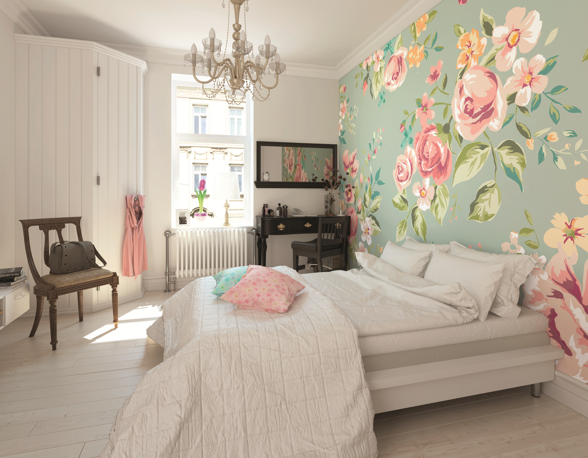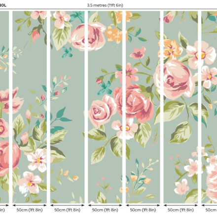 Romantikus hangulatot árasztó fotótapéta, melyet a vintage stílusban kedvelt rózsák dekorálnak.