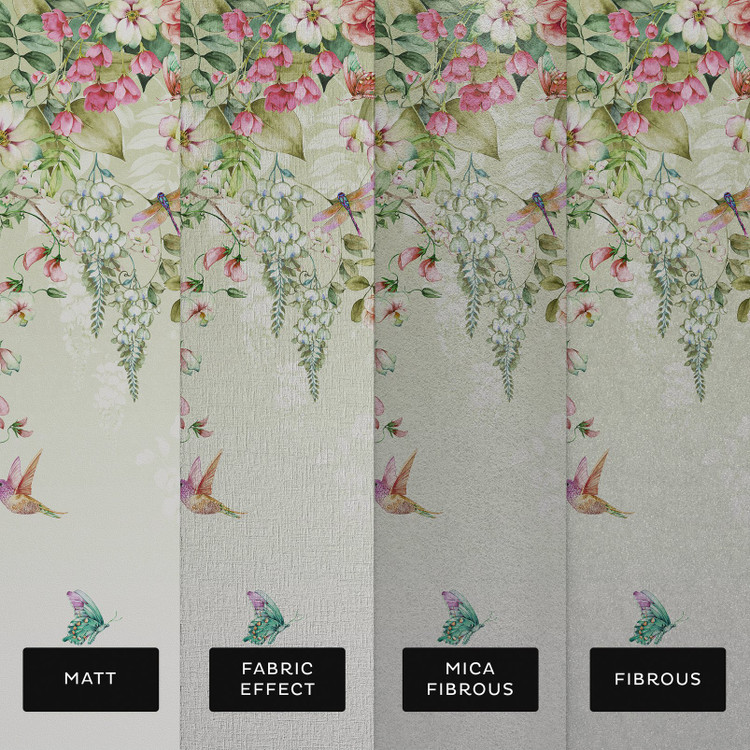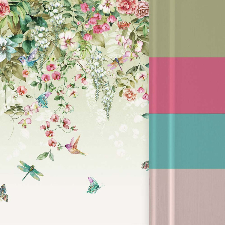 Romantikus virágos fotótapéta zöldes kék alappal, melyen a kolibrik és lepkék repkednek élénk színű virágok közepette. Élénk színeivel a fotótapéta üde frissességet, a tavasz szépségét hozza el otthonodba, hogy minden nap vidáman ébredj.