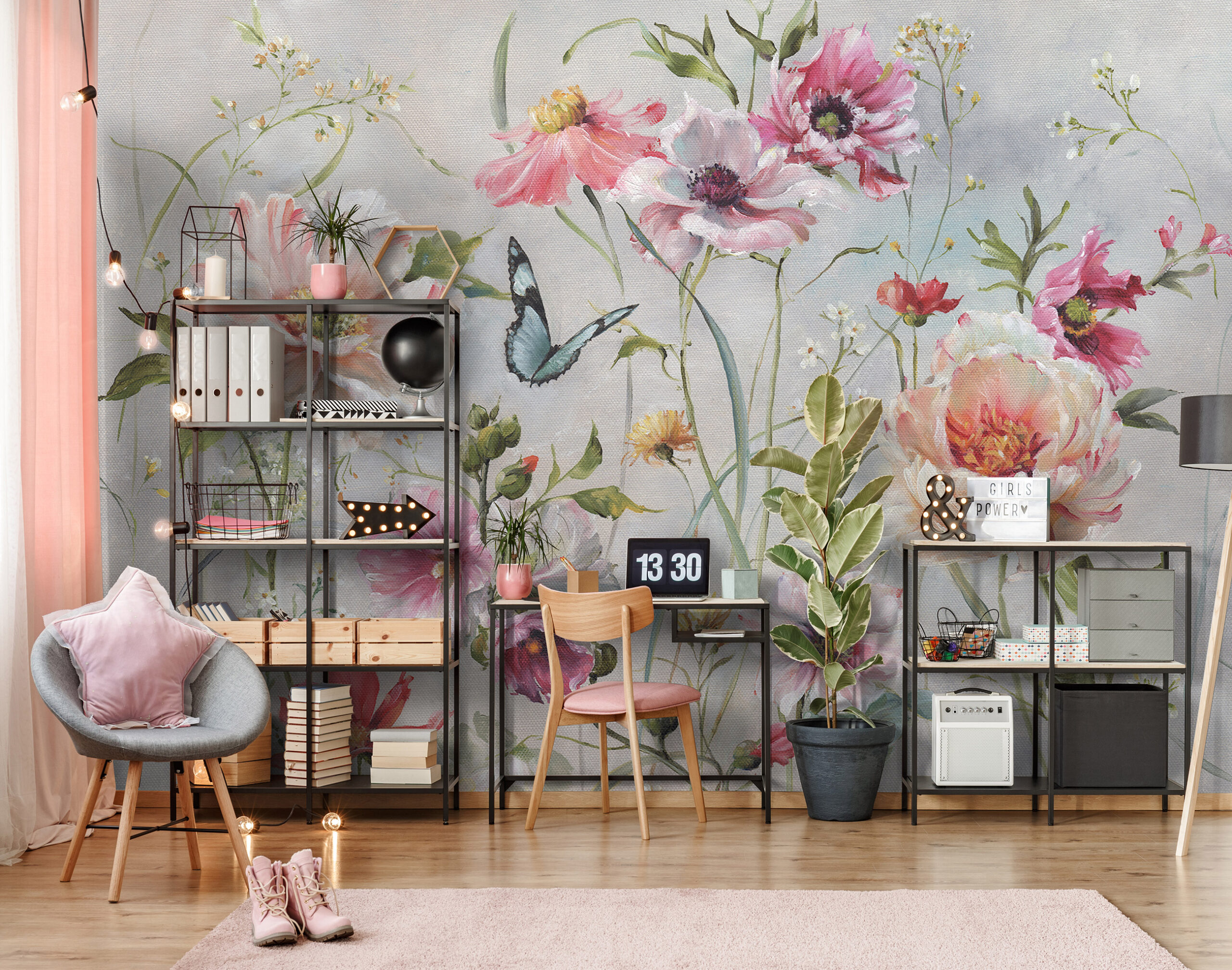 A tavaszi frissességet árasztó, színpompás virágok romantikus atmoszférát teremtenek a szobában. A fotótapétát különlegessé varázsolja a virágok mellett repkedő pillangó.