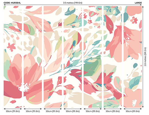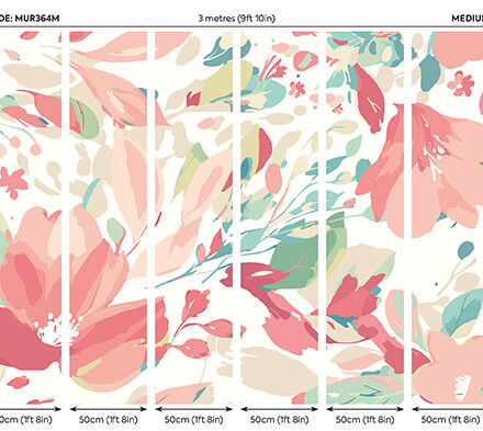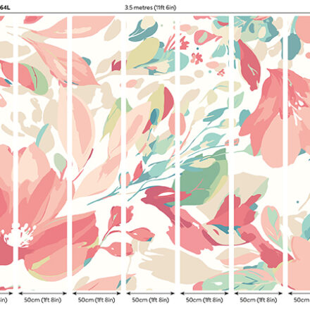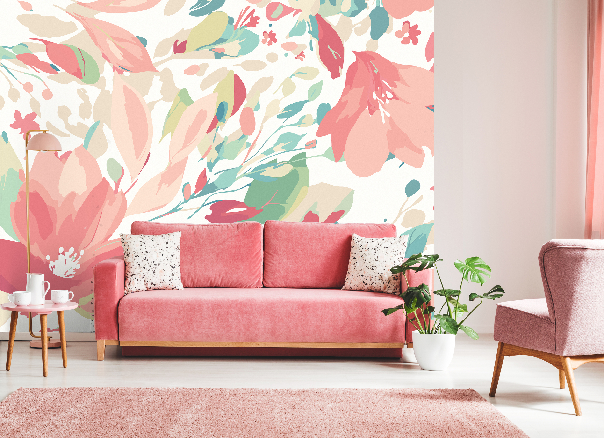 Rózsaszín akvarell virágos fotótapéta fehér alapon, melynek festői virágszirmai és levelei átszövik a tapétát. A virágok mellett megjelenő árnyékok dimenziót kölcsönöznek a mintának és izgalmasabbá teszik a romantikus képet.