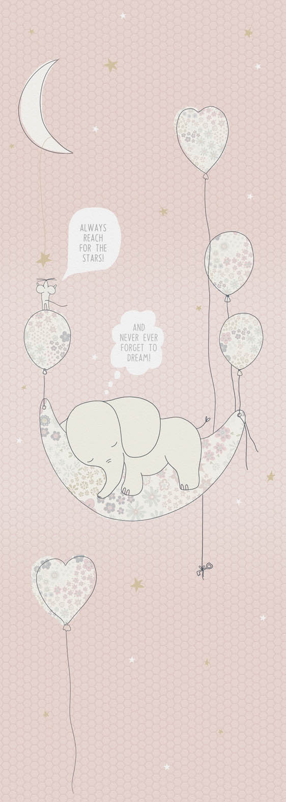 A poszter tapéta kiegészíthető egyszínű párjával, a Honey Stars Pink-kel, melynek segítségével nagyobb falszakaszt tudunk dekorálni.
