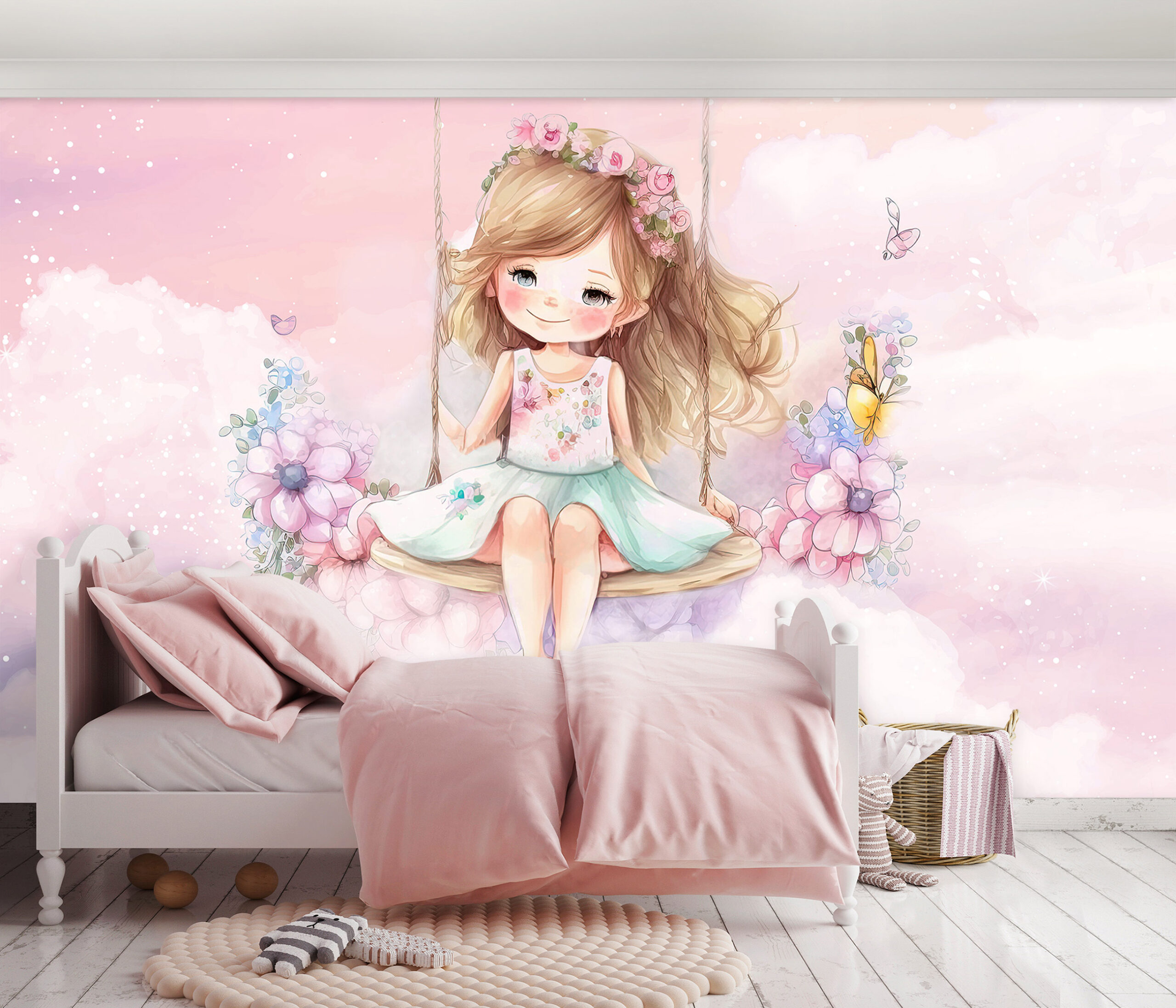 Kislány szobákba illő rózsaszínű fotótapéta, melynek bájos kislány ábrázolása vidám, boldog atmoszférát teremt a szobában.