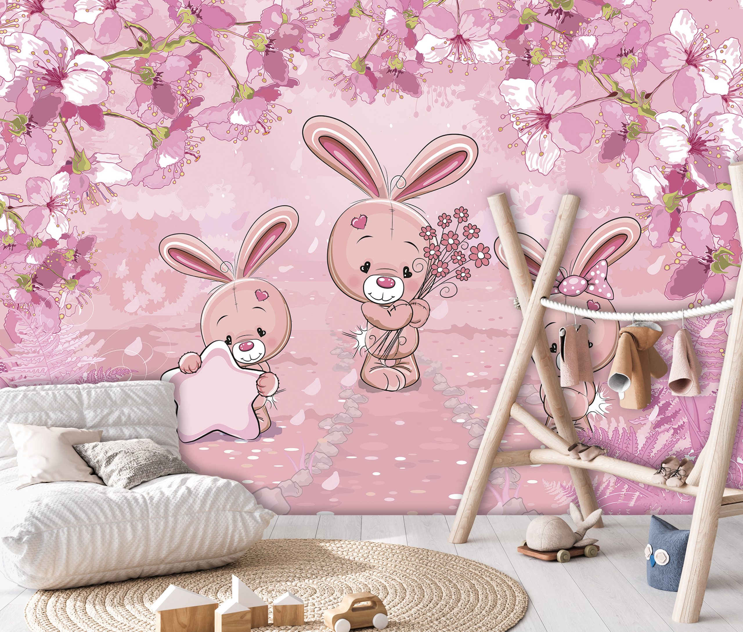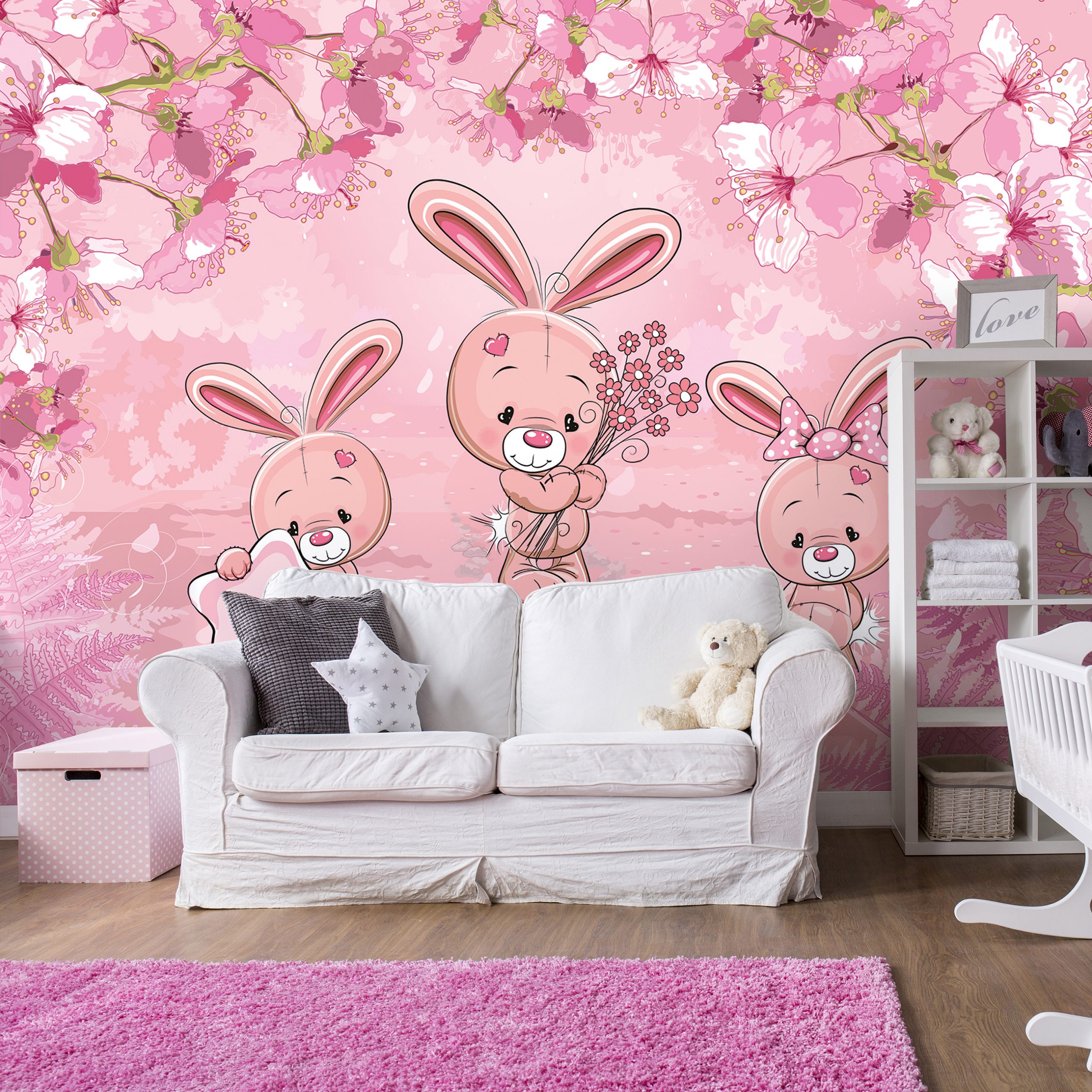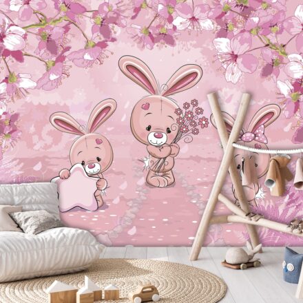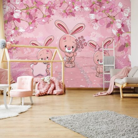 Kislány szobák csodás dekorációja az élénk rózsaszín árnyalatú fotótapéta, melynek báját a nyuszis figurák adják.