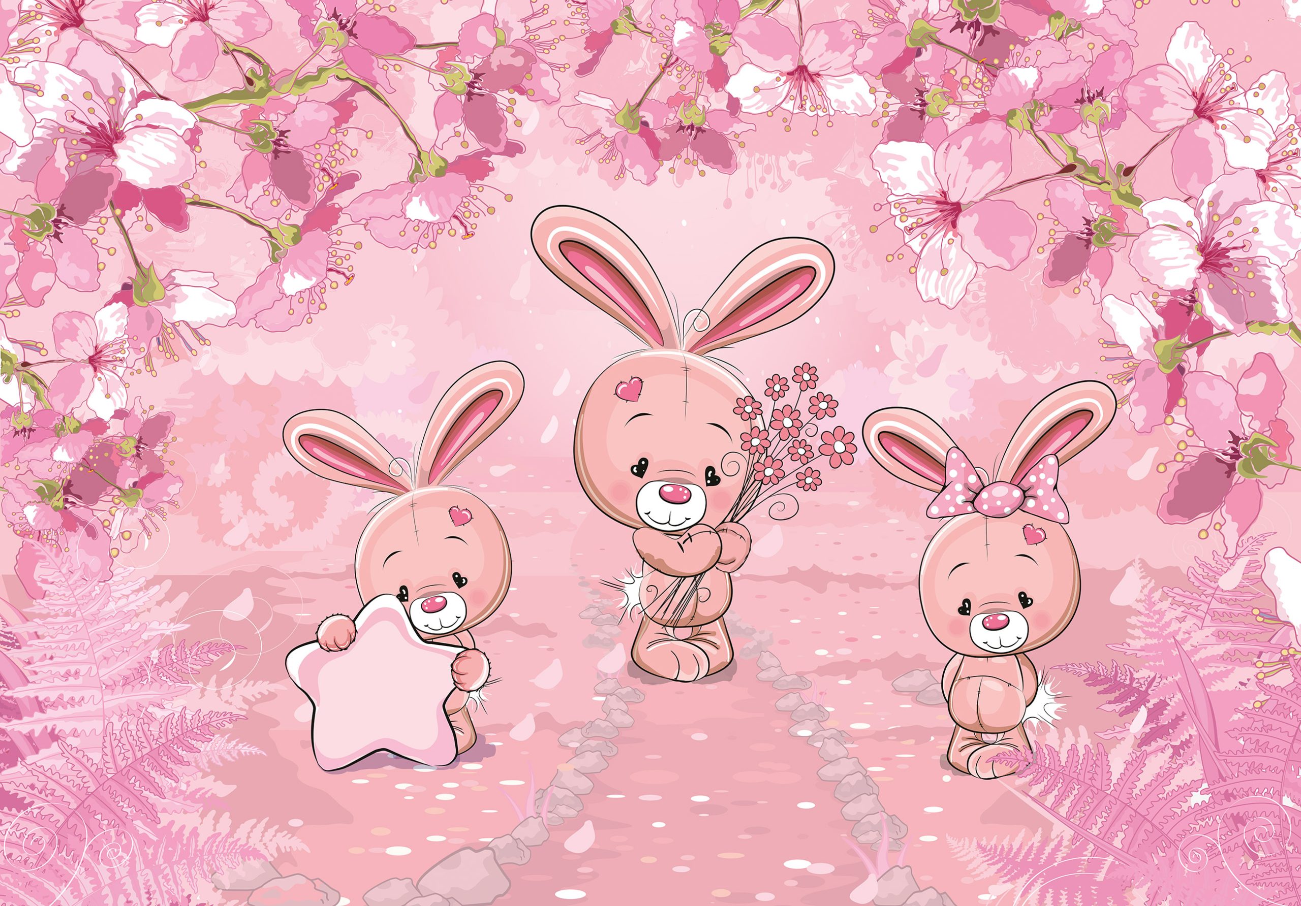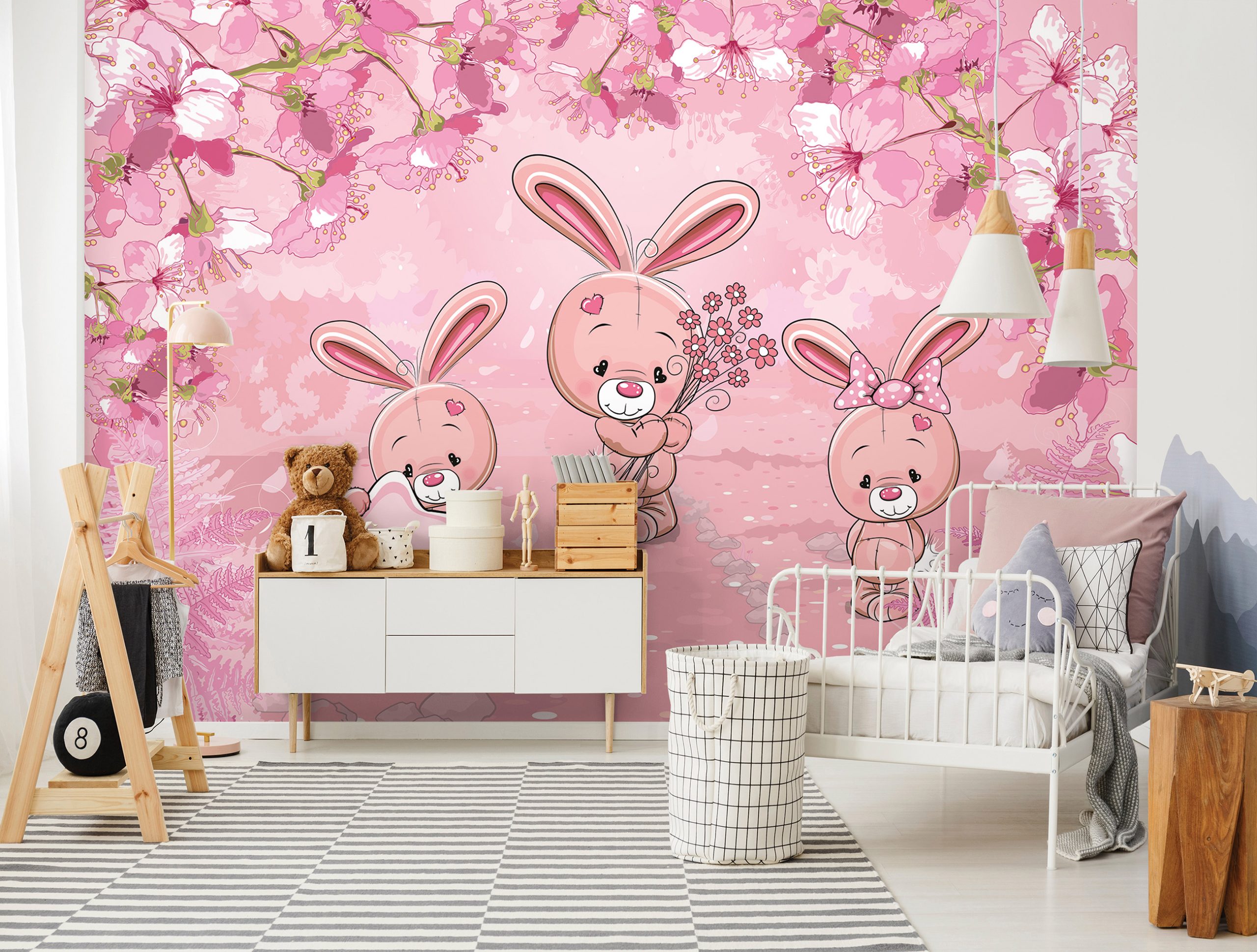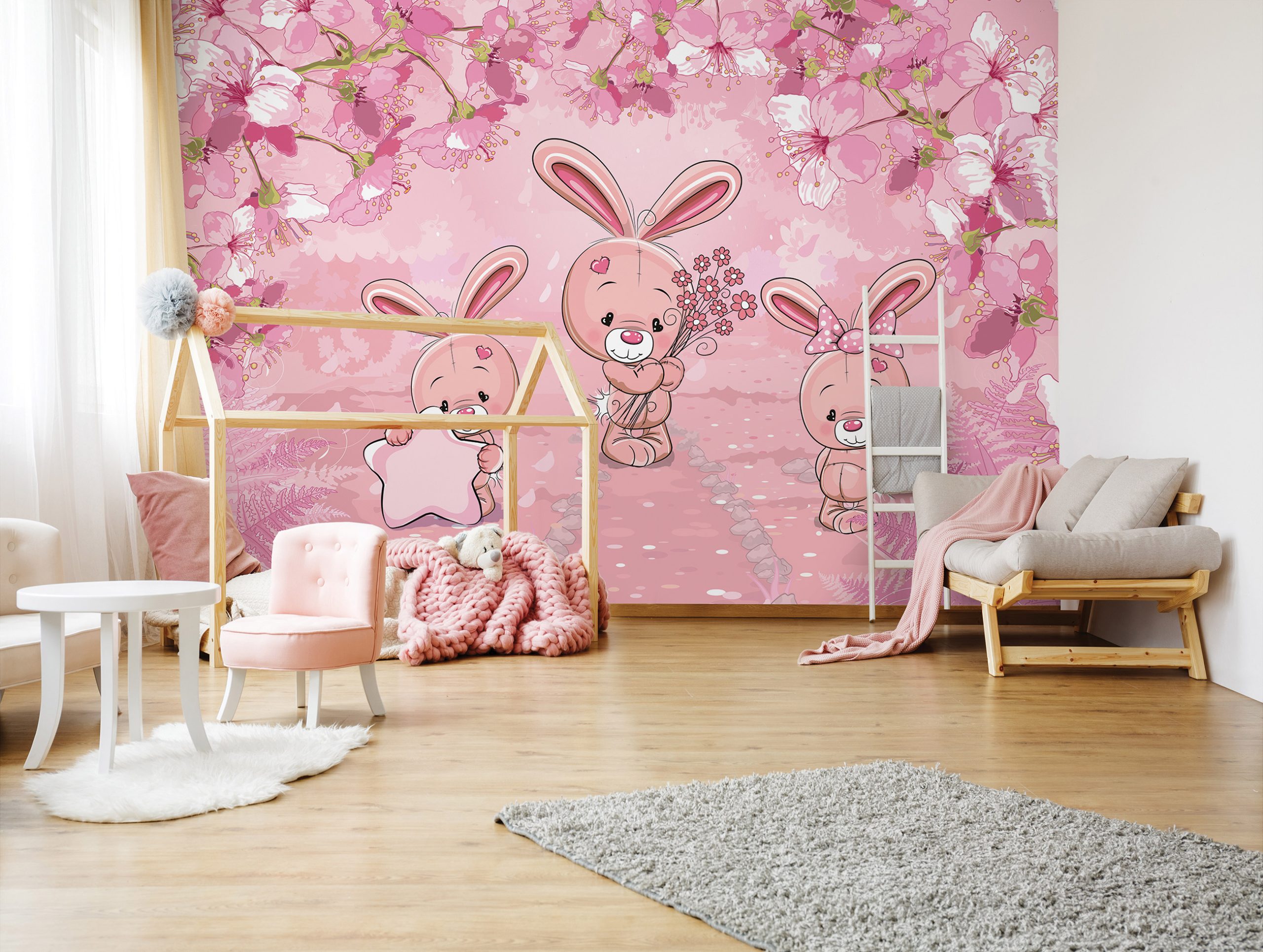 Kislány szobák csodás dekorációja az élénk rózsaszín árnyalatú fotótapéta, melynek báját a nyuszis figurák adják.