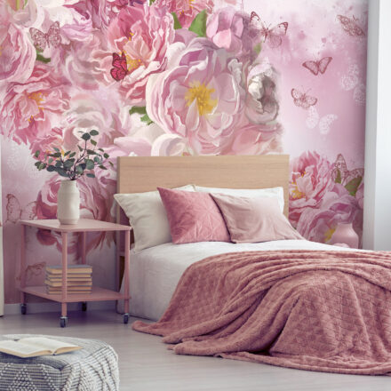 Rózsaszín romantikus fotótapéta virágokkal és lepkékkel. Ha egy igazán romantikus enteriőrt képzeltél el, ezzel a fotótapétával megadhatod a szoba alap hangulatát.