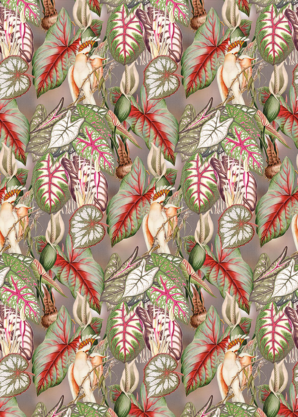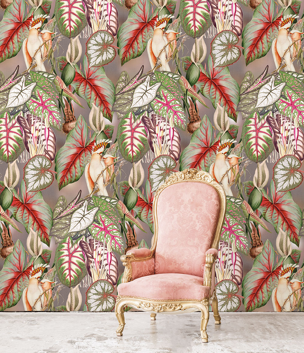 A nagyméretű pálmalevelek egzotikus jellegét a piros és lila színek használata csak fokozza. A dús növényzet képét megtörik a fenséges kakaduk képe. A fotótapéta sajátossága, hogy egymás mellé sorolható, így a minta illesztődik, és nagy felület tapétázására is alkalmas.
