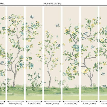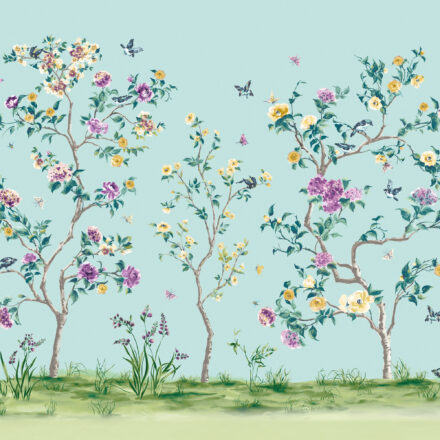 A keleti kultúrákból származó chinoiserie minta dekorálja a tapétát, melynek romantikus virágai között törékeny énekes madarak húzódnak meg.