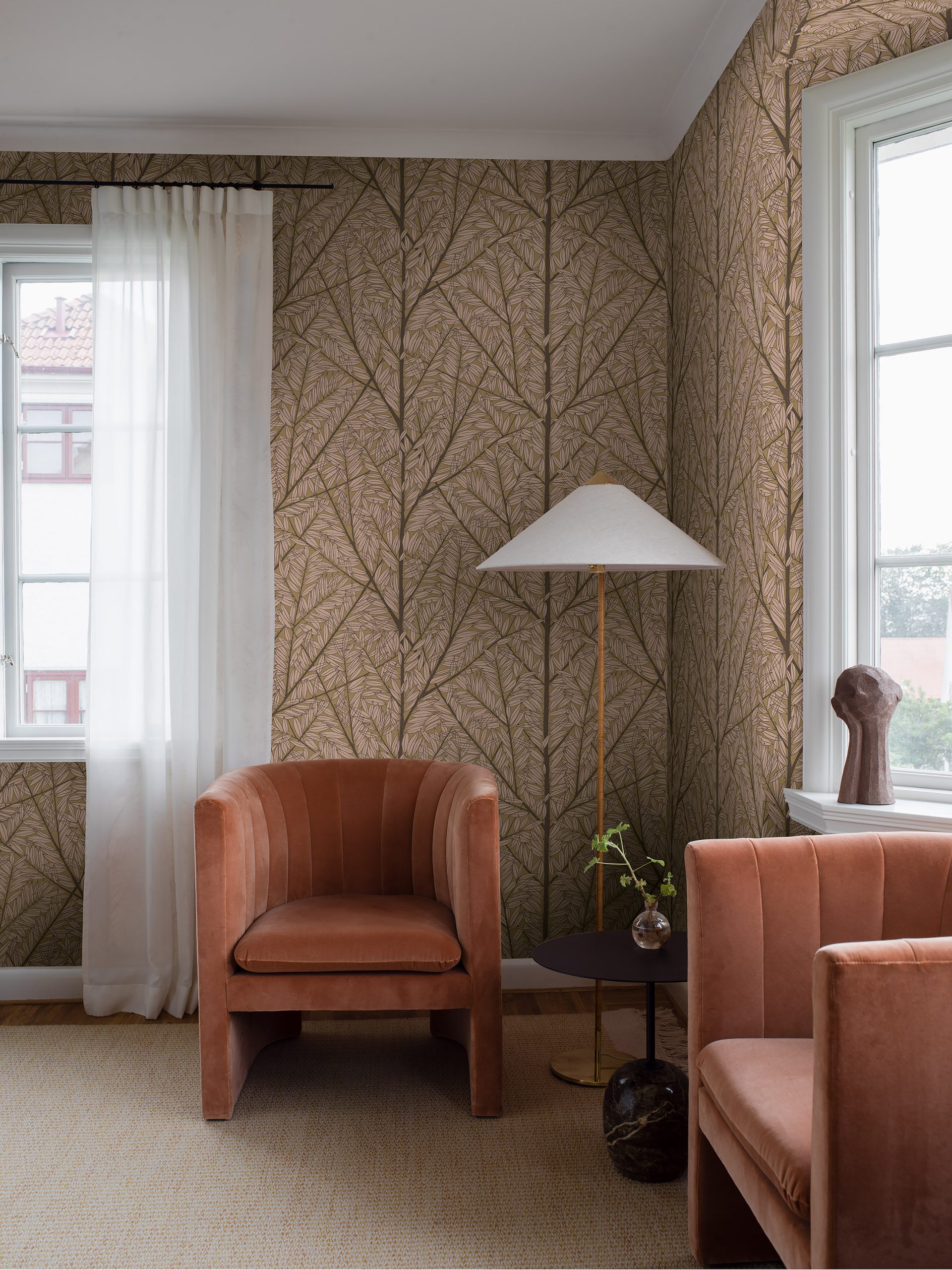 Skandi faág mintás fotótapéta sárga alappal, melyen a levelek púder rózsaszín árnyalatban jelennek meg. A skandináv stílust kedvelők számára ajánljuk a fotótapétát, hiszen természetközeli mintájával otthonos hangulatot teremt az enteriőrben.