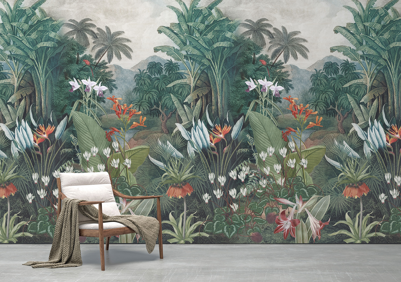 Egzotikus tájkép nagyméretű pálmafákkal és pompázatos virágokkal. Fantasztikus látvány, különleges hangulat. Formáld át Te is otthonod terét!