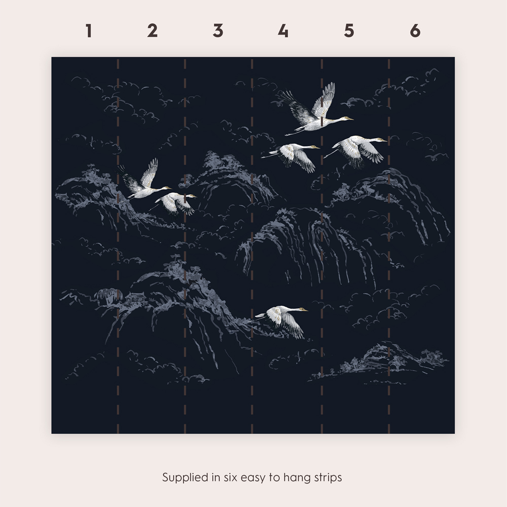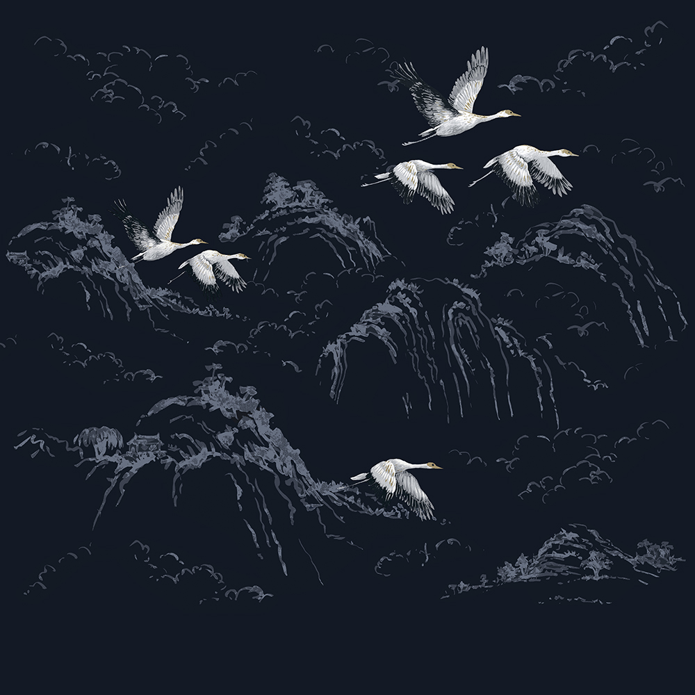 Laura Ashley brandjére az angolos stílus, az erőteljes színek, klasszikus virág minták használata jellemző. Drámai szépségű, sötétkék tapéta, melyen a keleties stílust idéző darumadarak repte látható.