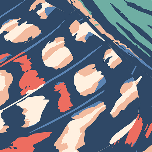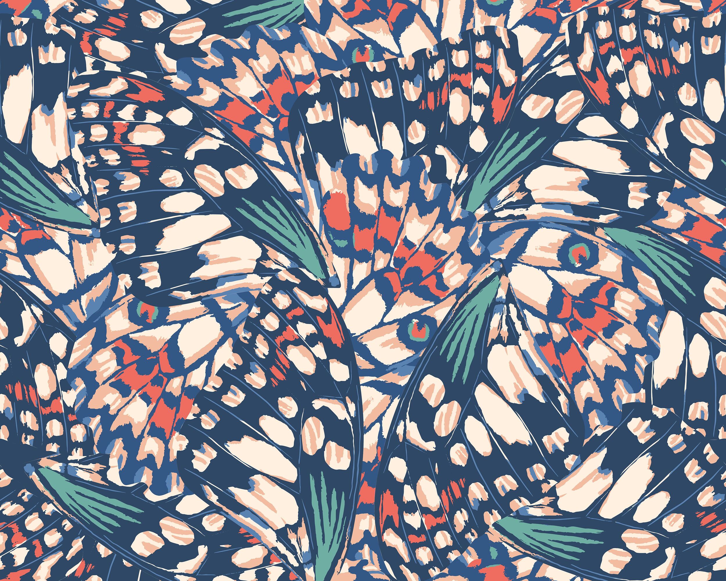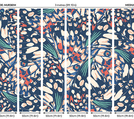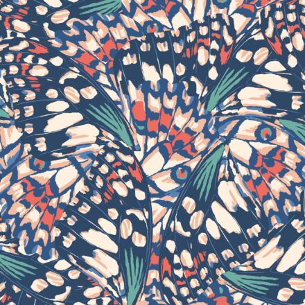 Sötétkék – korall fotótapéta absztrakt lepkeszárnyak mintájával, melyet színes pontok és vonalak alkotnak meg. A gyönyörű pillangószárnyakat ebben a részletgazdag motívumban olyan optikai illúziót teremt, mely lenyűgöző látványt és hangulatot alkot a térben.