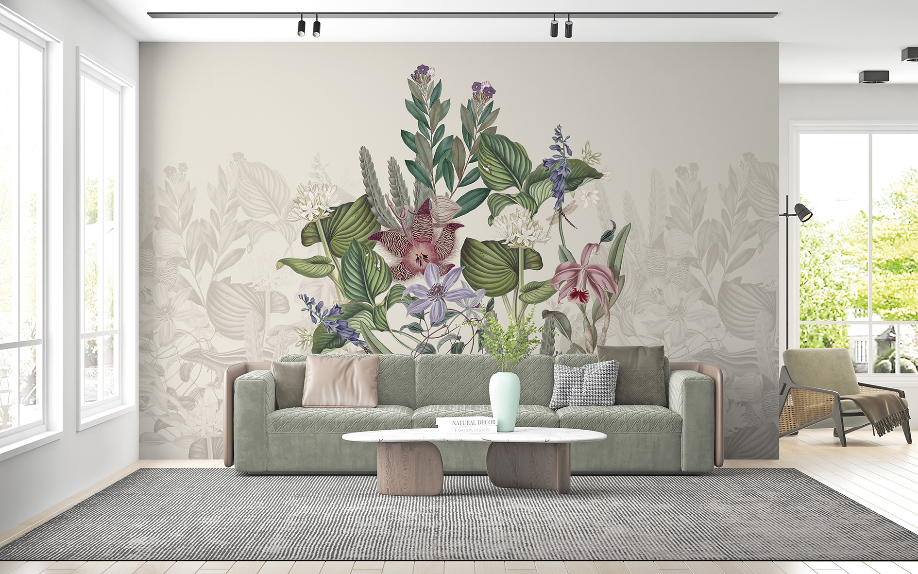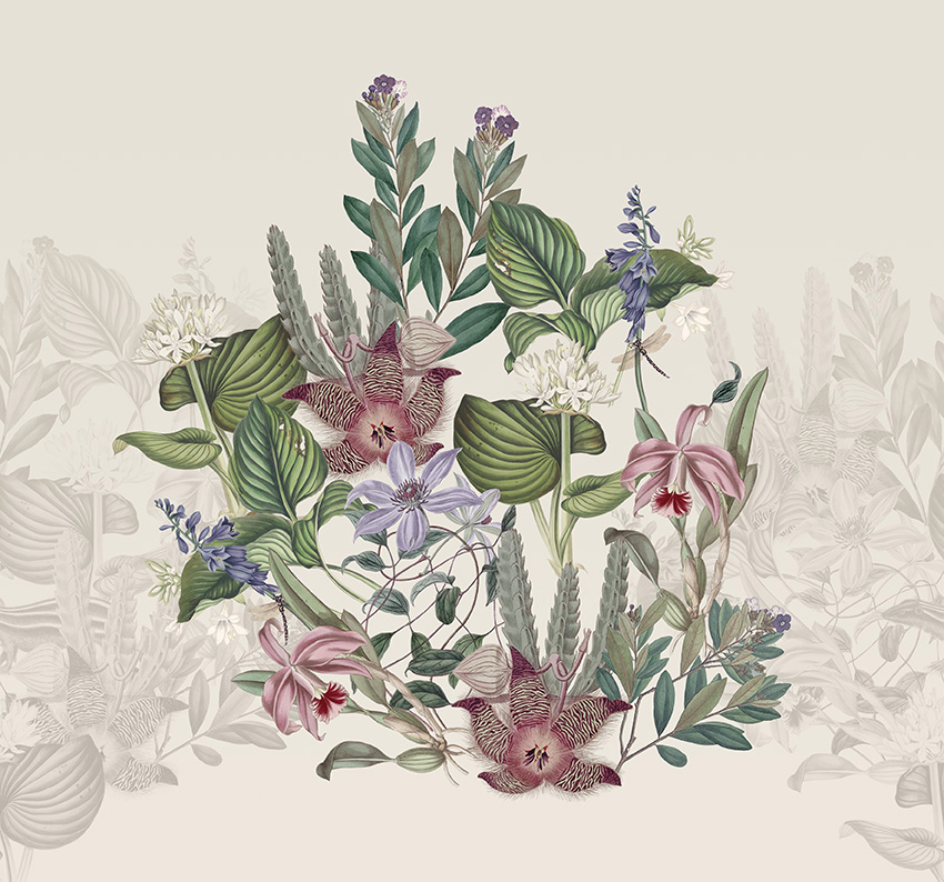Egzotikus növényekből álló kompozíció kápráztatja el szemünket a fotótapétán.
