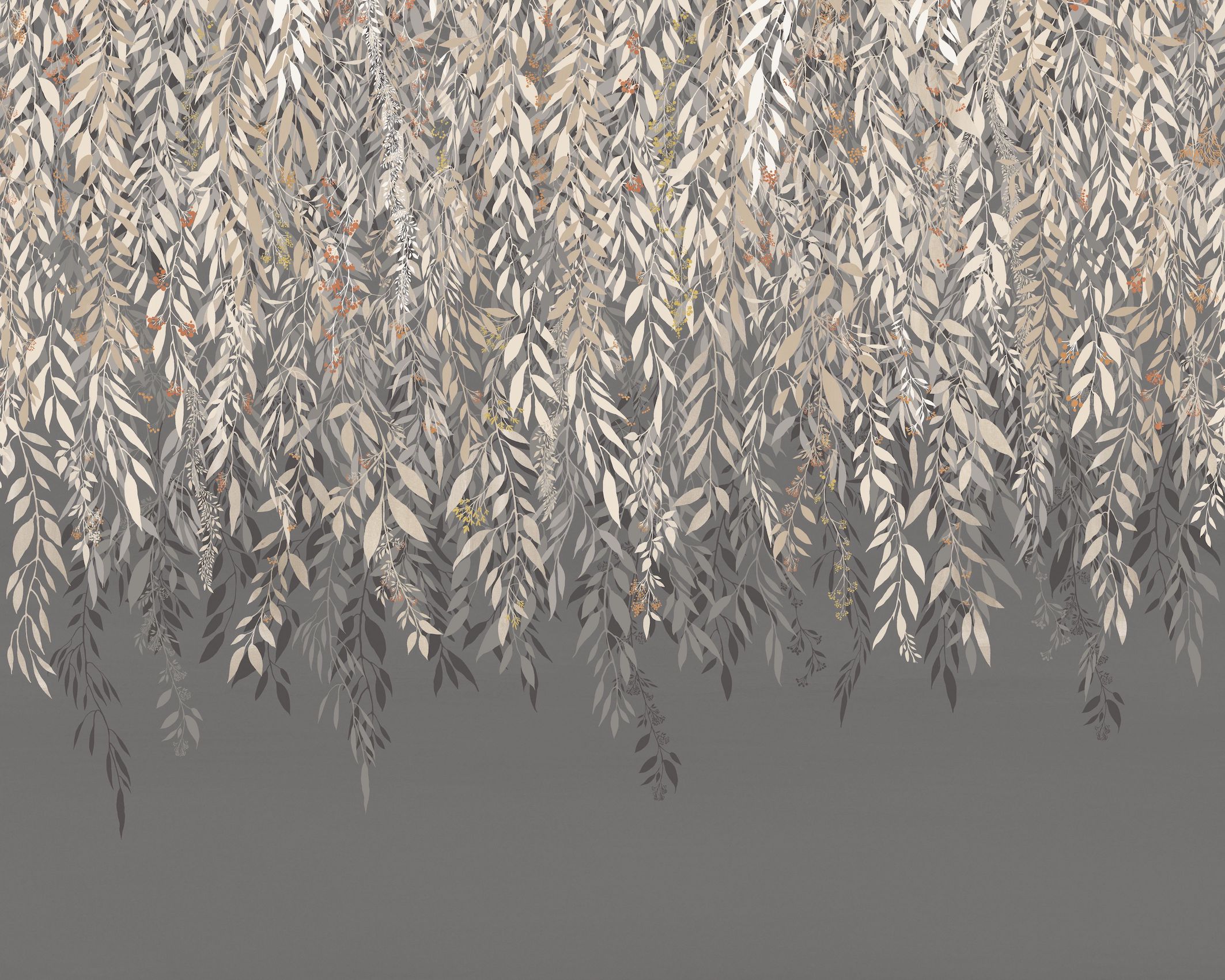 Lágyan leomló levélmintát ábrázoló fotótapéta, melynek kecses ágai több rétegben, egymásba fonódva hullanak lefelé a mennyezetről.