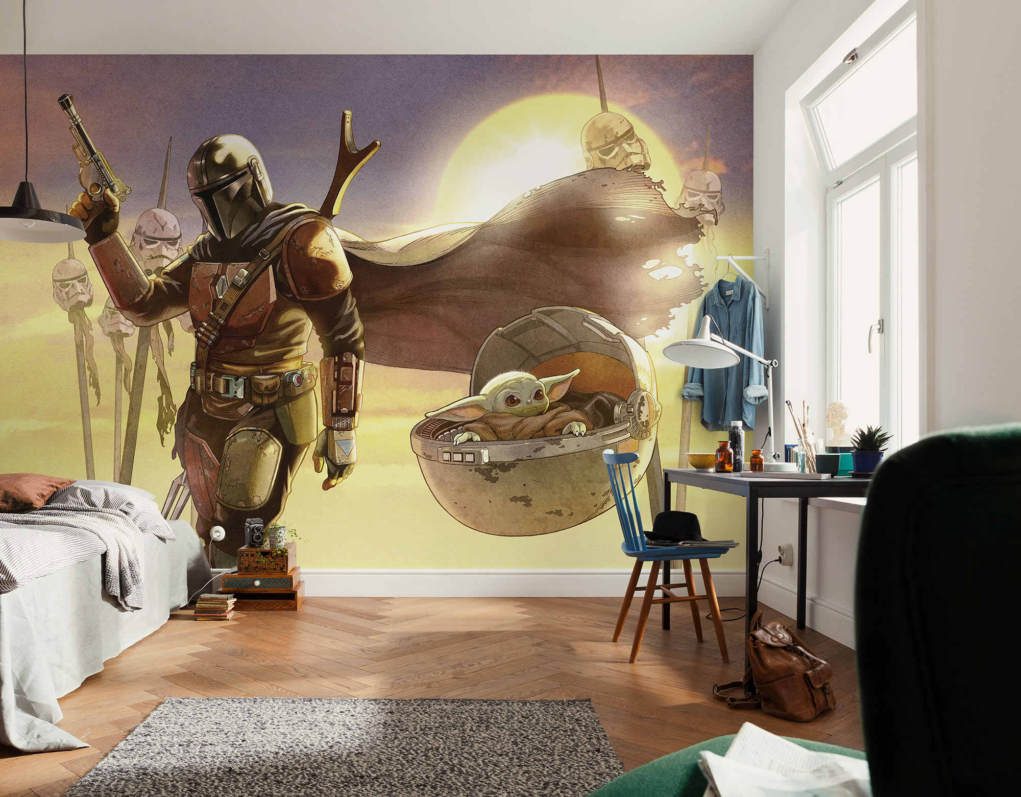 Star Wars Mandaloriai fotótapéta, amely a sorozat két legikonikusabb szereplőjét – a páncélos Mandalorit és a bájos Grogut – örökíti meg egy lenyűgöző, meleg fényekkel átitatott jelenetben. A lebukó nap fénye drámai hangulatot kölcsönöz a jelenetnek, miközben a kietlen táj a végtelen galaxis veszélyeit és szépségét idézi. A Mandalori karaktere magabiztosságot és védelmet sugall, míg Grogu jelenléte ártatlanságot és reményt hoz a komor háttérbe. Egy igazán különleges darab minden rajongónak, akik szeretnének egy kis Star Wars-mágiát csempészni otthonuk falára.